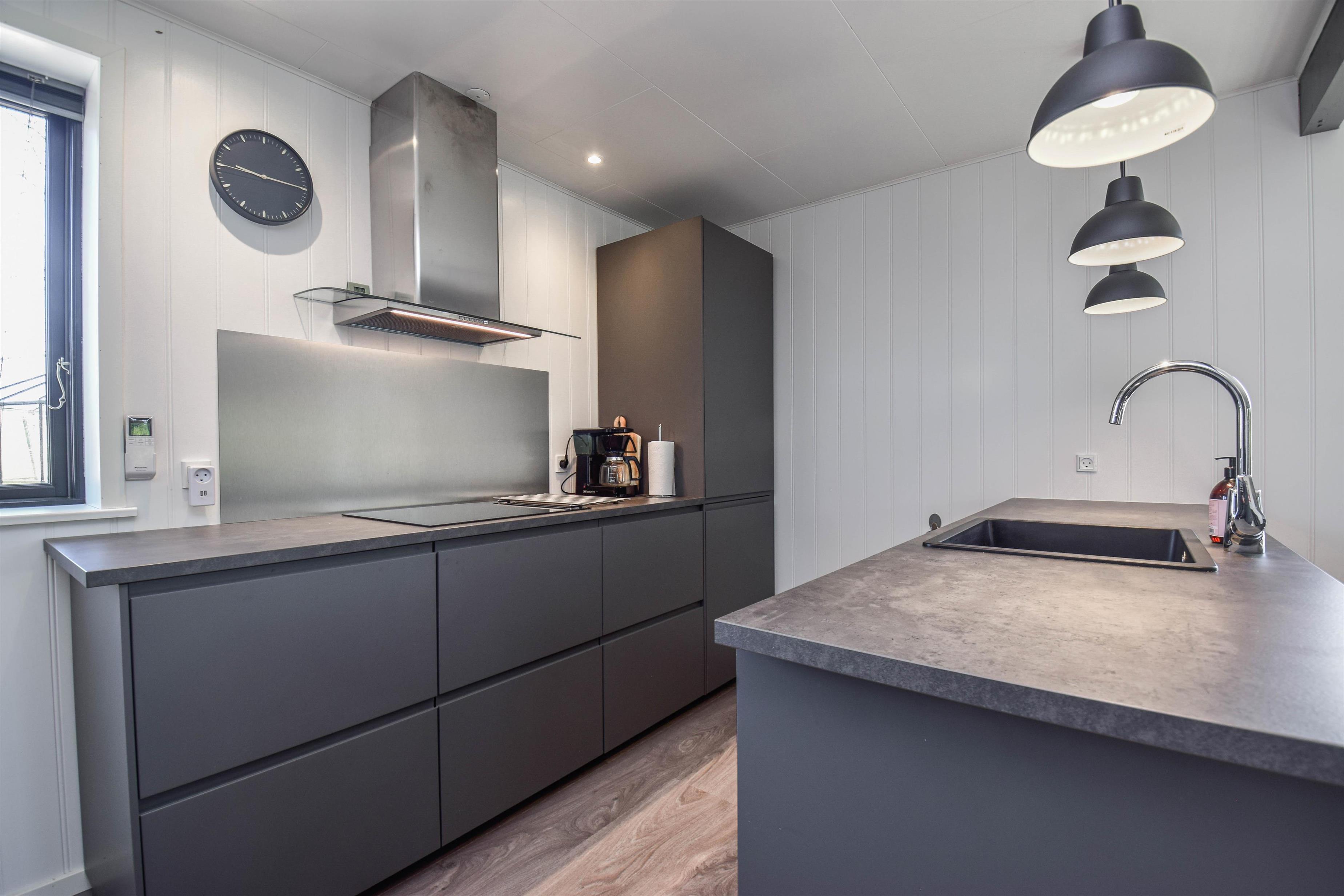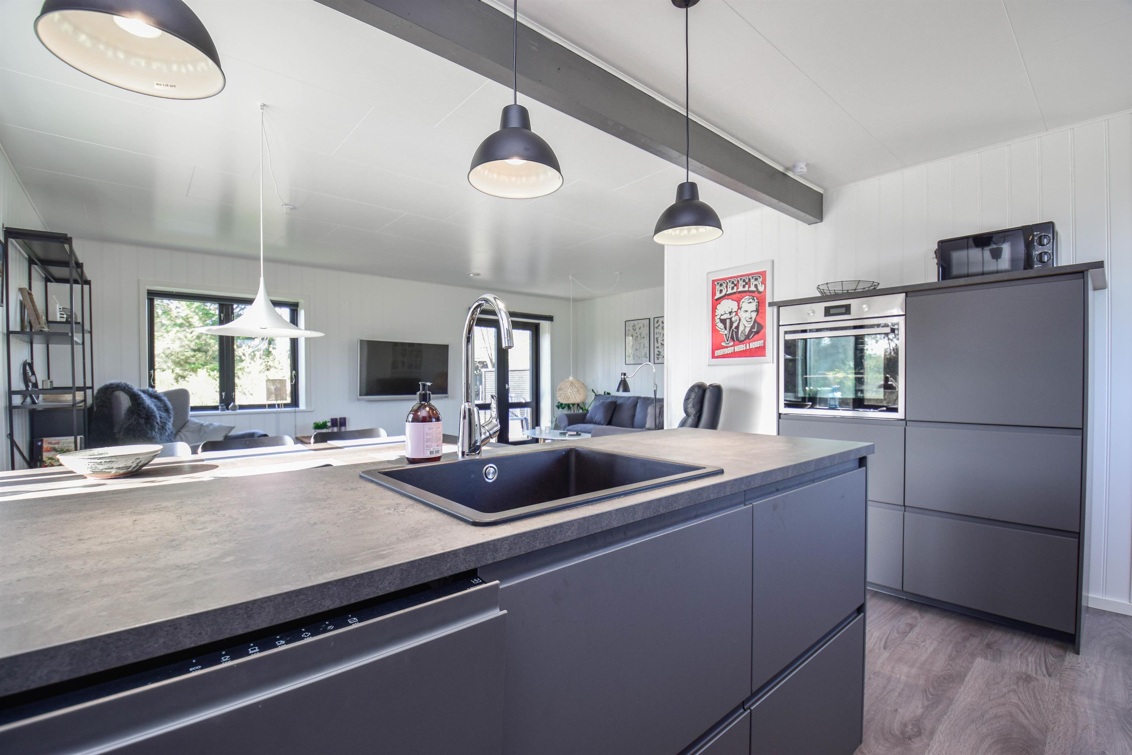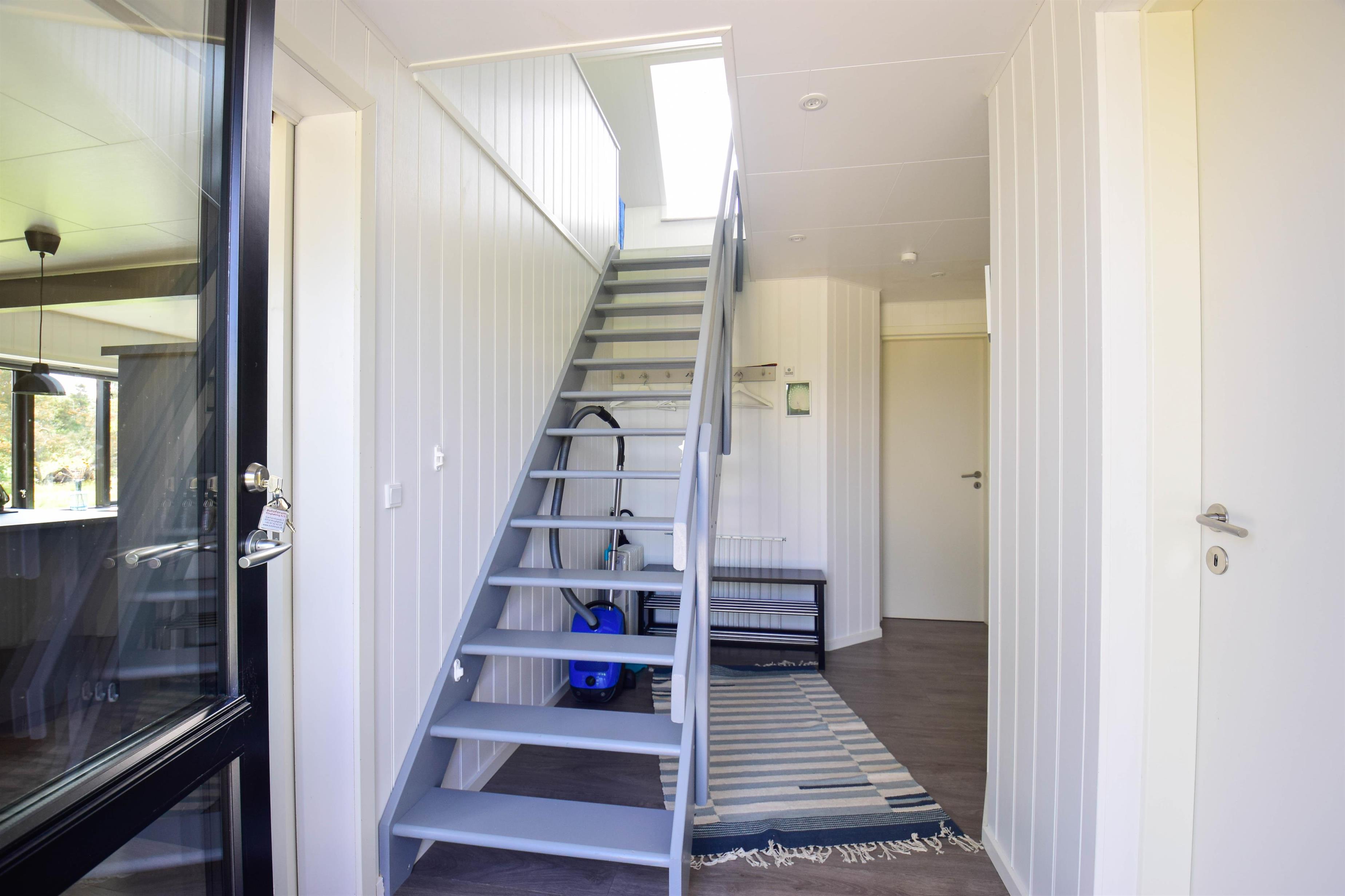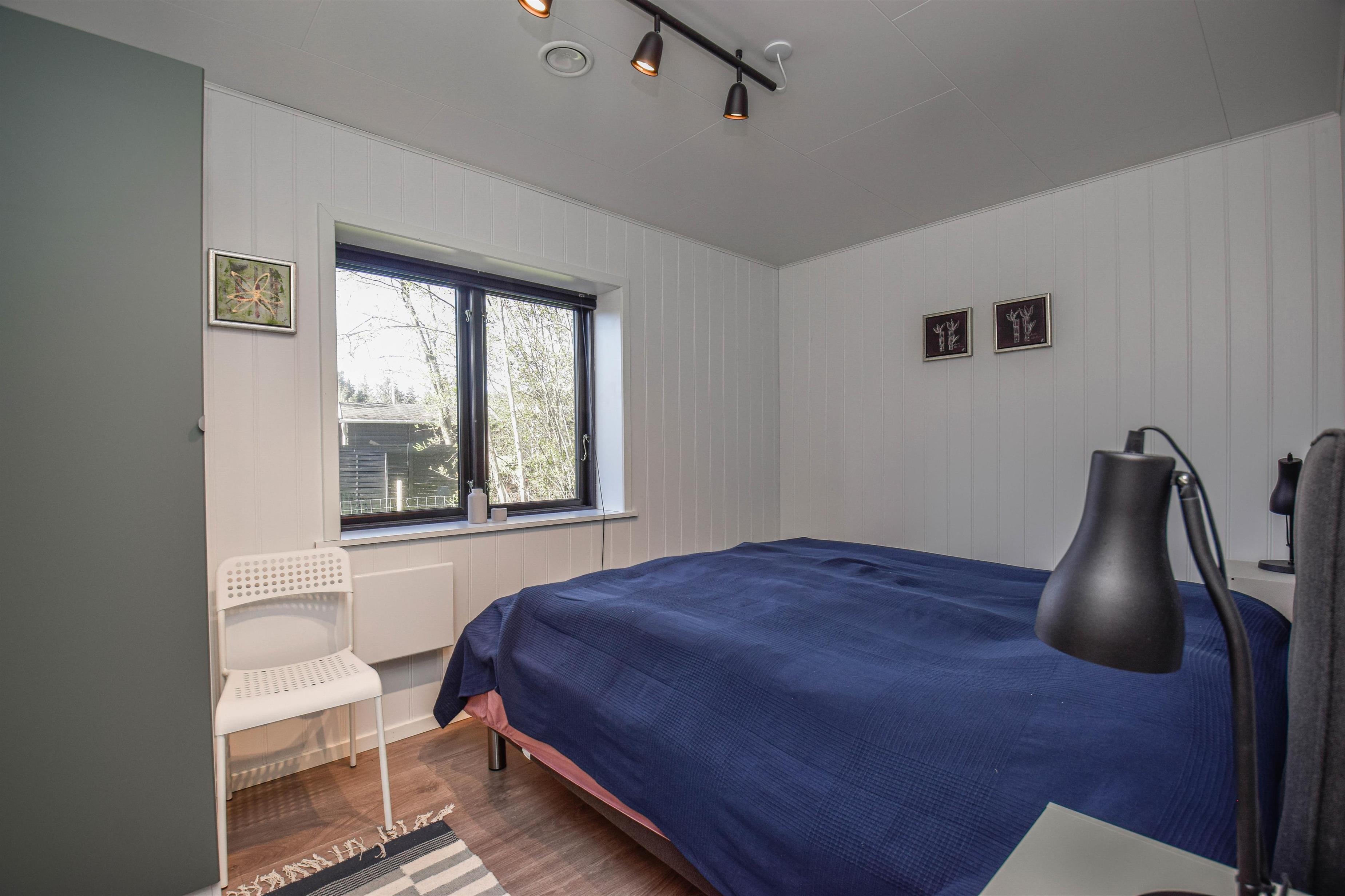 Stueplanen er indrettet med entre med god plads til sko og overtøj. Huset har to værelser begge med faste skabe og en god dobbelt seng. I badeværelset er der er gulvvarme, vaskemaskine og bruser. Husets køkken er i åben forbindelse med stuen, her er der varmepumpe, sofagruppe og udgang til en dejlig terrasse. I haven er der ligeledes adgang til en skøn pavillion, hvor der kan hygges og slappes af
