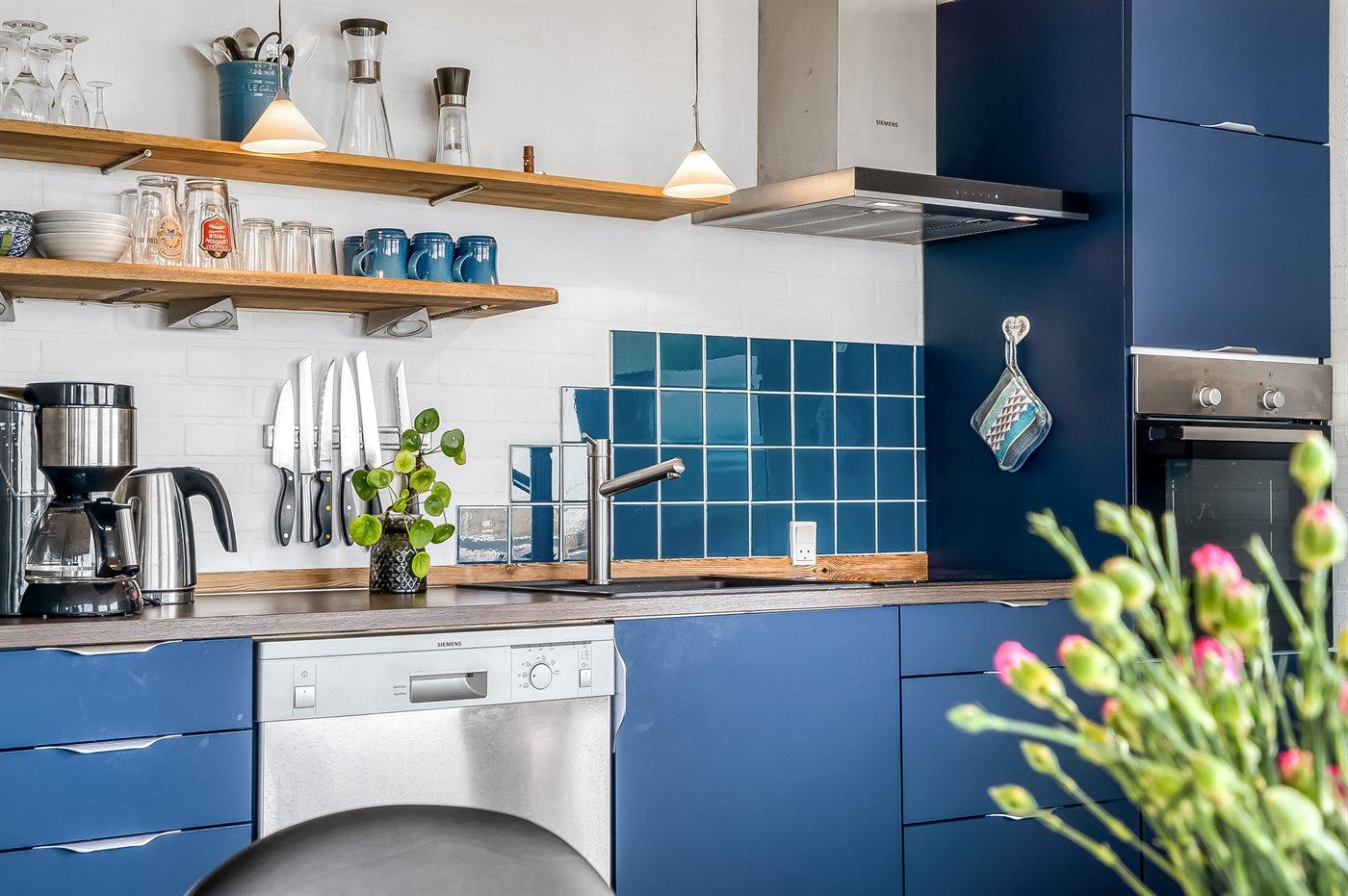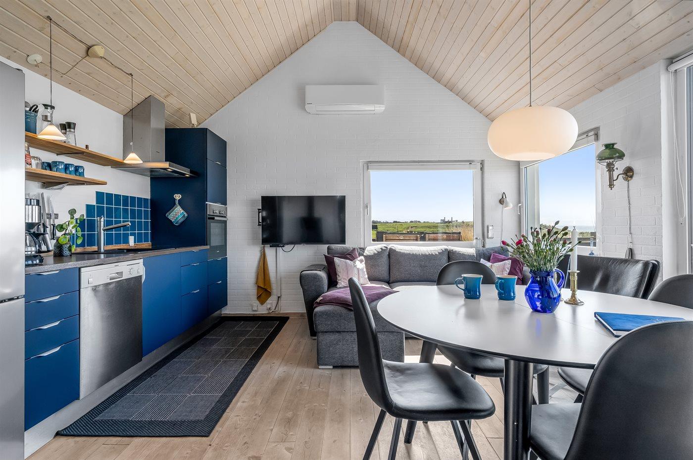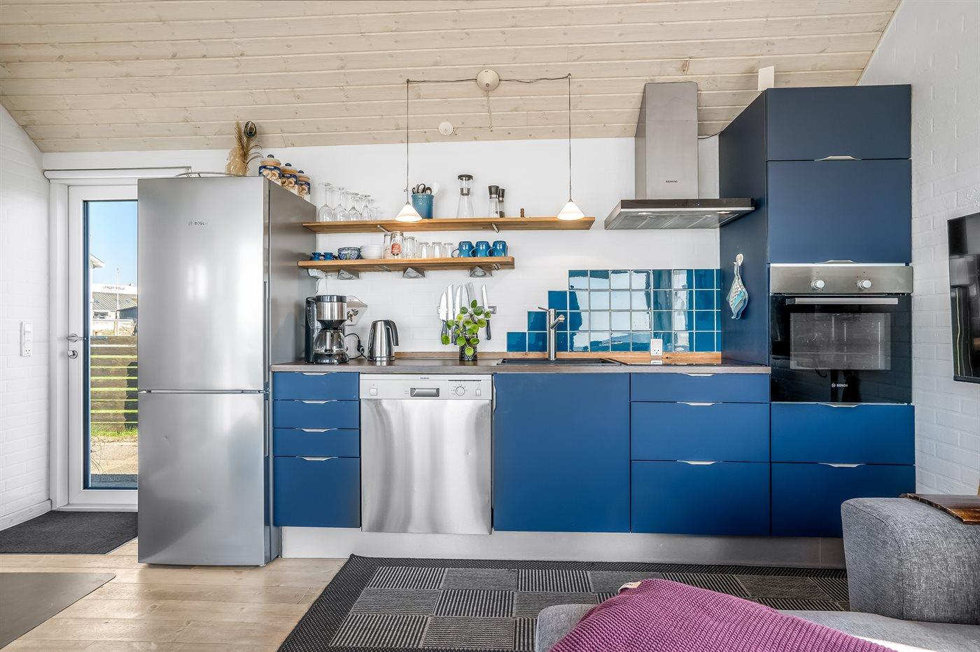 Køkkenet er udstyret med 1 køleskab. Der er 4 keramiske kogeplader, varmluftovn, mikrobølgeovn samt opvaskemaskine.