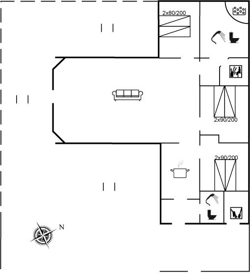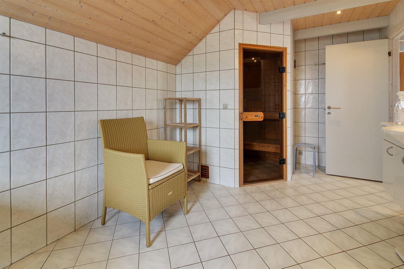 Der er 2 badeværelser med bruseniche og 2 toiletter. Der er gulvvarme på 1 badeværelse. I saunaen er der mulighed for afslapning.