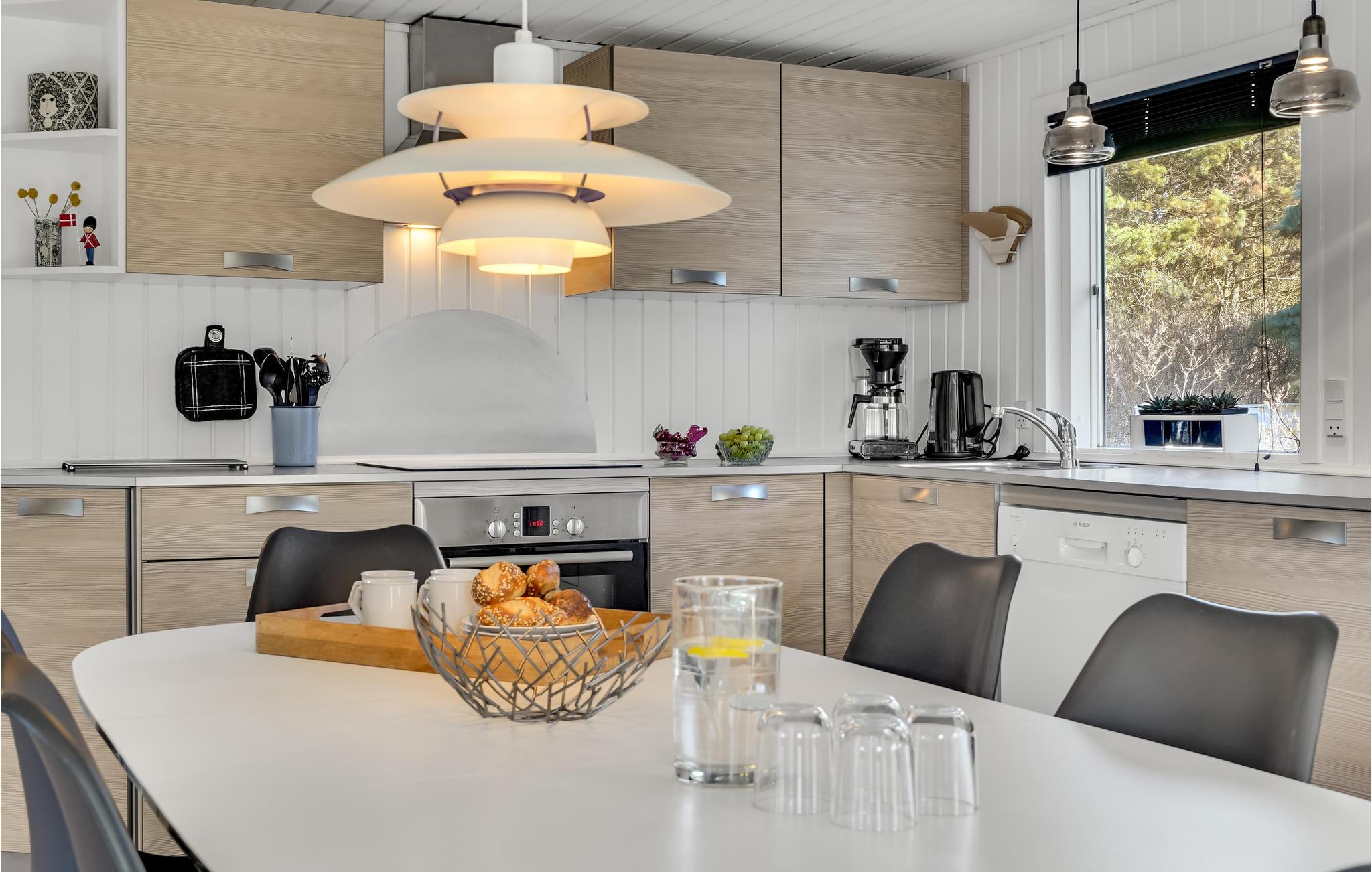 Huset er indrettet med fire soveværelser, hvoraf det ene har adgang til eget toilet. Hertil kommer et køkken/stueområde med smuk udsigt til Lyngvig Fyr, dejligt badeværelse med både brus og spabad, samt en stor ekstra stue. Der er desuden installeret fibernet, så I kan snildt medbringe den bærbare på ferien.