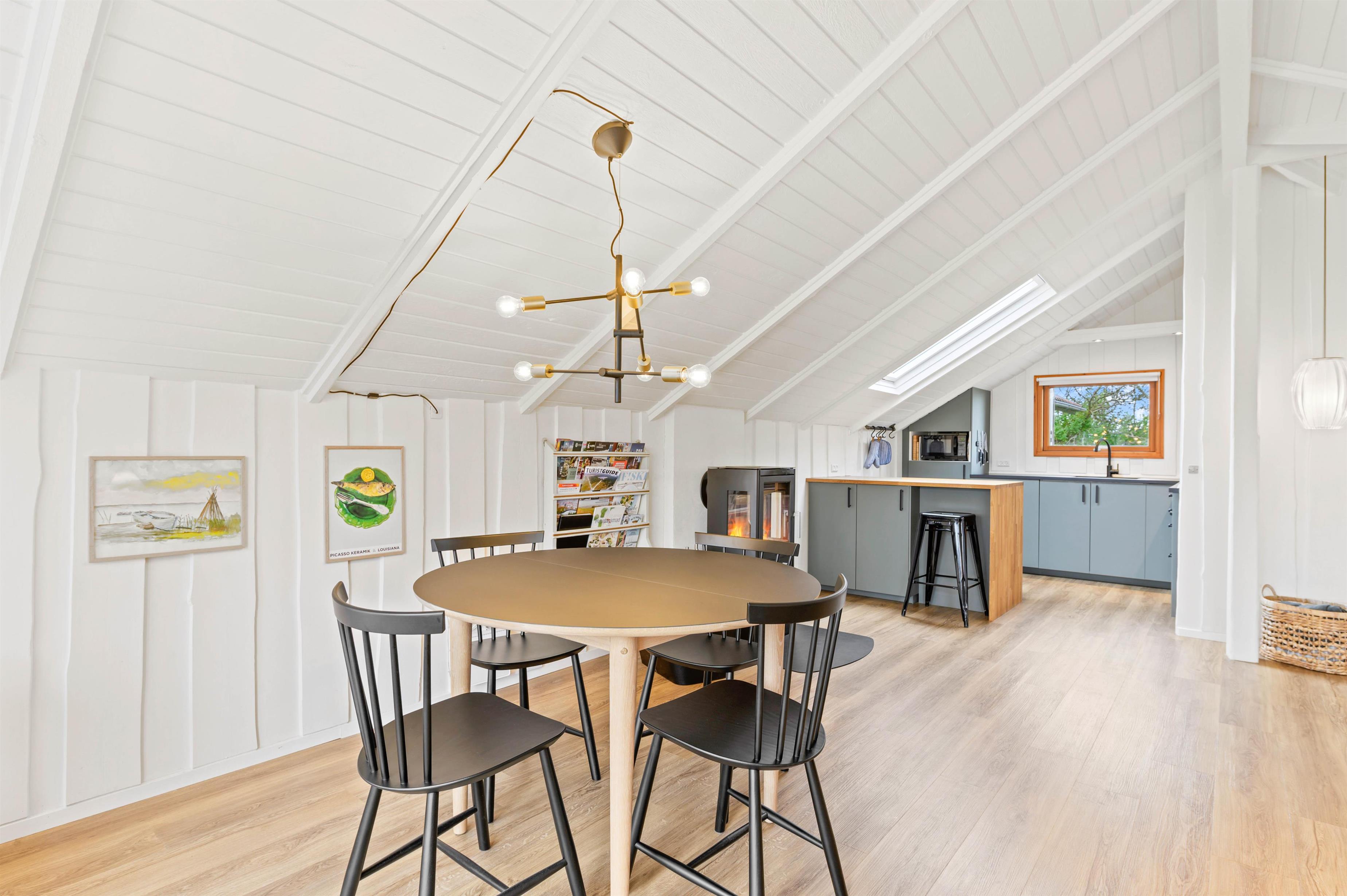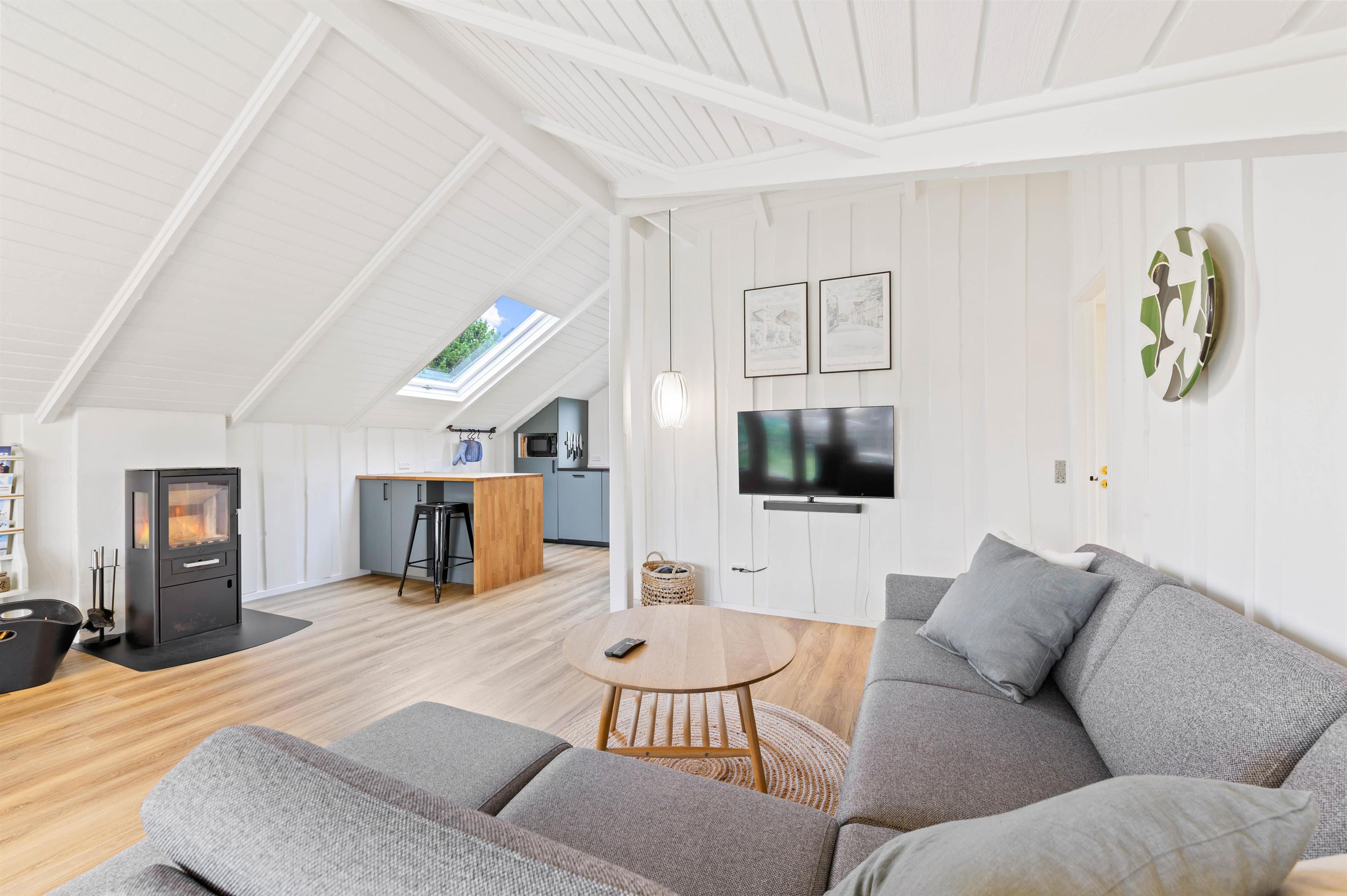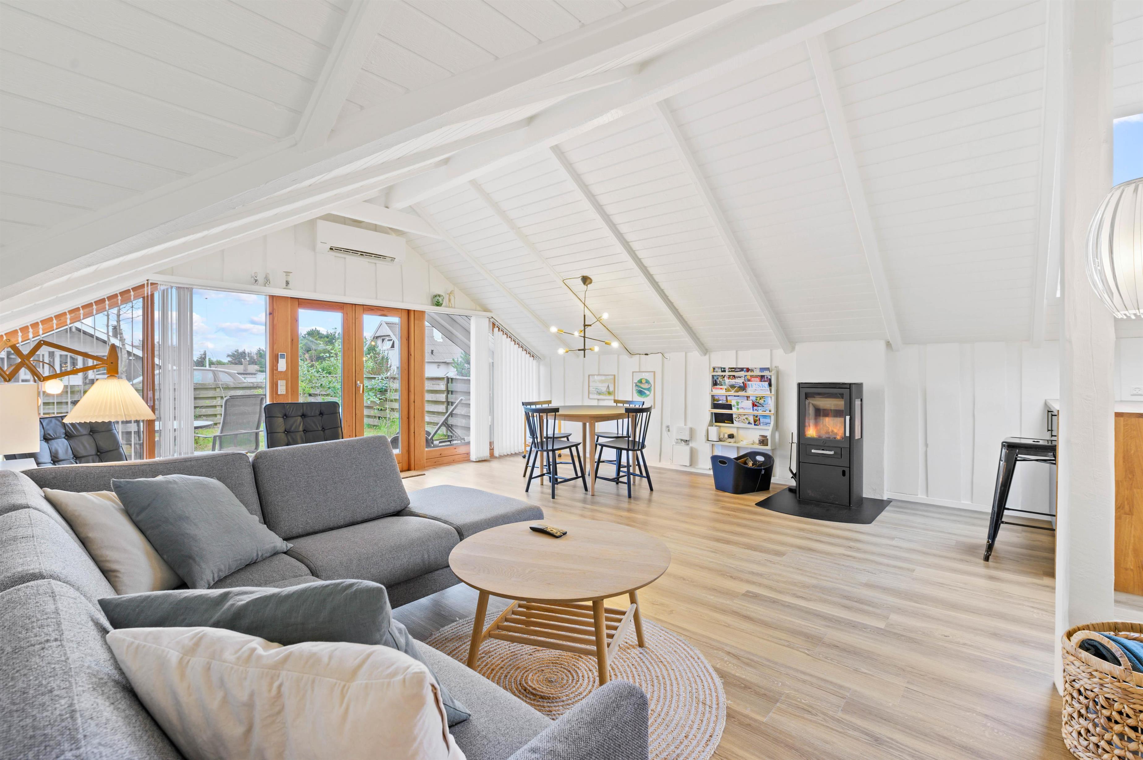 I alrummet er der desuden en brændeovn, der med sin varme og knitren i baggrunden fuldender den hyggelige feriestemning. Derudover er der en varmepumpe i feriehuset, der sørger for et godt indeklima på energivenlig vis.