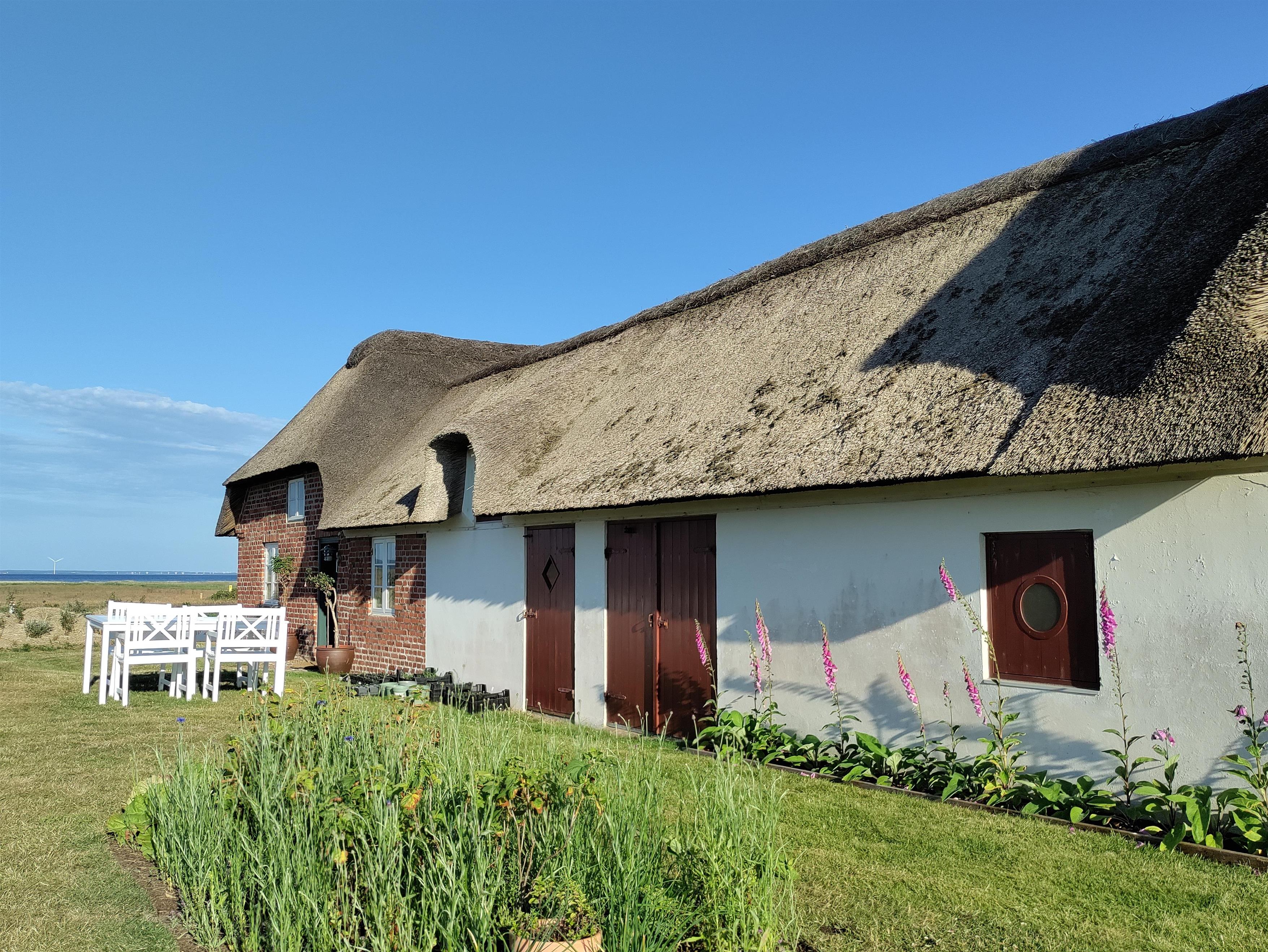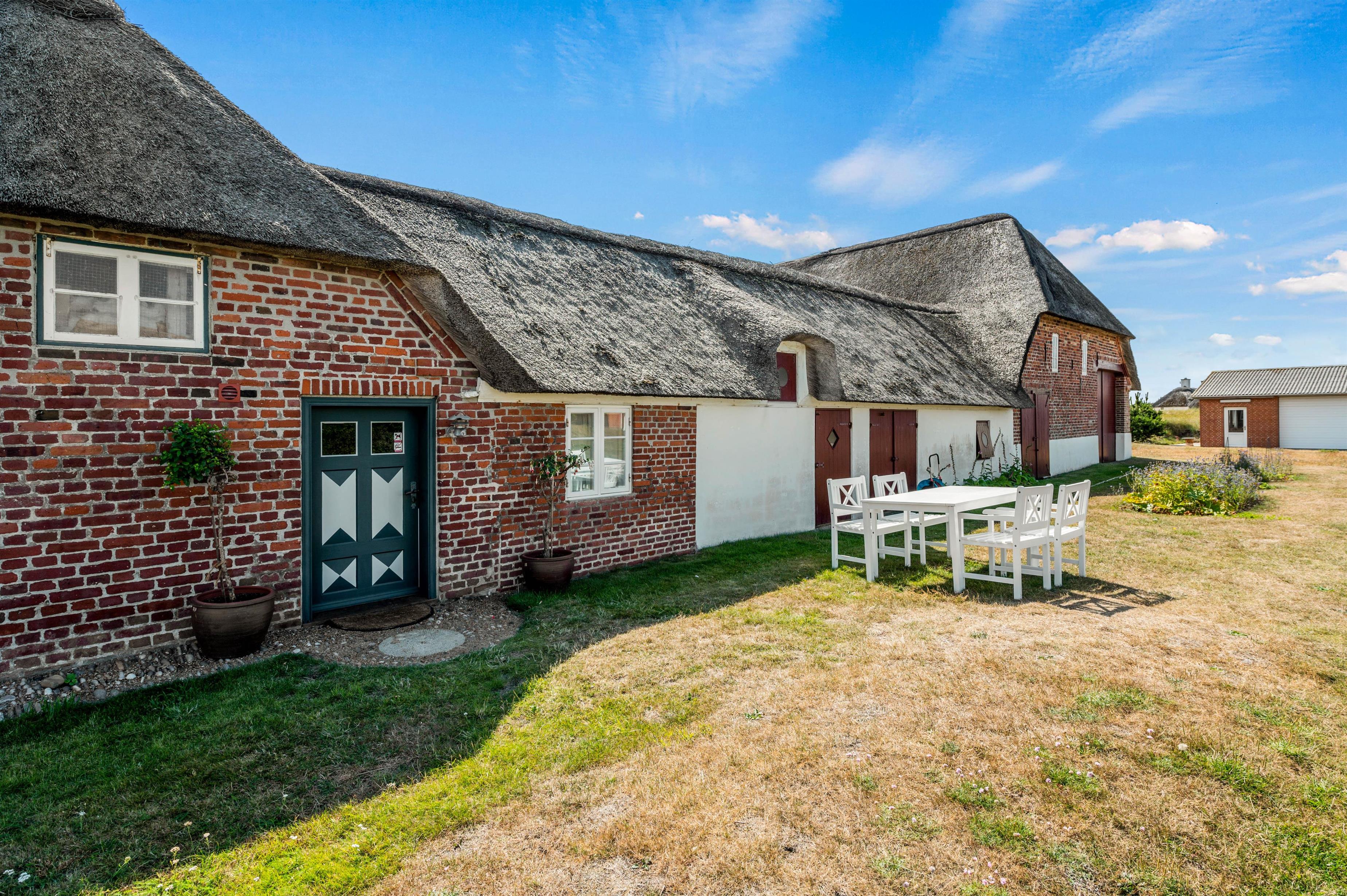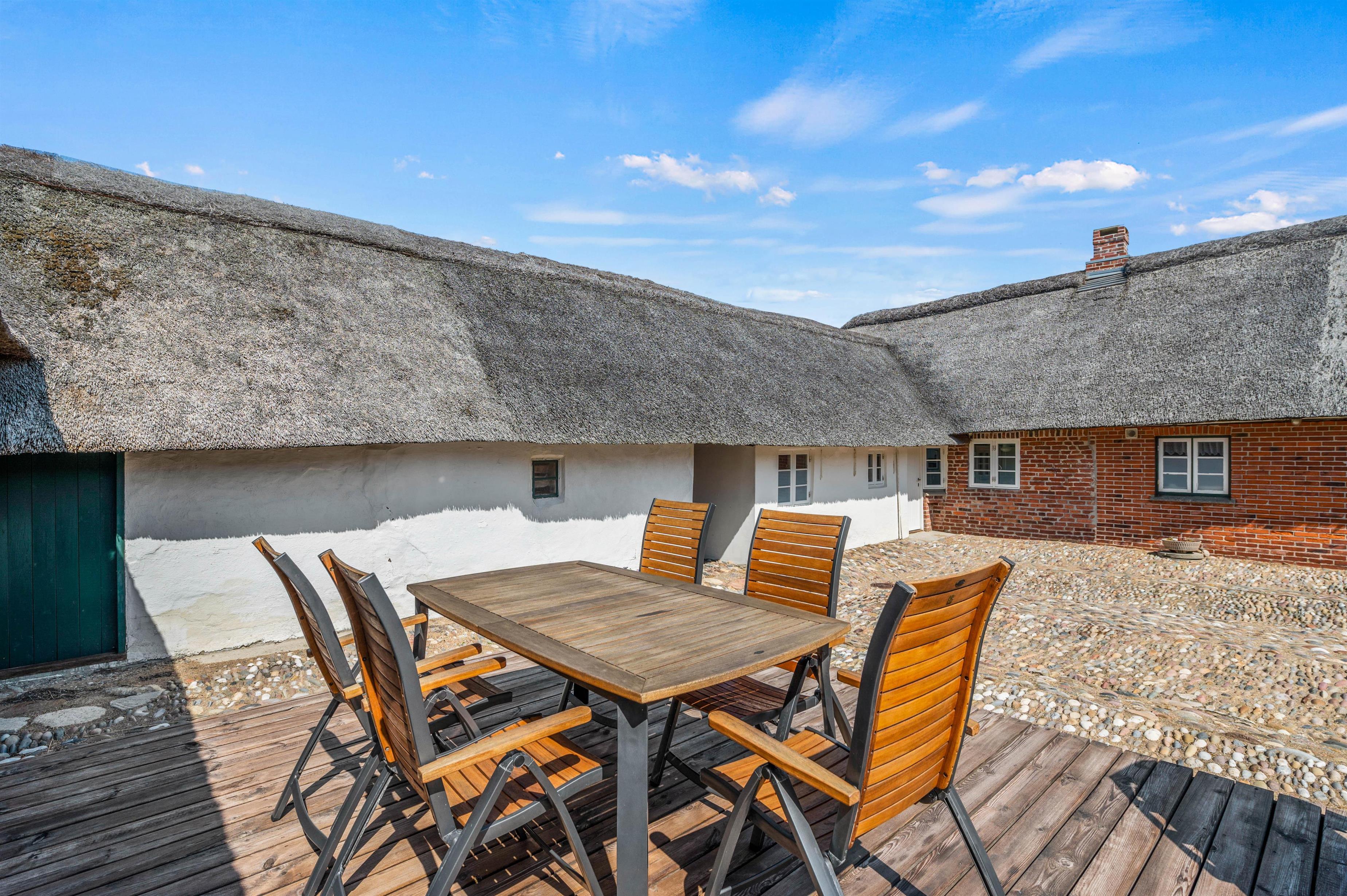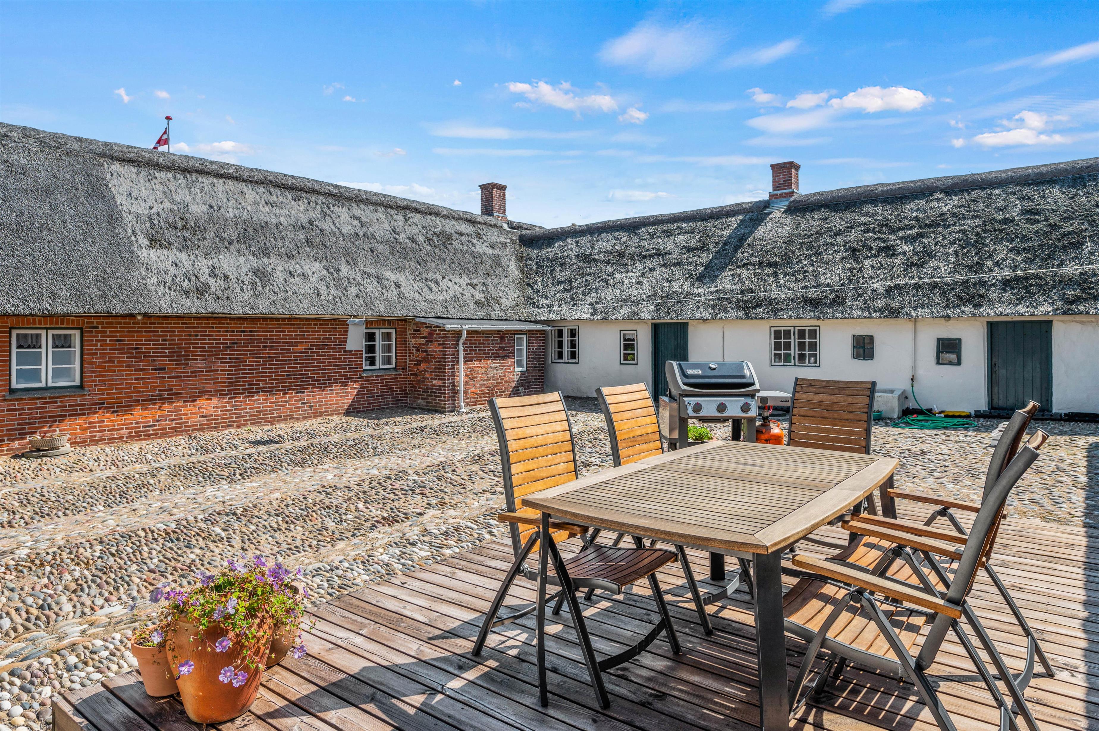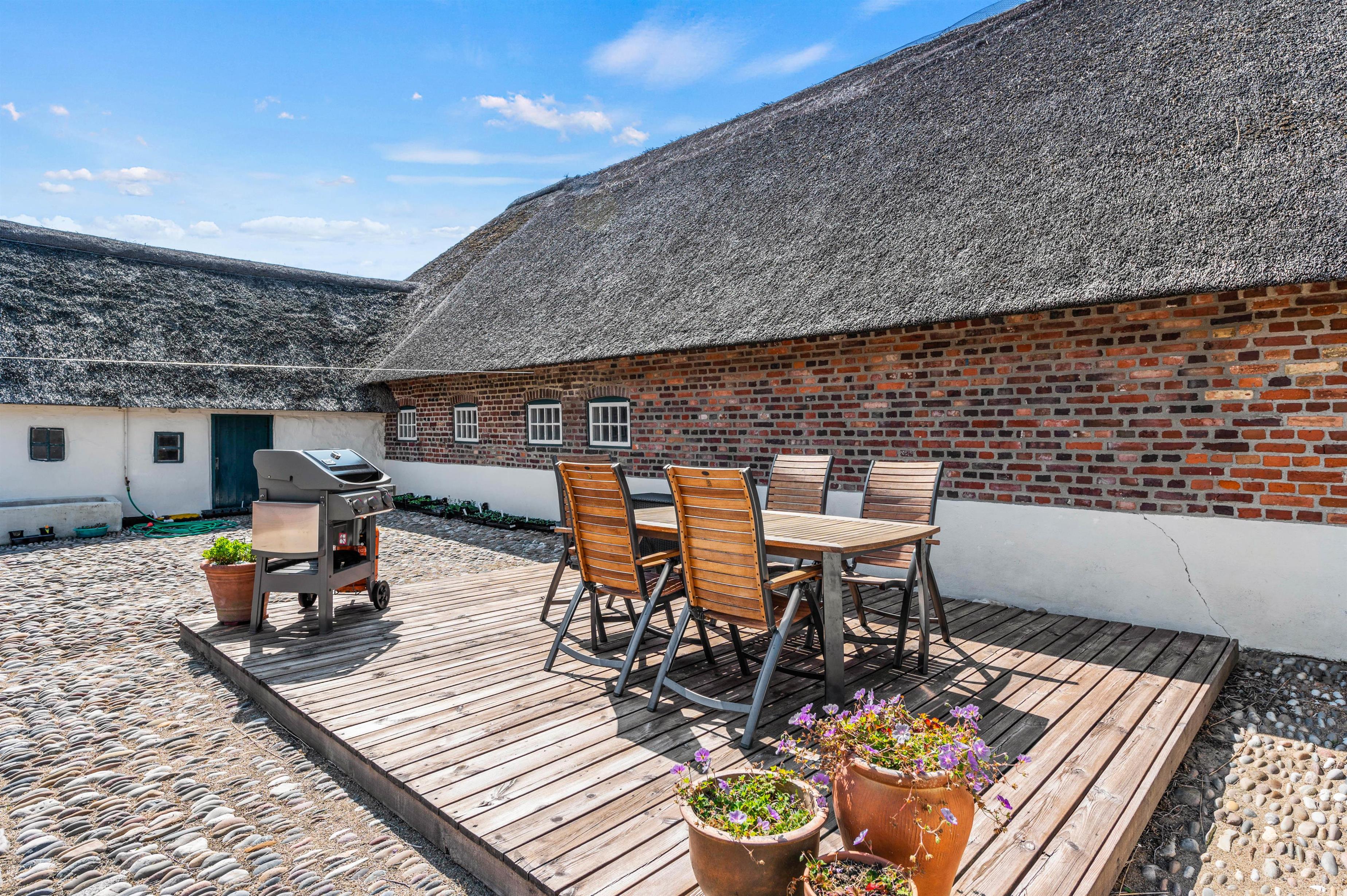 Udendørs byder sommerhuset på en hyggelig gårdsplads med masser af læ, og hvor I både har havemøbler og en gasgrill til rådighed. Dermed kan I finde jer godt til rette på en god plads i solen i løbet af dagen, og om aftenen kan I nyde en lækker grillmiddag under åben himmel. Gårdspladsens pigstensblægning er et gammelt håndværk, som man ikke ser så tit længere.