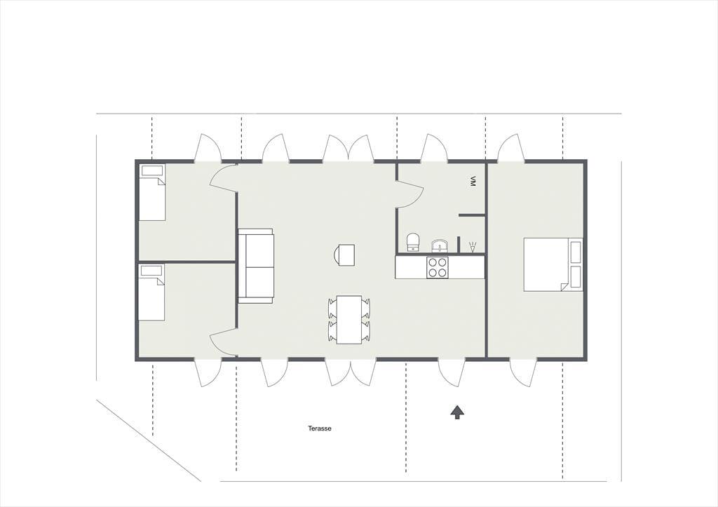 Her kan ferien nydes i et lyst og indbydende sommerhus. Med højt til loftet er der en rummelighed i huset, men uden at sommerhusstemningen og nærværet mistes. Der er masser af lysindfald i alle rum fra de mange udgangsdøre til terrasse. Køkkenet er i åben forbindelse med stuen, så står du for madlavningen kan du stadig være en del af fællesskabet. Når aftenen falder på i en kølig aftenstund, så kan der tændes op i brændeovnen og hygges rundt om sofabordet med en kop varm kakao, og måske endda med friskbagte boller.