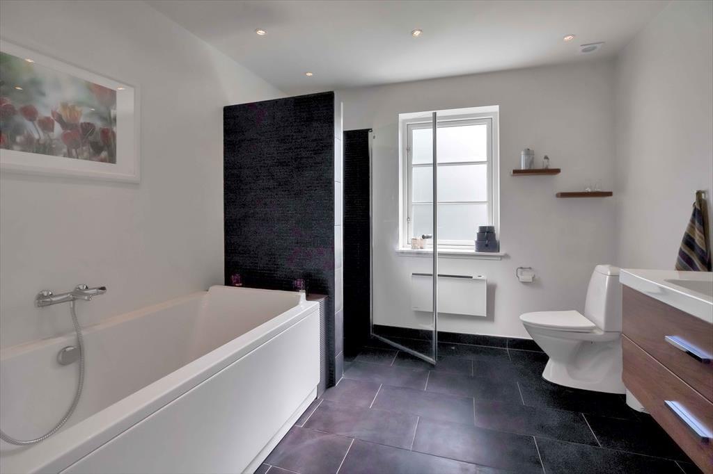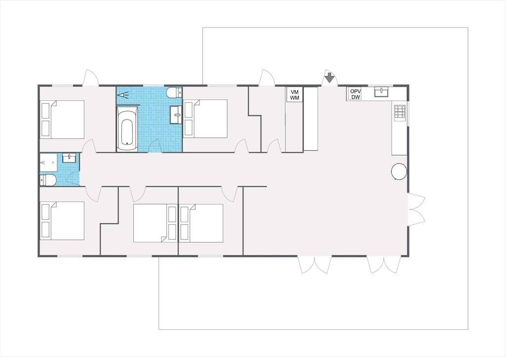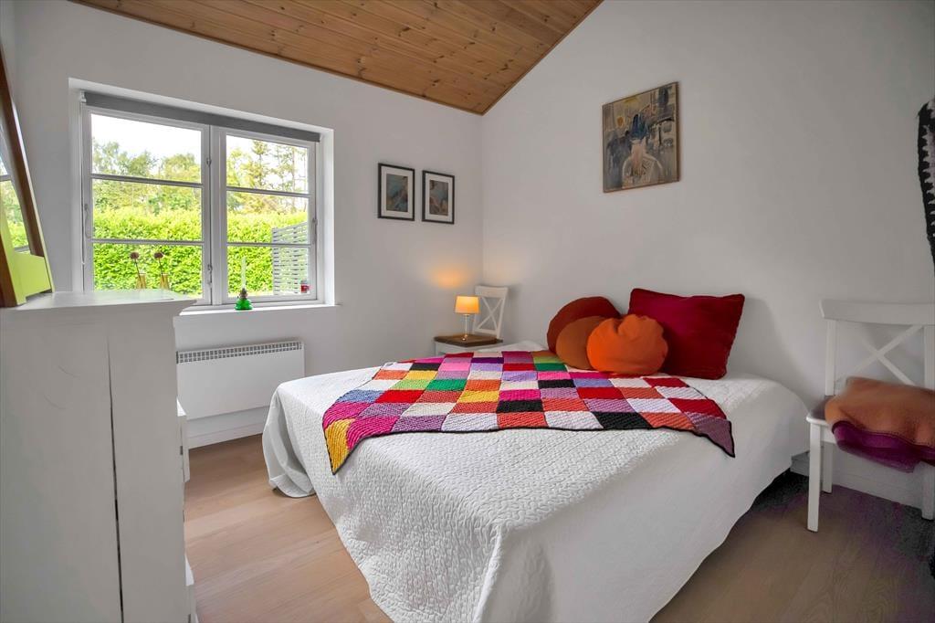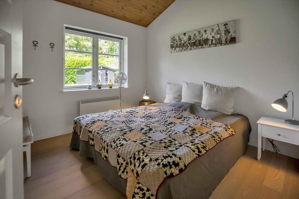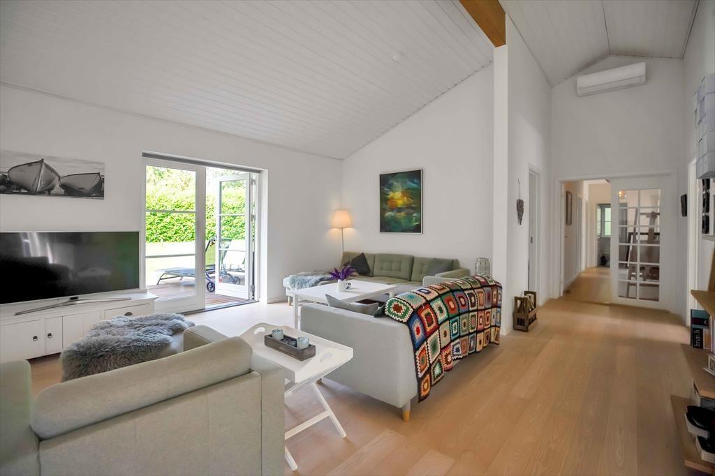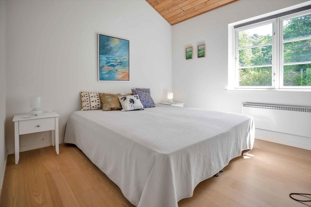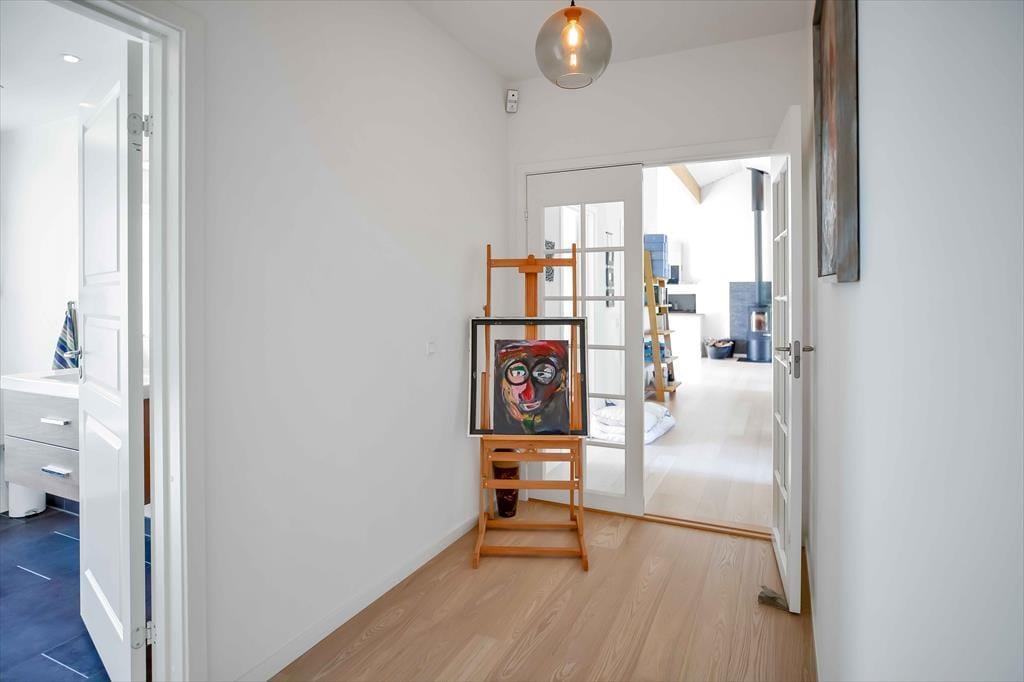 Entré med vaskemaskine. Fordelingsgang med varmepumpe og adgang til 5 store værelser, hvor alle har dobbeltseng. Badeværelse med bruseniche og gulvvarme. Stort badeværelse med bruseniche, gulvvarme og karbad. Stue med udgang til træterrasse med markise. Stort åbent køkken alrum i forbindelse med stuen med spiseplads og brændeovn, samt udgang til terrasse både i øst, syd og vest. Huset har udendørs bruser på den nordlige gavl.