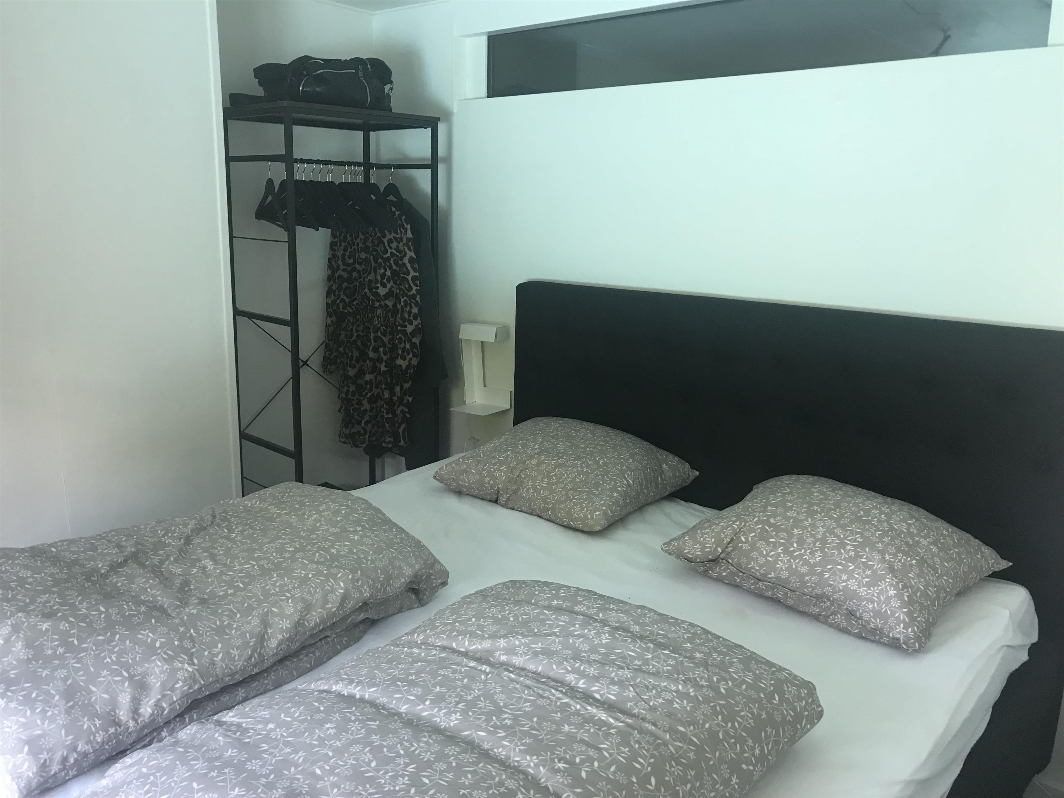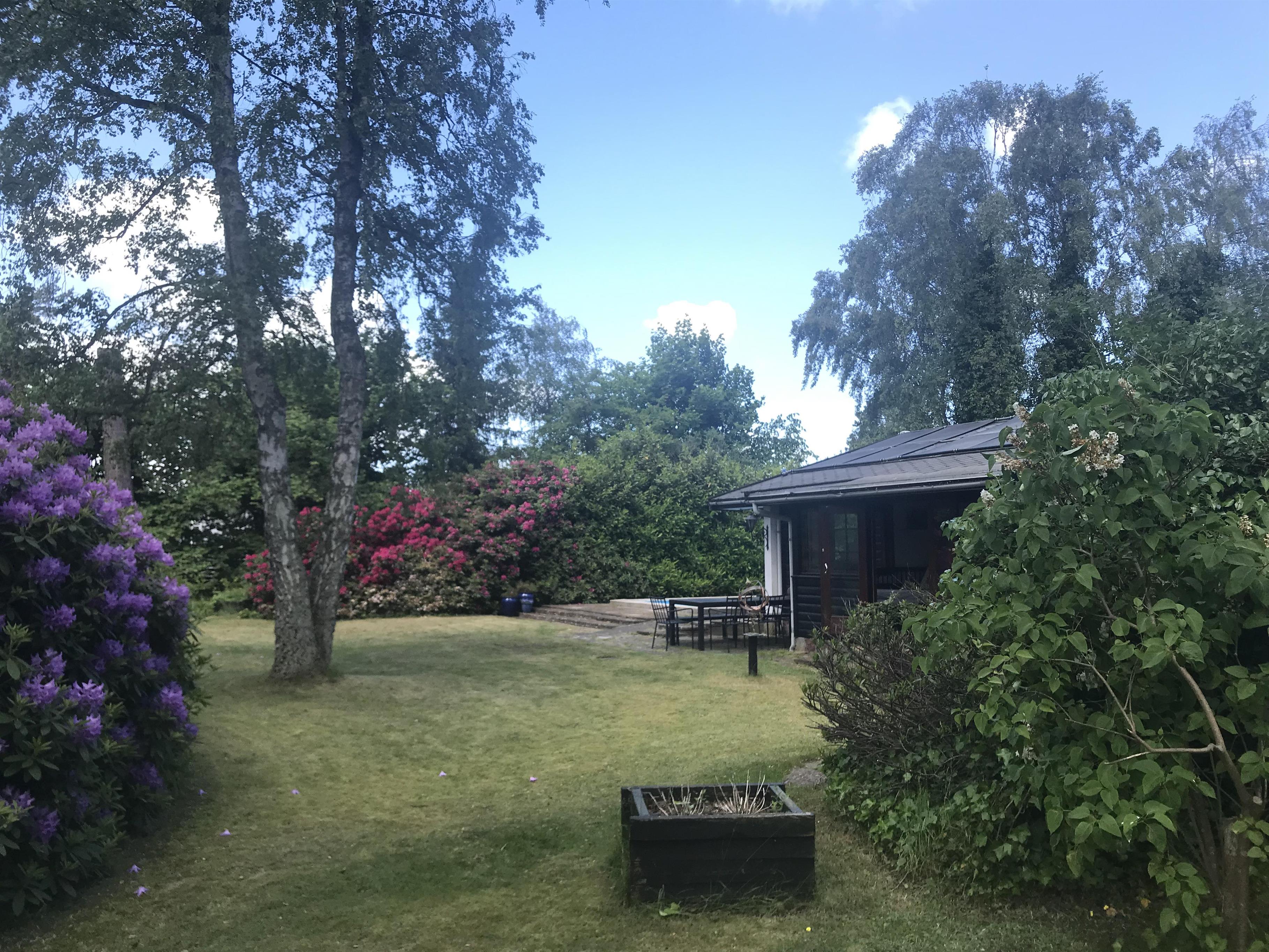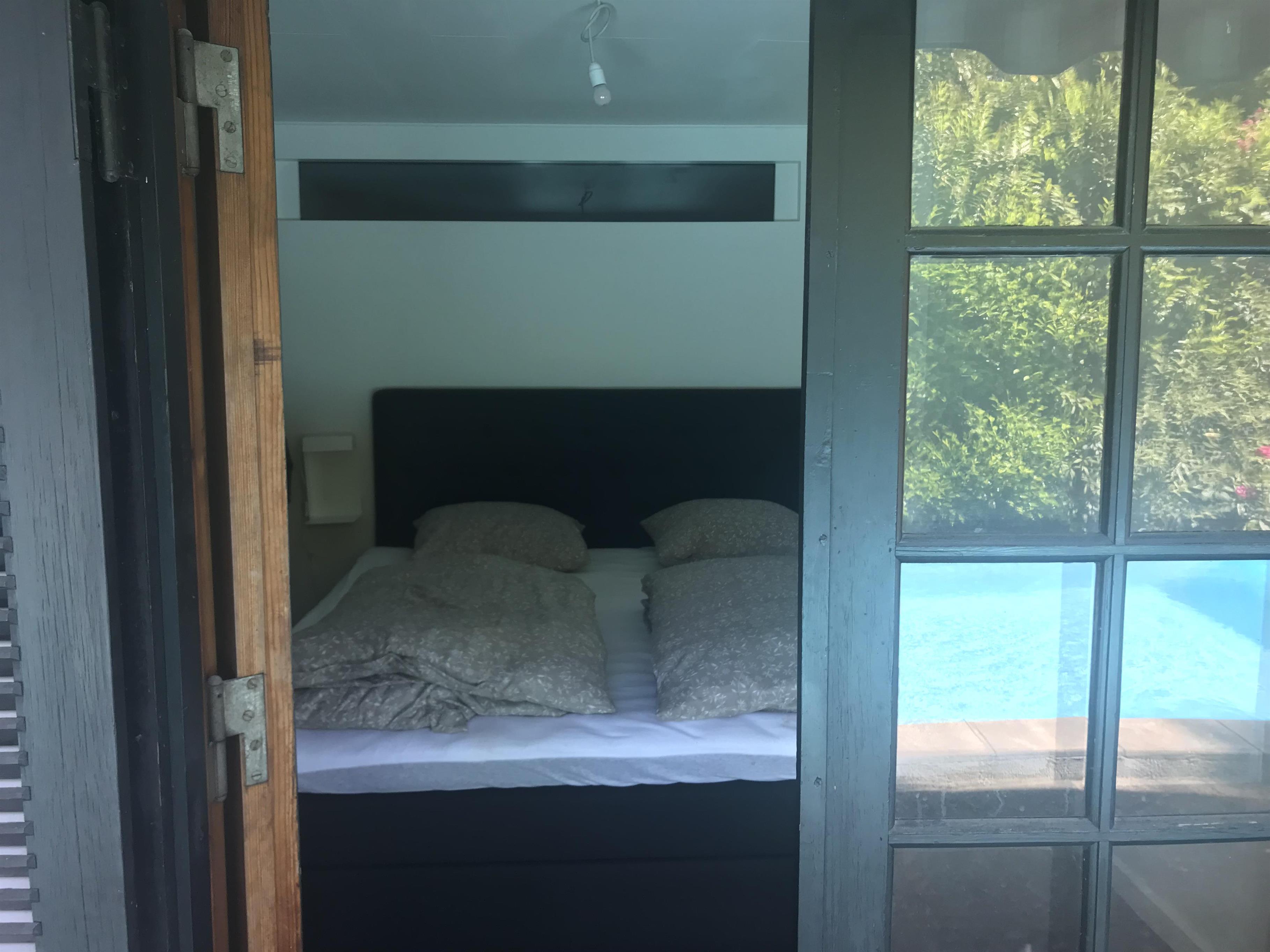 Huset har tre soveværelser. To af soveværelserne en indrettede med dobbeltsenge. Det tredje soveværelse har to enkeltsenge og fungerer også som et gennemgangsværelse. Det har ikke dør, men er afskærmet med et fletgardin. Derudover er der en sovesofa med plads til to personer. Sovesofaen står i den skønne udestue, der har dobbelte døre ud til haven og udsigt til den fantastiske, store rhododendron.