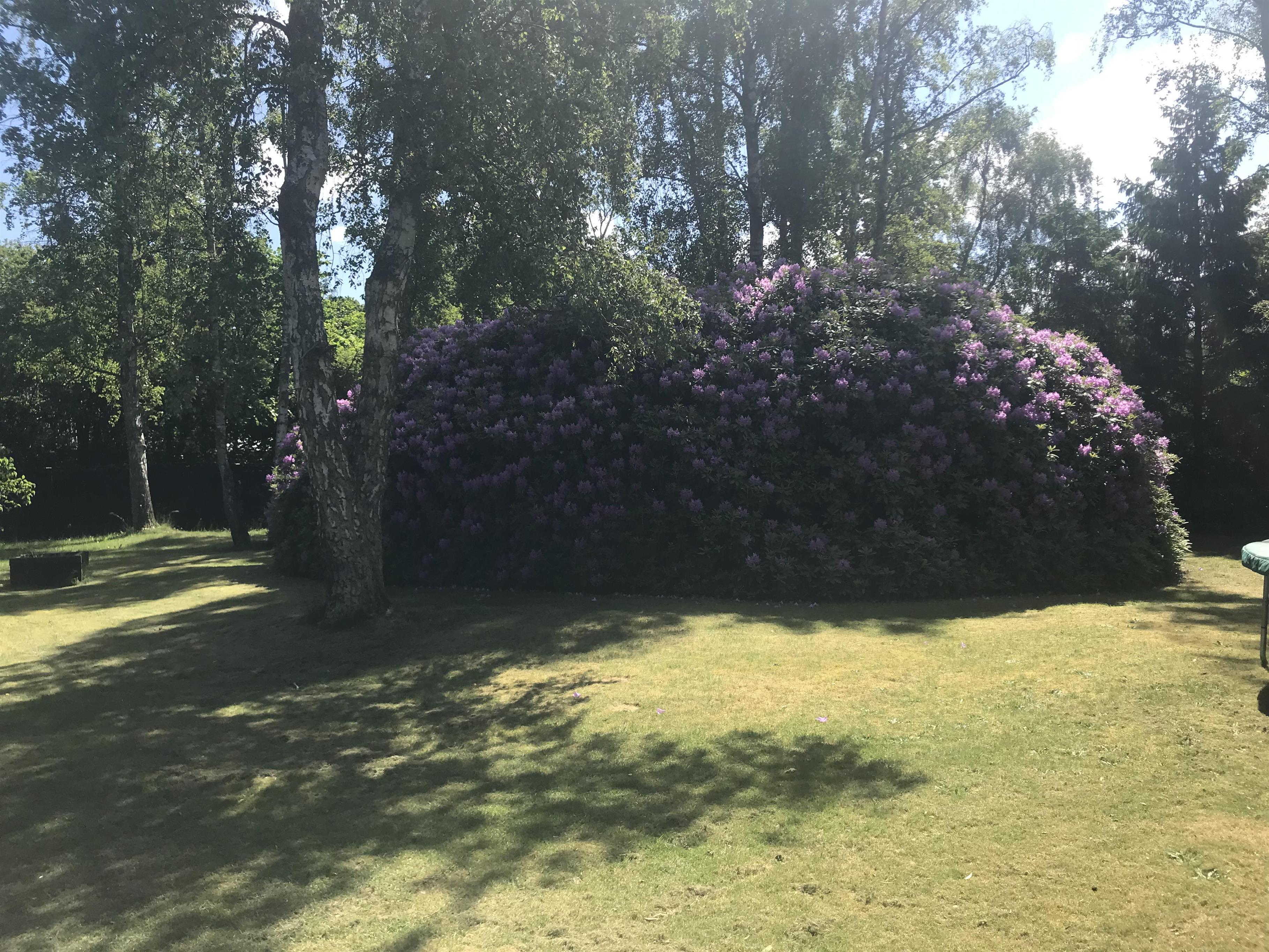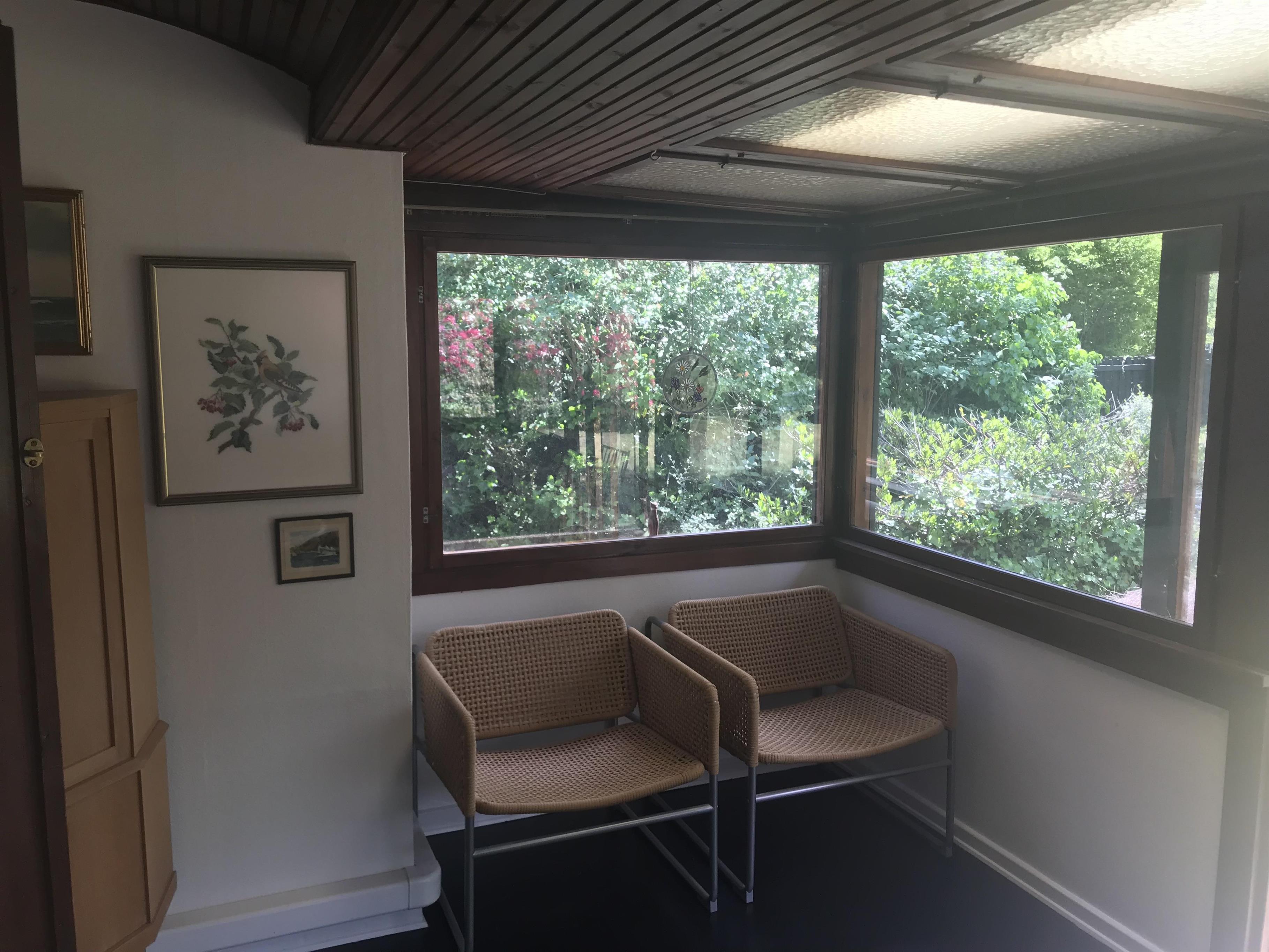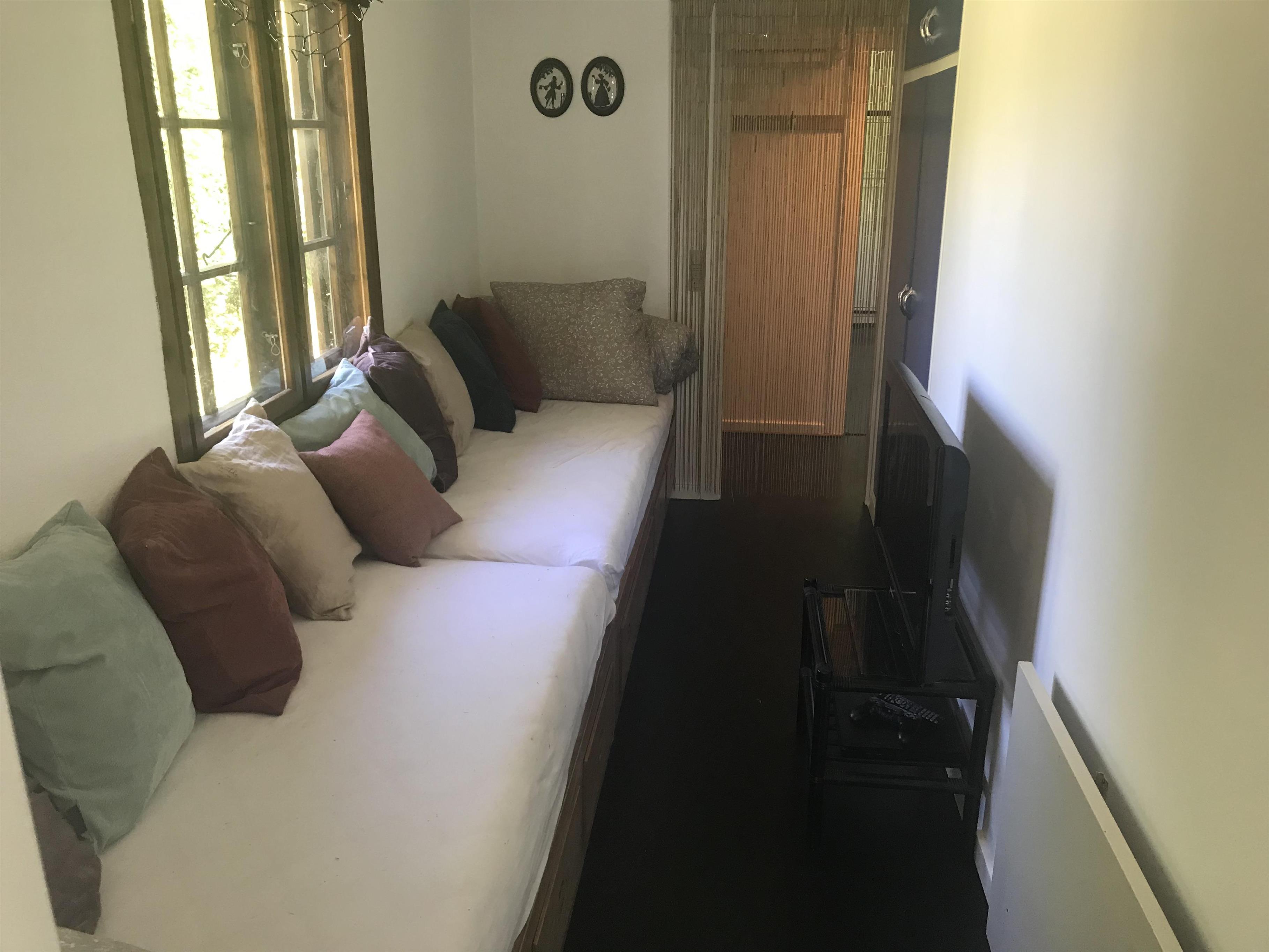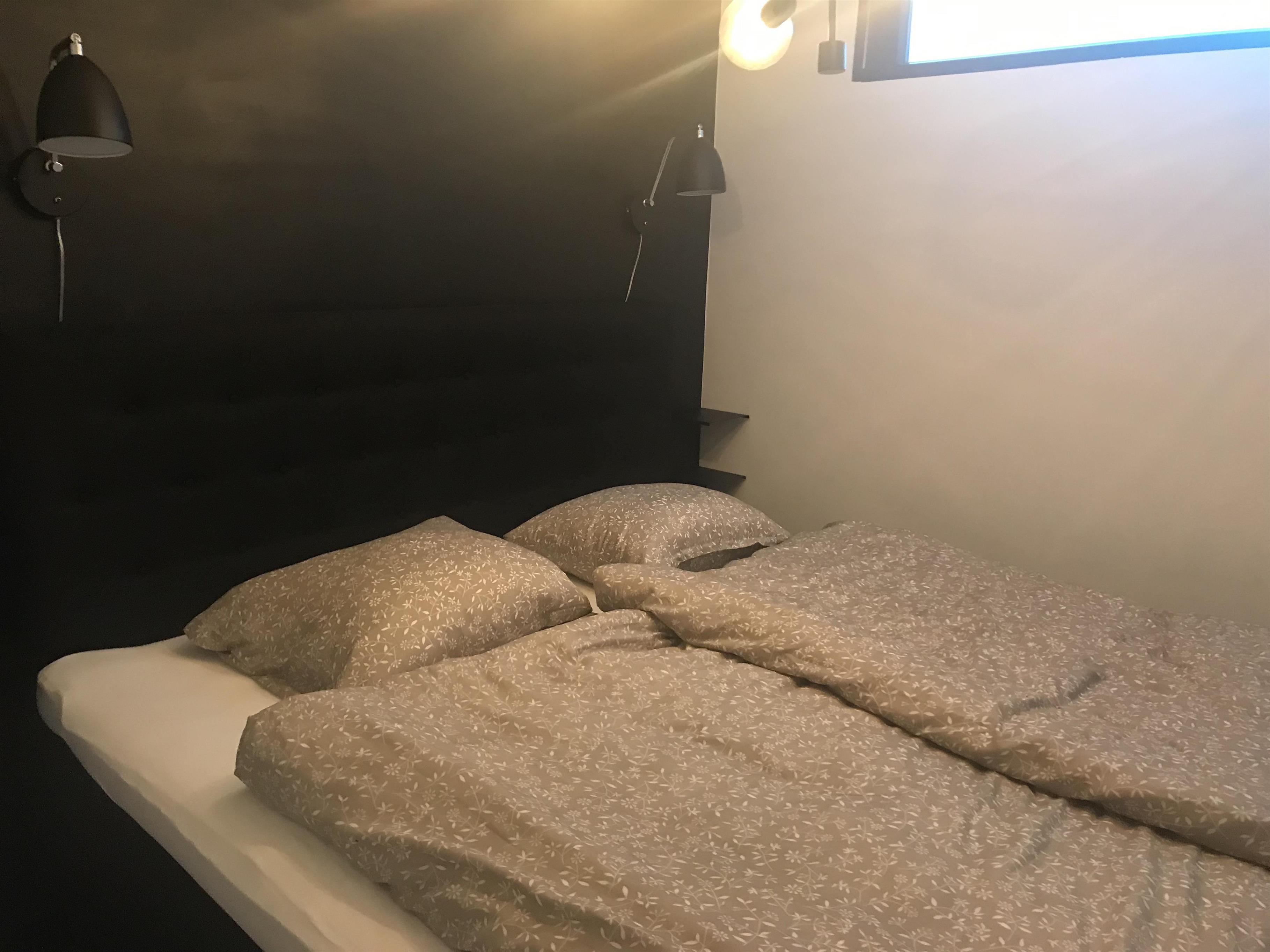 Huset har tre soveværelser. To af soveværelserne en indrettede med dobbeltsenge. Det tredje soveværelse har to enkeltsenge og fungerer også som et gennemgangsværelse. Det har ikke dør, men er afskærmet med et fletgardin. Derudover er der en sovesofa med plads til to personer. Sovesofaen står i den skønne udestue, der har dobbelte døre ud til haven og udsigt til den fantastiske, store rhododendron.