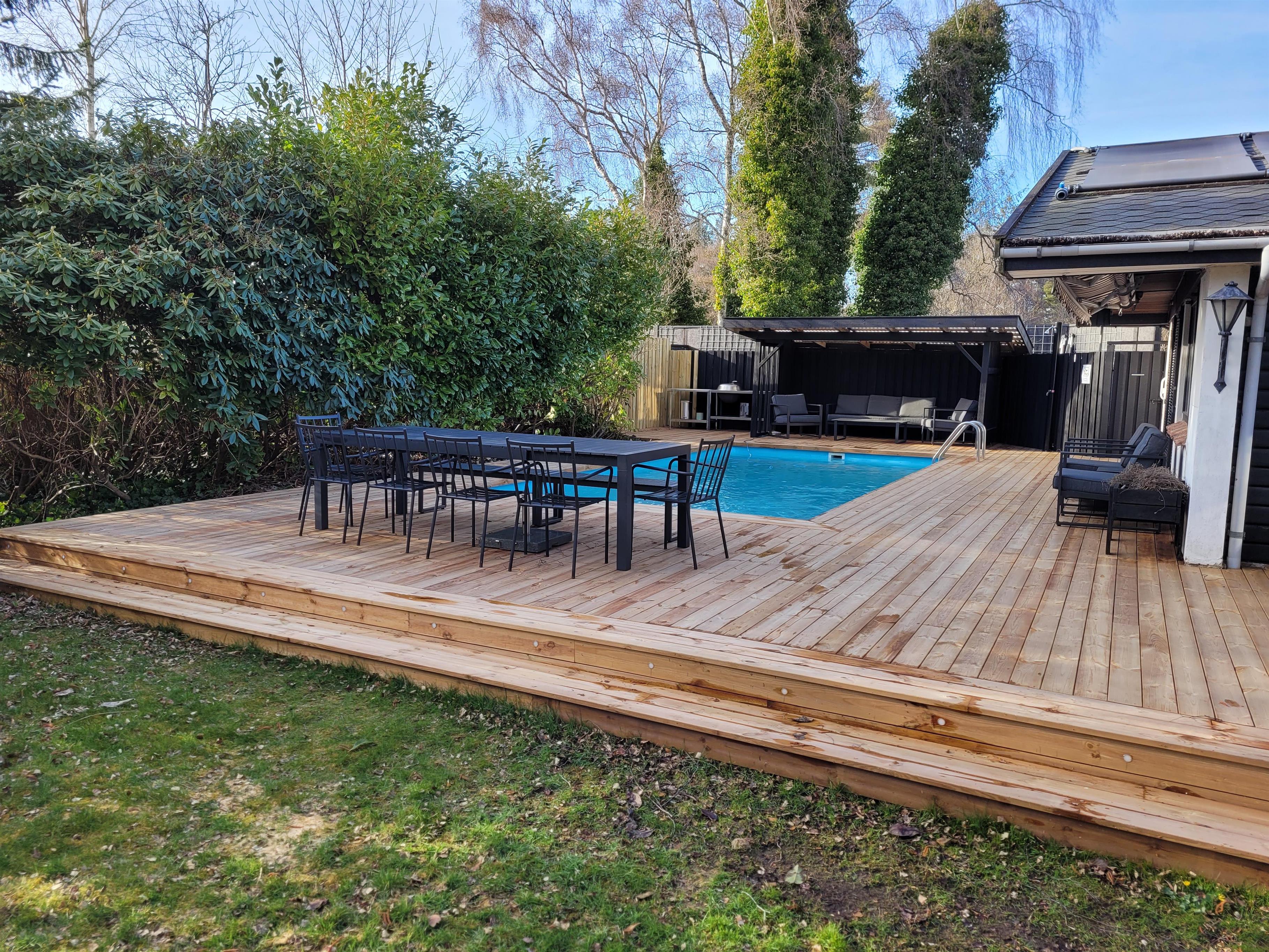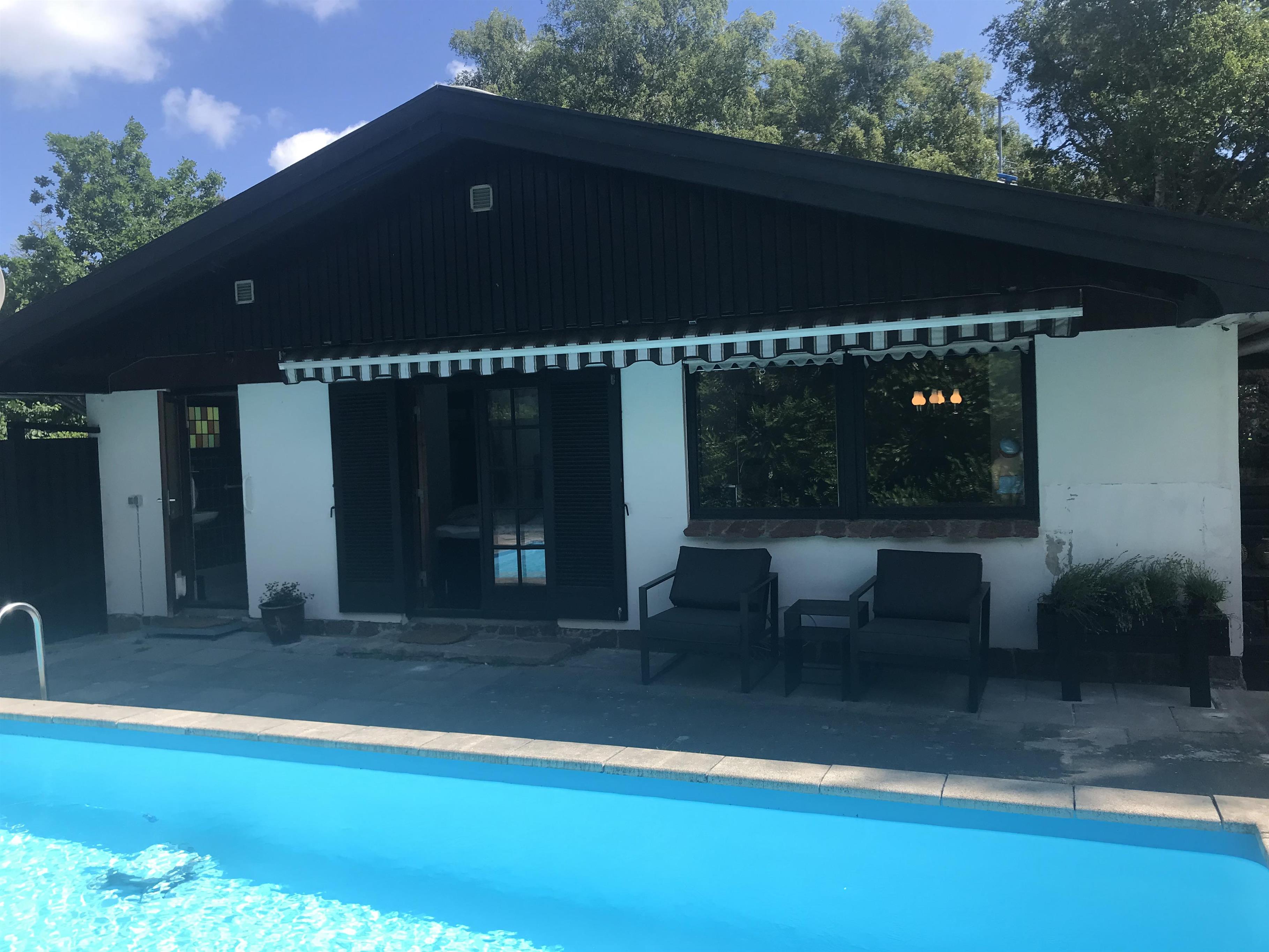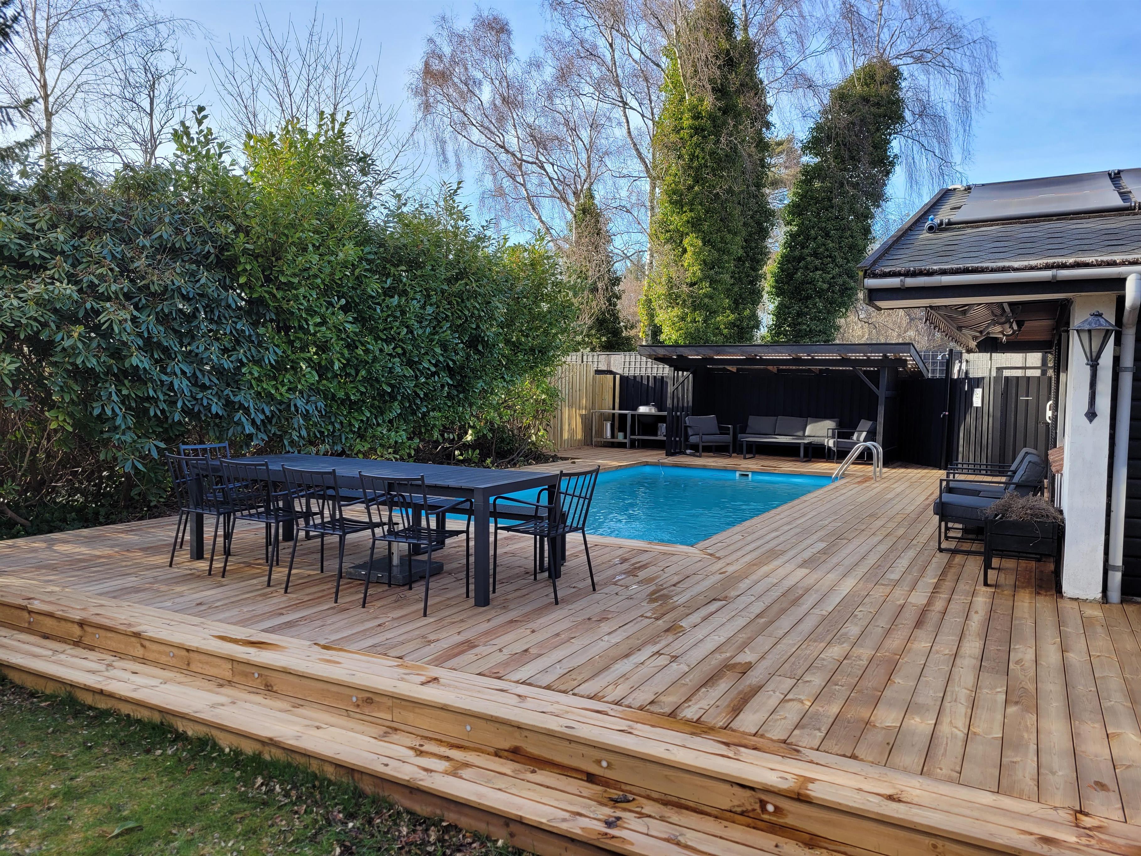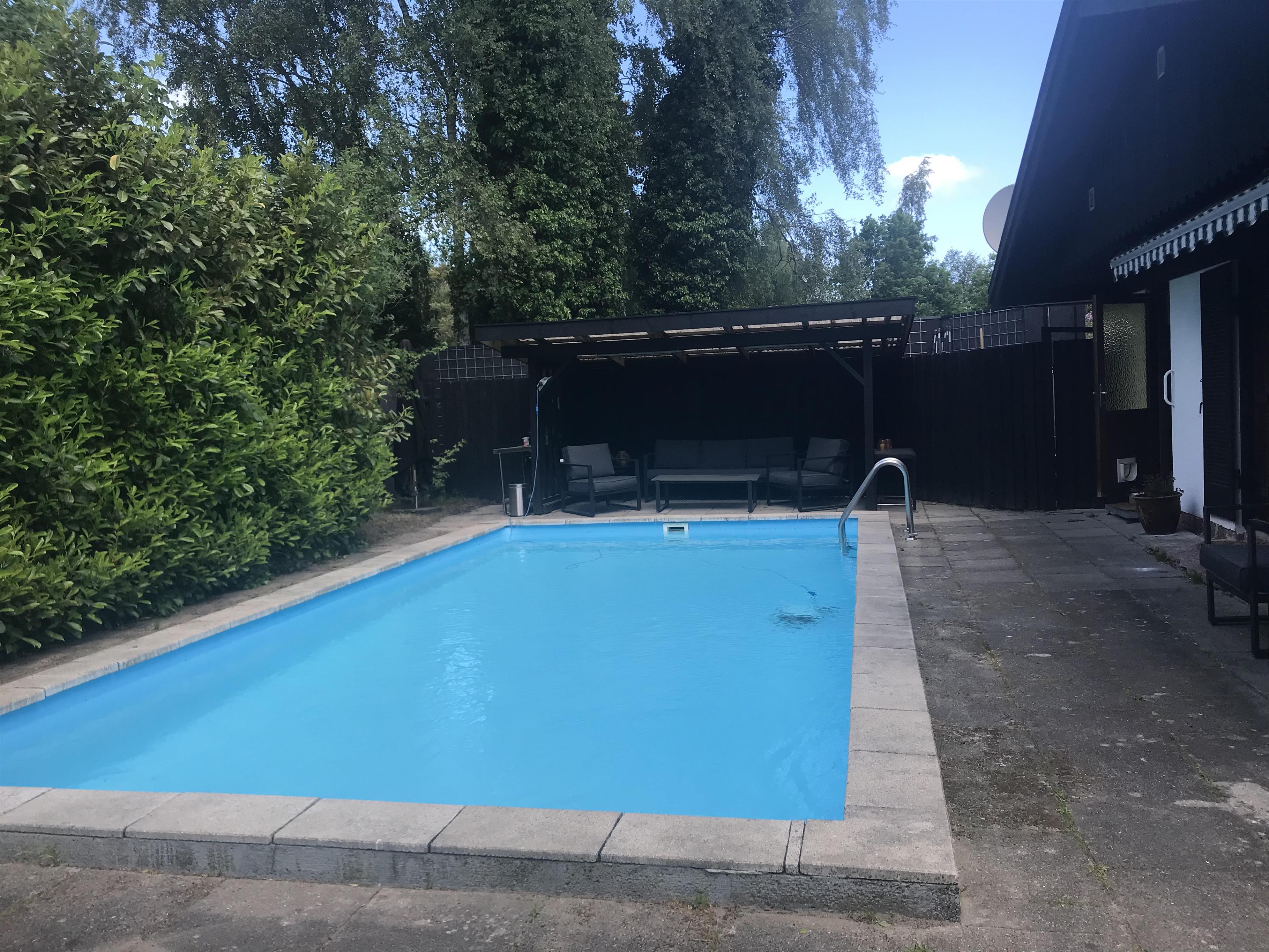 I det skønne pool-område, hvor både børn og voksne kan svømme og more sig, er der indrettet et dejligt, overdækket loungeområde ved den ene ende af poolen, så man kan overvåge poolen på en behagelig og betryggende vis, når man ikke selv vil med i vandet. Her er også grill, havemøbler og liggestole samt p-plads til bilen.