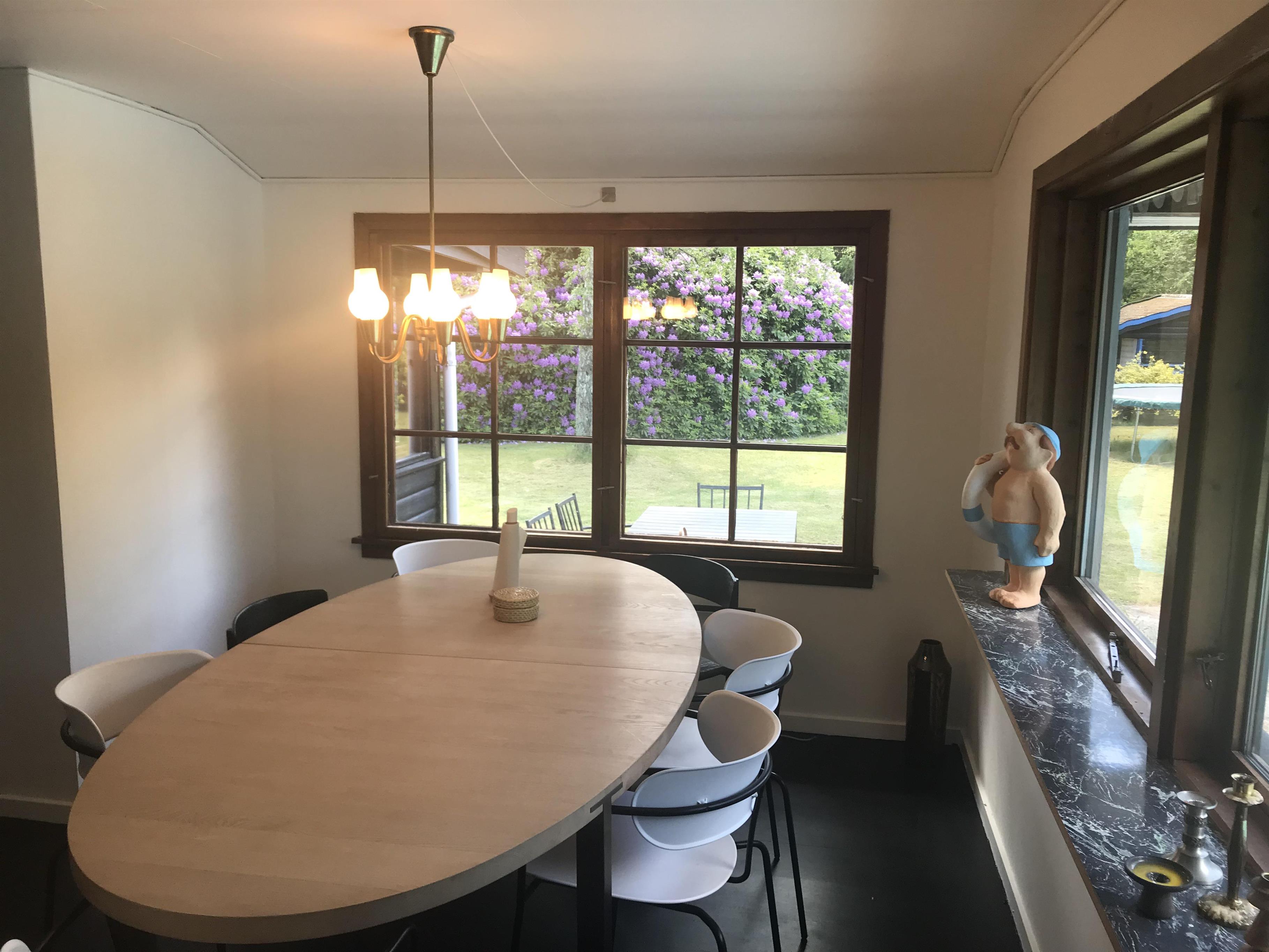 Dette klassiske feriehus ligger på en skøn, stor grund. Udover el-varme opvarmes huset også af to varmepumper. Den skønne stue har brændeovn, og fra sofaen kan I nyde synet af den dejlige have gennem det flotte vinduesparti. (NB: Der er ikke gratis brænde, men lejere kan anvende det brænde, der måtte ligge under selve brændeovnen. Brænde kan købes i supermarkedet eller på tankstationer.)