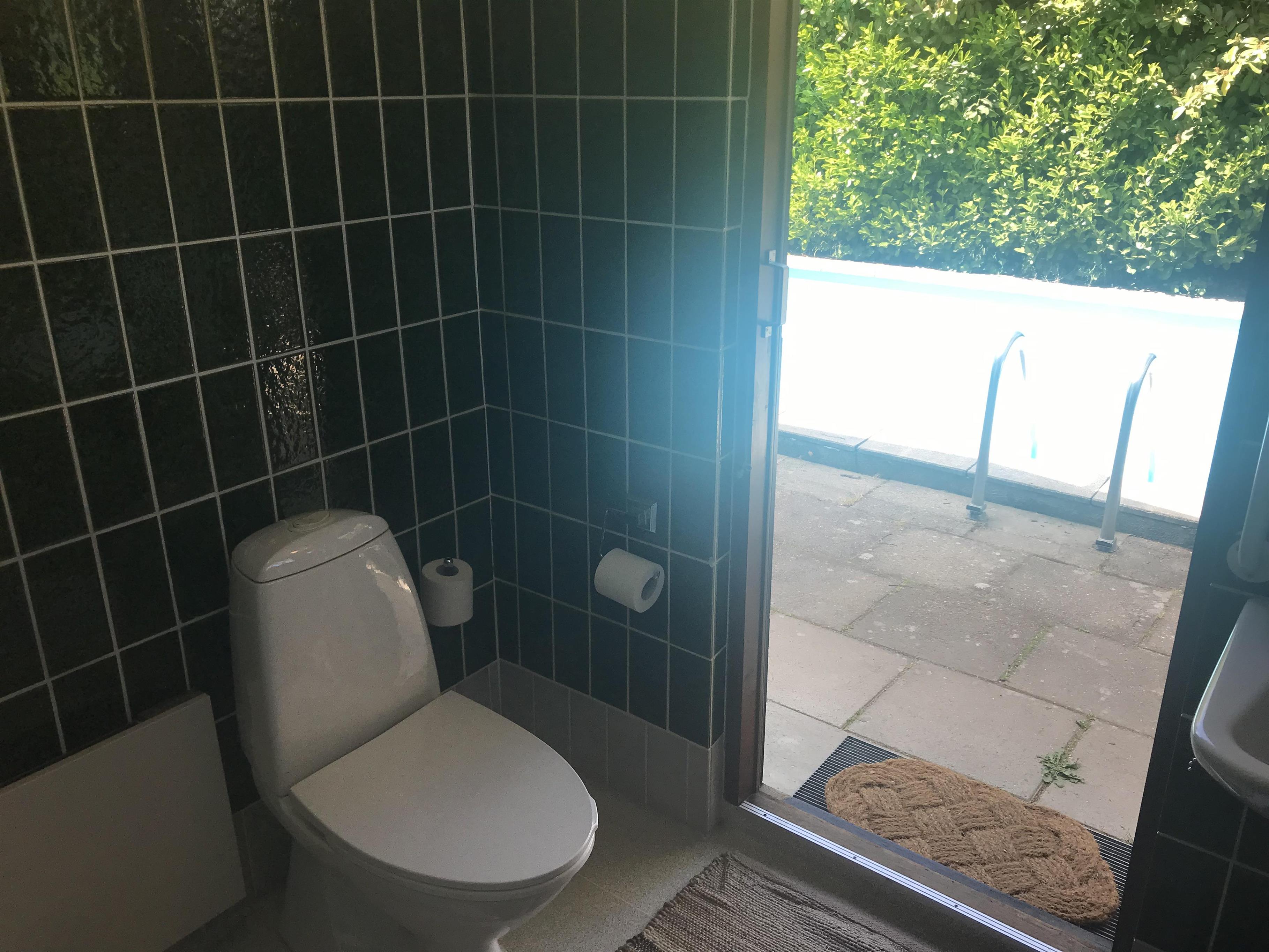 Huset har et badeværelse og et ekstra toilet. Der er direkte adgang til badeværelset fra pool-området.