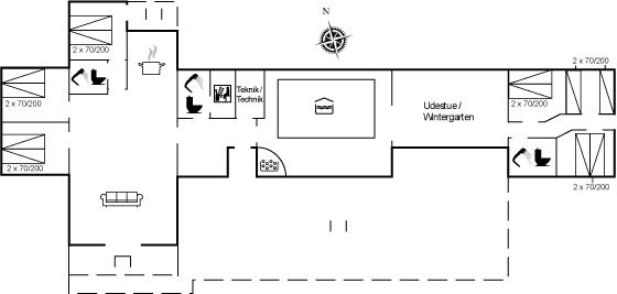 Indendørs er der trævægge og -lofter. I stue og soverum er der trægulv, ellers klinkegulv. Huset er velindrettet og velegnet til 2 familier. 12 komfortable sovepladser fordelt på 6 soverum: 5 med dobbeltseng og 1 med 2 enkeltsenge. Desuden 3 badeværelser med bruseniche og gulvvarme. Det ene badeværelse indeholder desuden sauna. Køkkenet indeholder bl.a. mikrobølgeovn, opvaskemaskine og komfur med varmluftsovn og keramiske kogeplader. Køkkenet ligger i åben forbindelse med den store, velmøblerede opholdsstue, som bl.a. indeholder TV med Boxer og parabol (tyske programmer), DVD-afspiller og stereoanlæg med radio og CD-afspiller. I pool-afdelingen med opvarmet klinkegulv findes swimmingpool (5,0 X 3,0 X 1,35 m) og spa til 3 personer. Fra pool-rummet er der adgang til stor udestue med bordtennisbord og udgang til stor terrasse med diverse havemøbler. En del af terrassen er overdækket. Huset er desuden udstyret med trådløs internetforbindelse via fibernet, vaskemaskine, tørretumbler, barneseng og høj barnestol. Udendørs findes carport. I området finder I bl.a. golf, fiskeri og sommerland. Nykøbing Sj. har bl.a. gågade med gode indkøbsmuligheder.