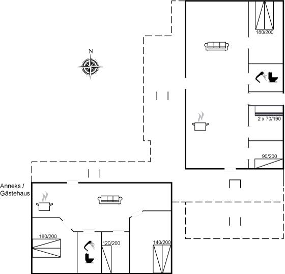 Der er i alt 6 soveværelser. Sovepladserne fordeler sig på: 6 sovepladser i dobbeltsenge. 2 sovepladser i enkeltsenge. 2 sovepladser i køjeseng.- 2 af disse sovepladser befinder sig i et anneks.