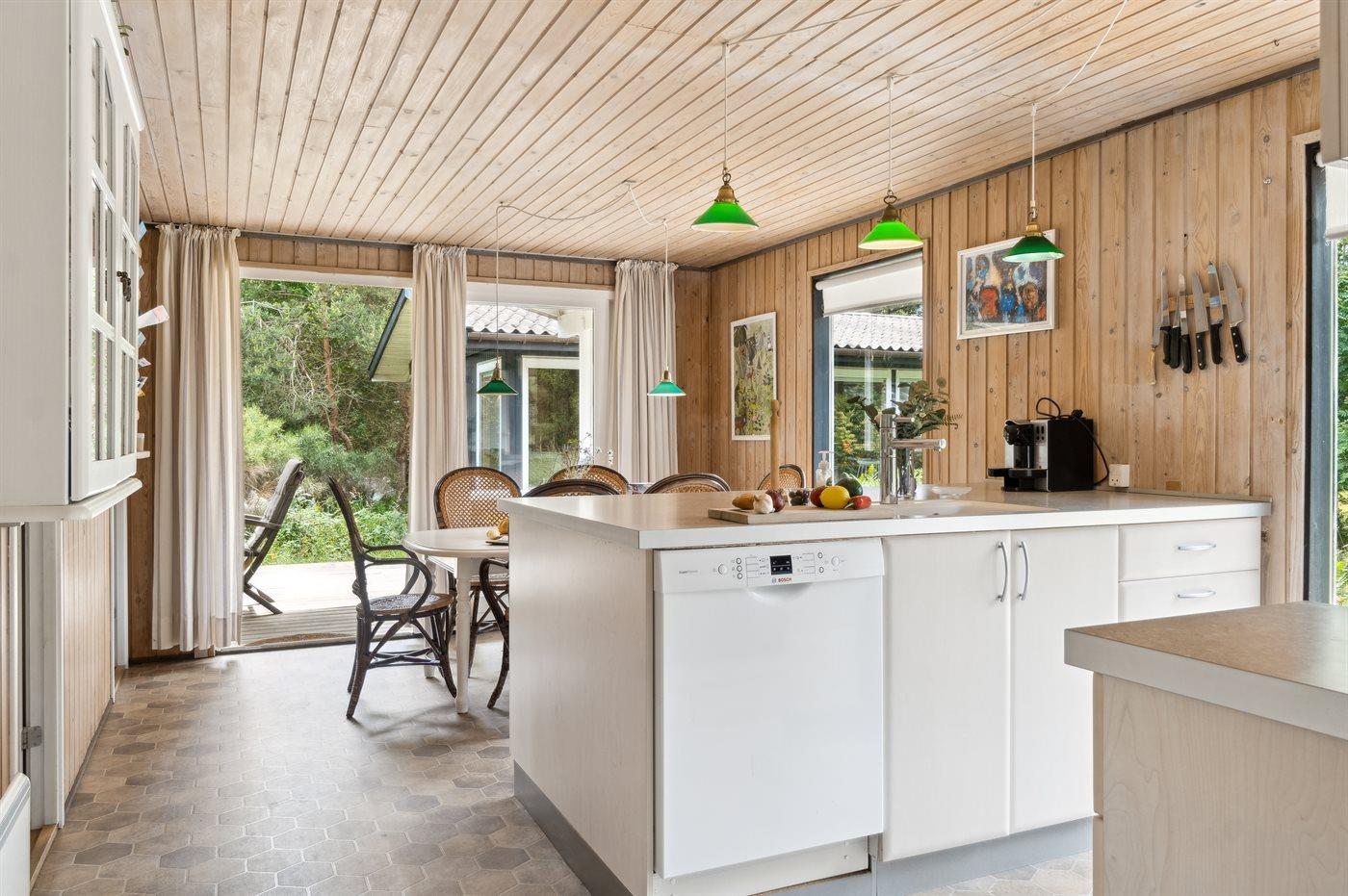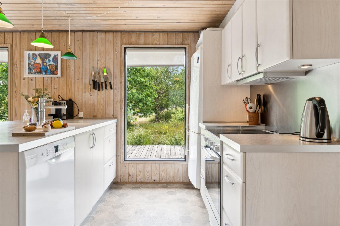Køkkenet er udstyret med 1 køleskab. Der er 4 keramiske kogeplader, varmluftovn, mikrobølgeovn samt opvaskemaskine.