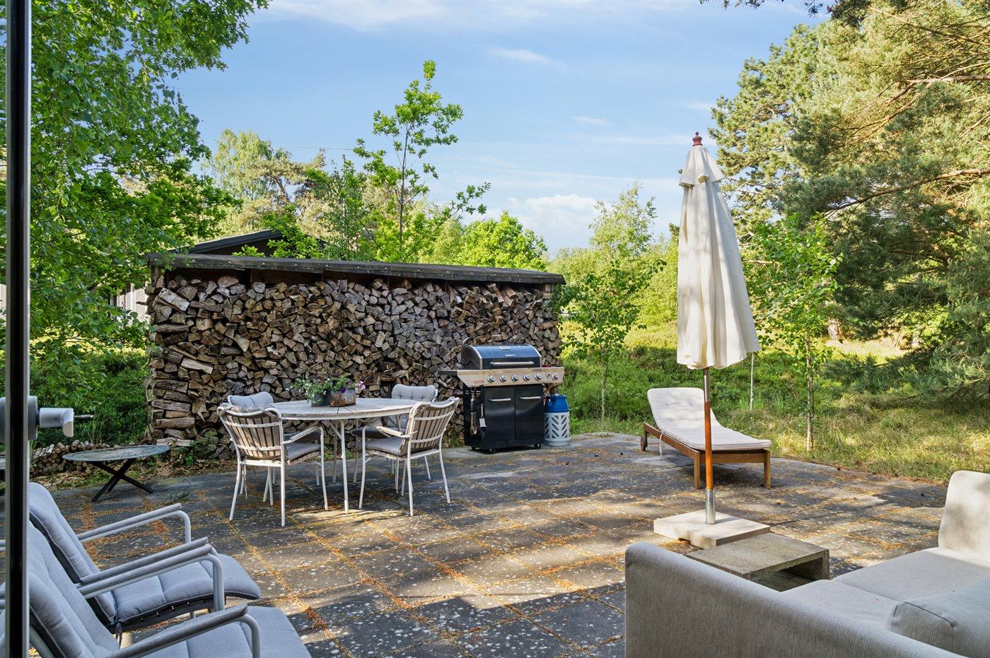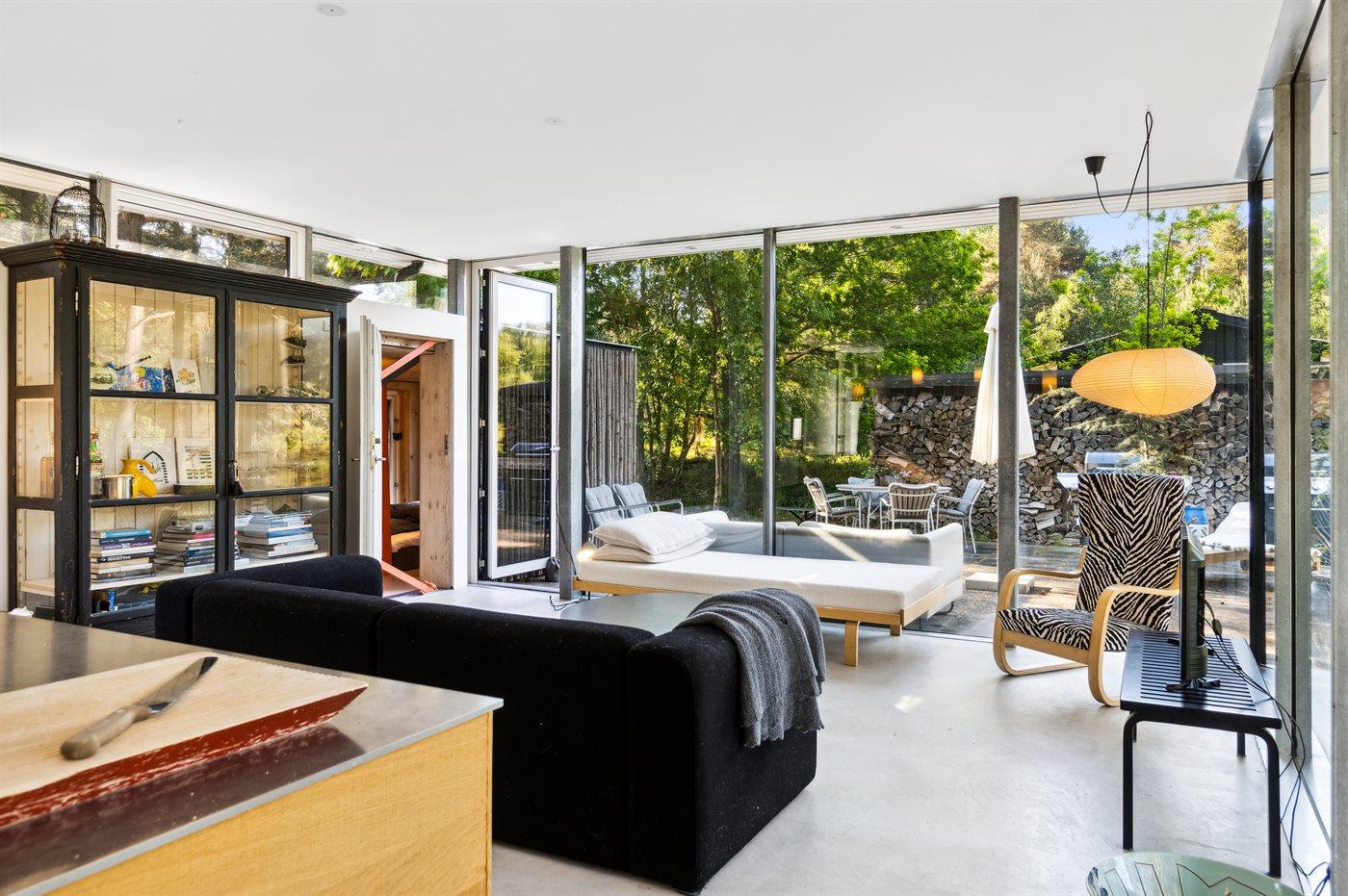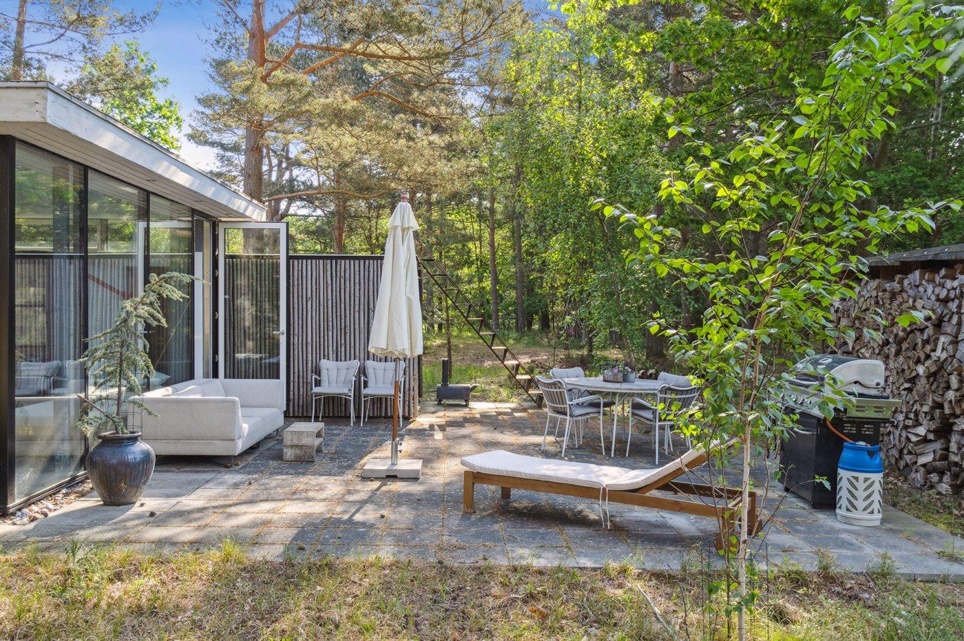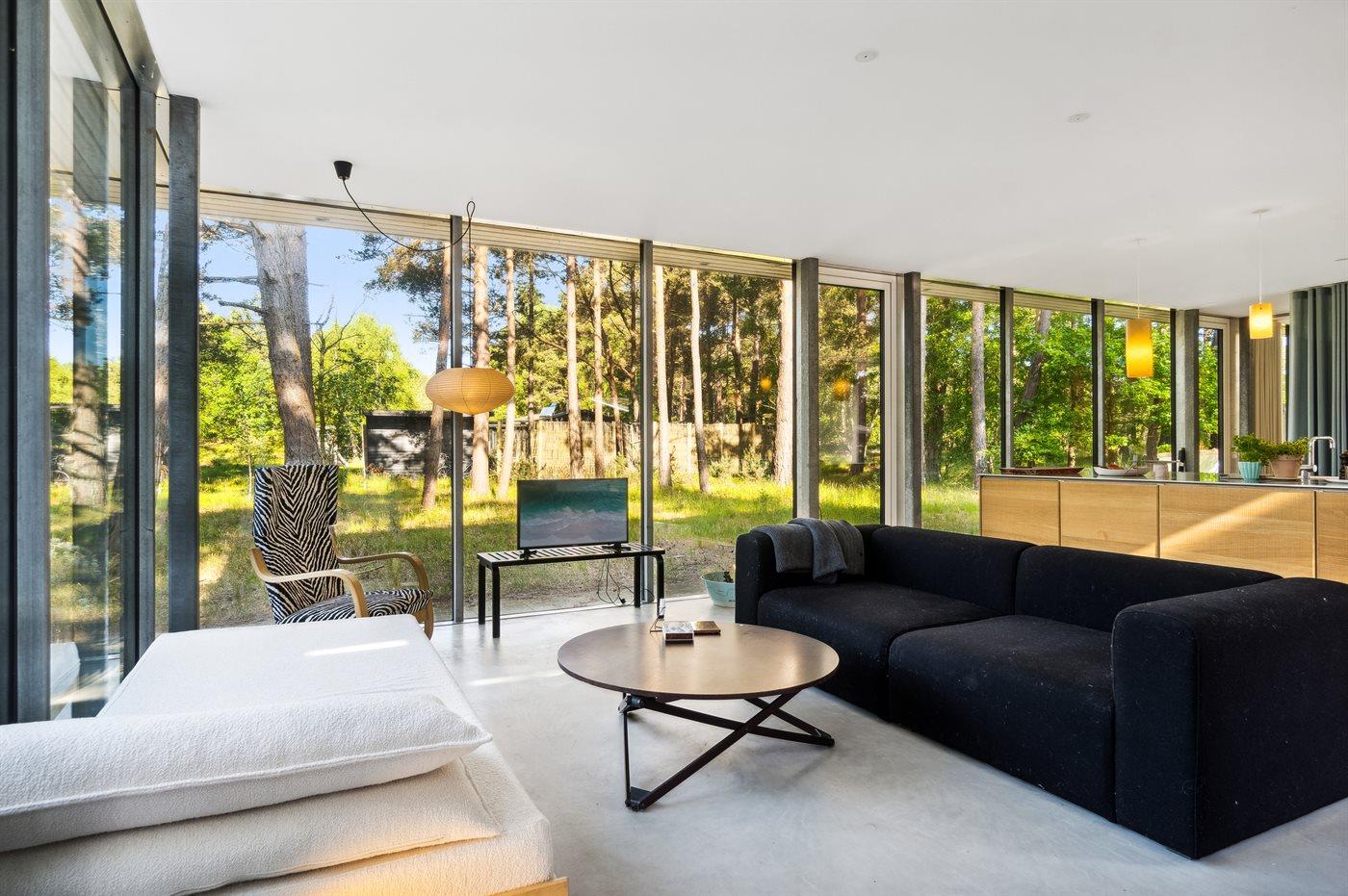 Arkitektonisk perle tæt på skov og strand med smagfuld indretning og stor terrasse.