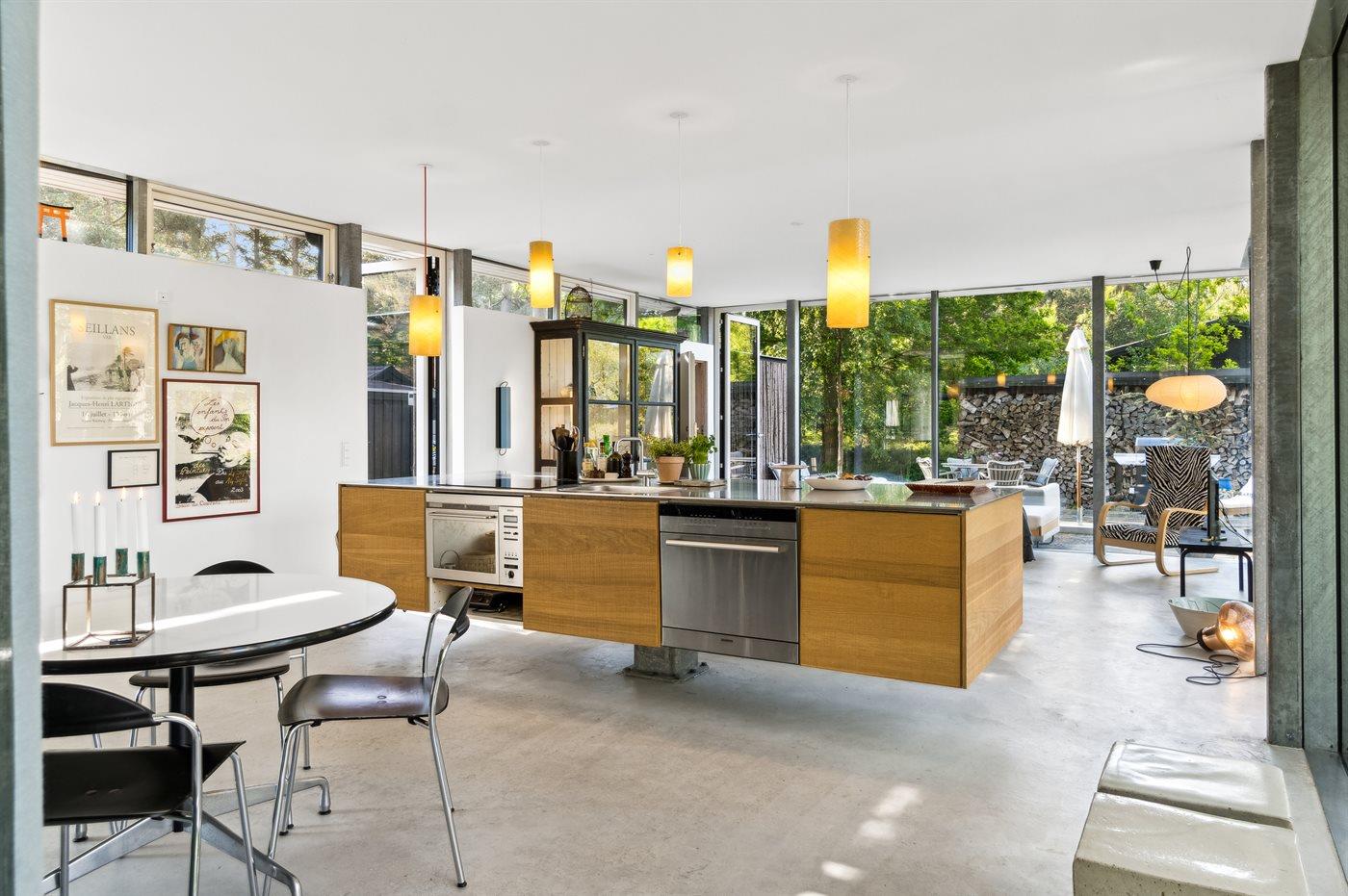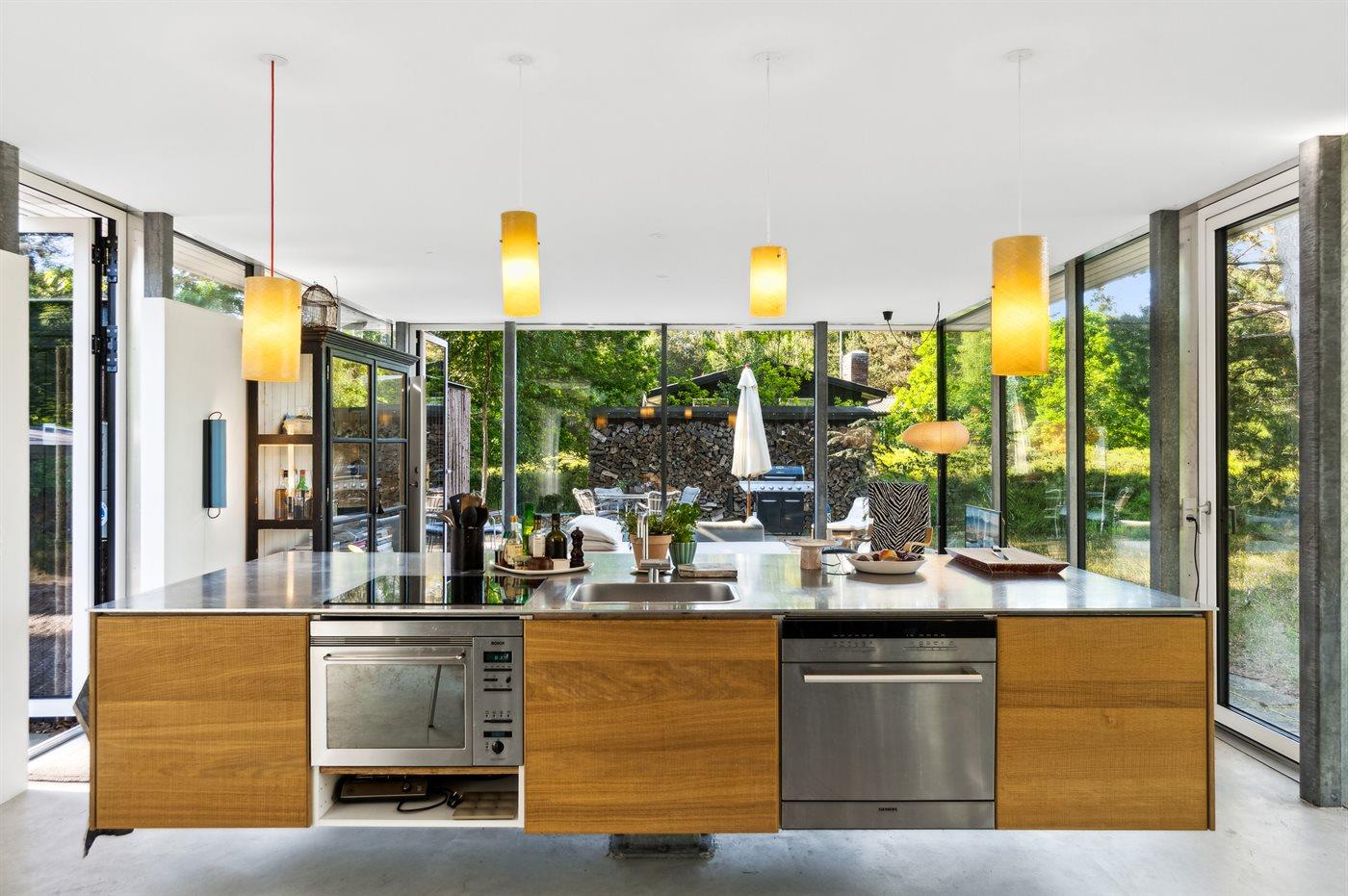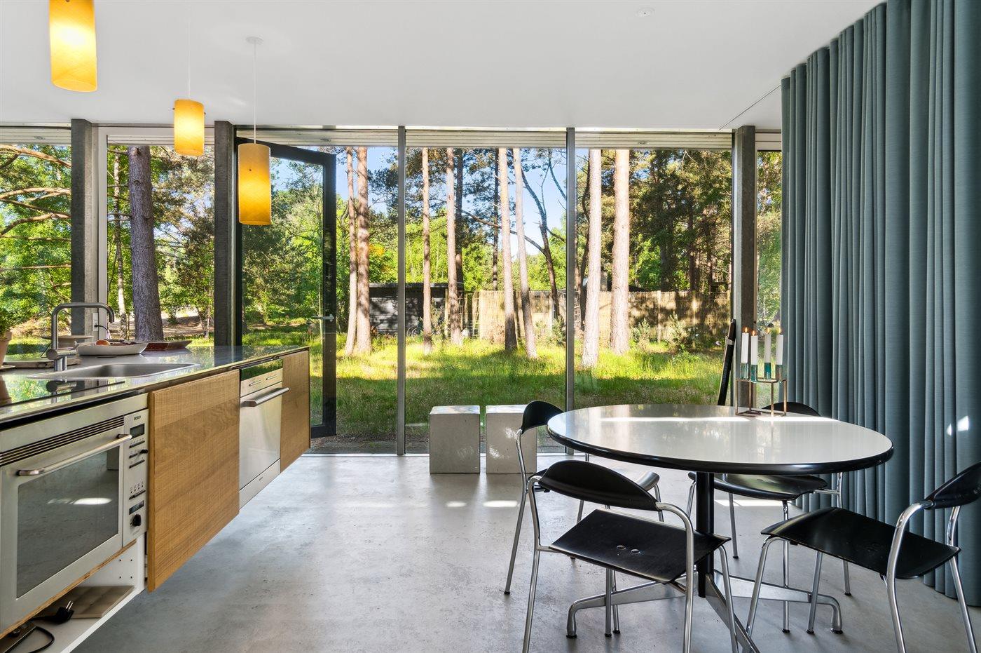 Dette er lidt af en arkitektonisk perle. Huset ligger omkranset af skov og med kun få hundrede meter til dejlig badestrand. Selve huset er indrettet meget smagfuldt med store vinduer fra gulv til loft, betongulv med gulvvarme og et meget stort køkken/alrum. Når man sidder ved spisebordet og nyder sin morgenkaffe, så kan man følge med i det rige dyreliv, hvor dyrene kommer helt tæt på huset.
