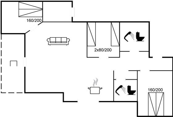 Der er i alt 3 soveværelser. Sovepladserne fordeler sig på: 4 sovepladser i dobbeltsenge. 2 sovepladser i enkeltsenge.