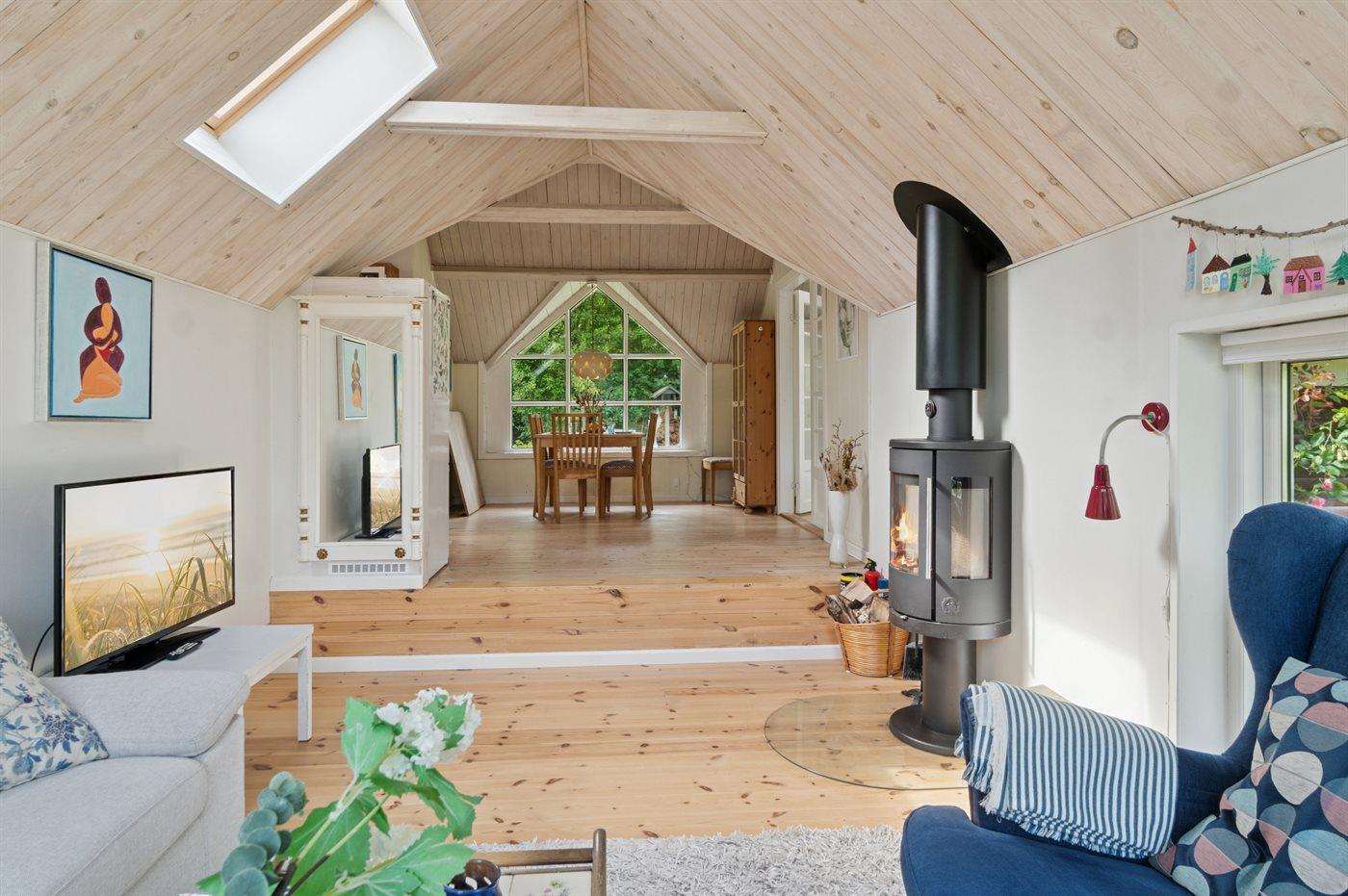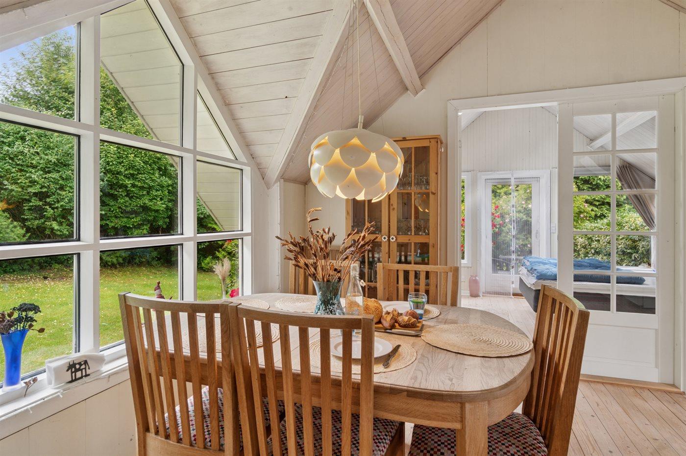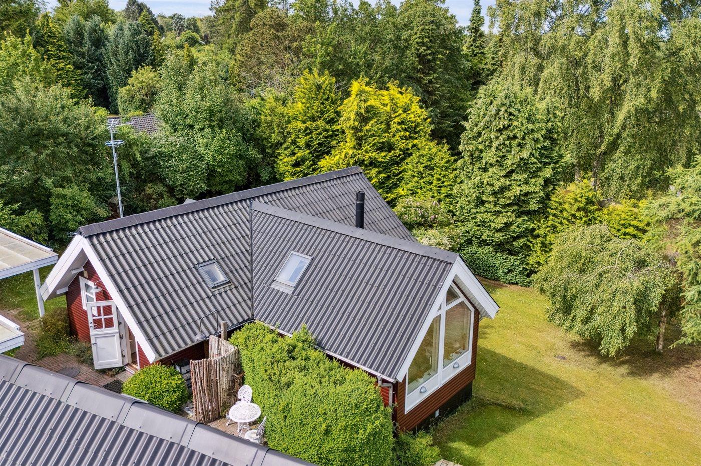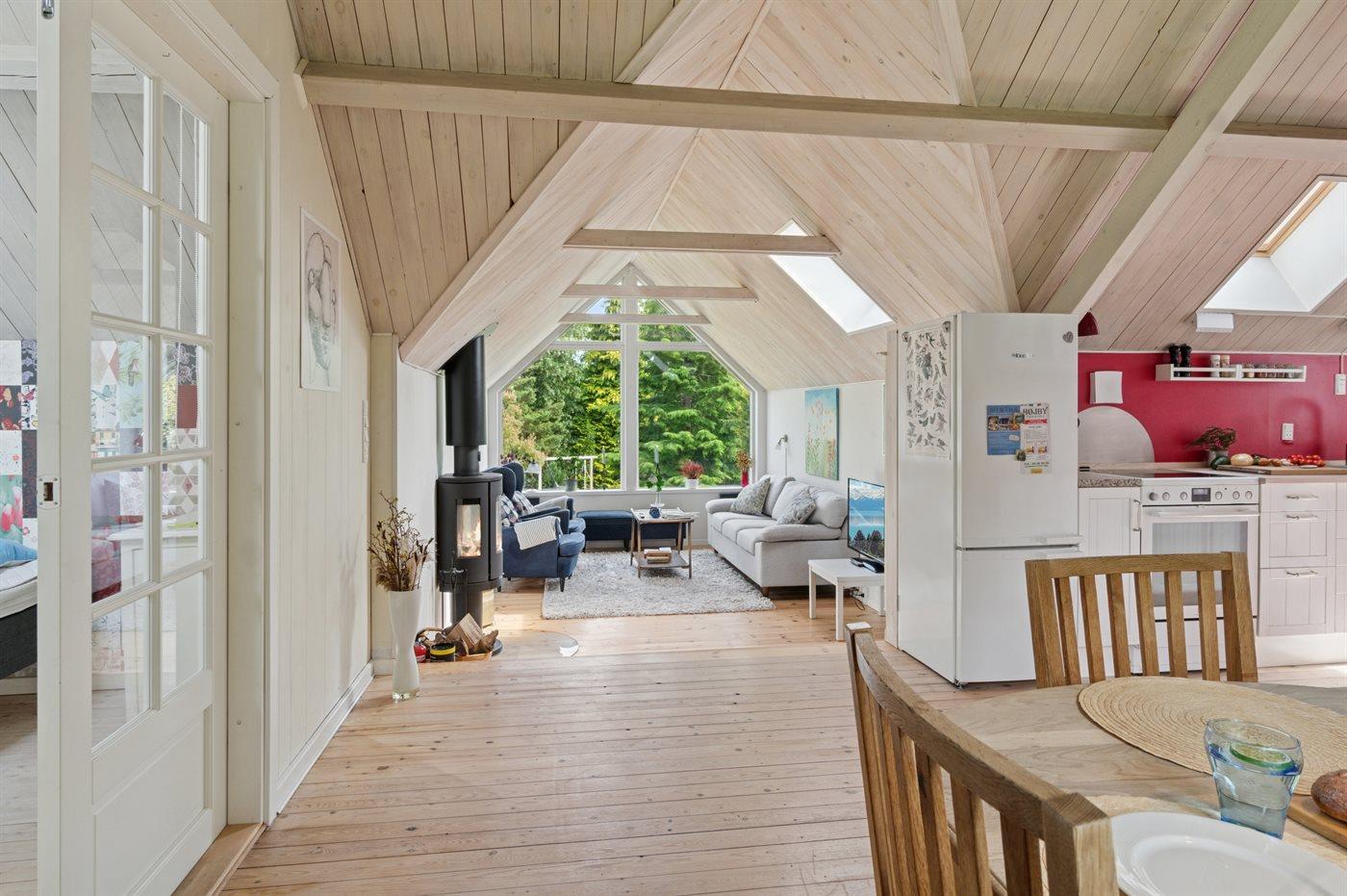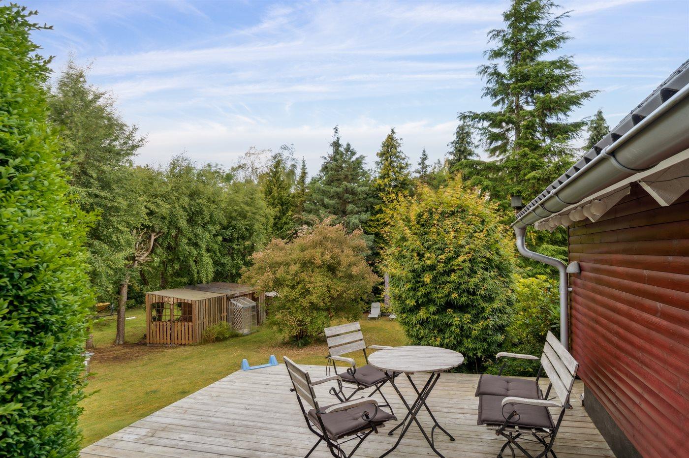 Huset indeholder et dejligt køkkenalrum i forbindelse med stuen, hvorfra udsigten over haven og trætoppene kan nydes. Rundt om huset er flere små hyggekroge, som indbyder til afslapning, og det overdækkede terrasseområde giver god mulighed for at finde skygge og læ og nyde de lange lyse sommeraftener.