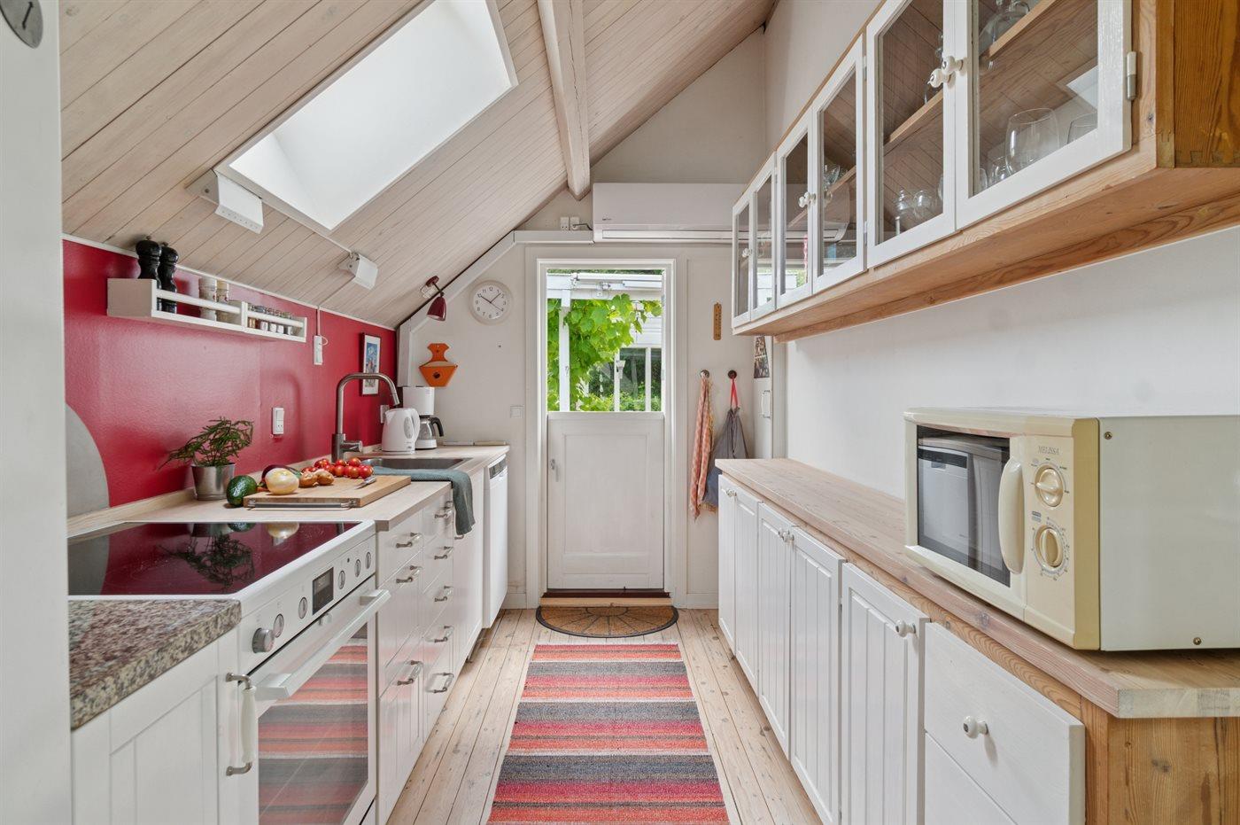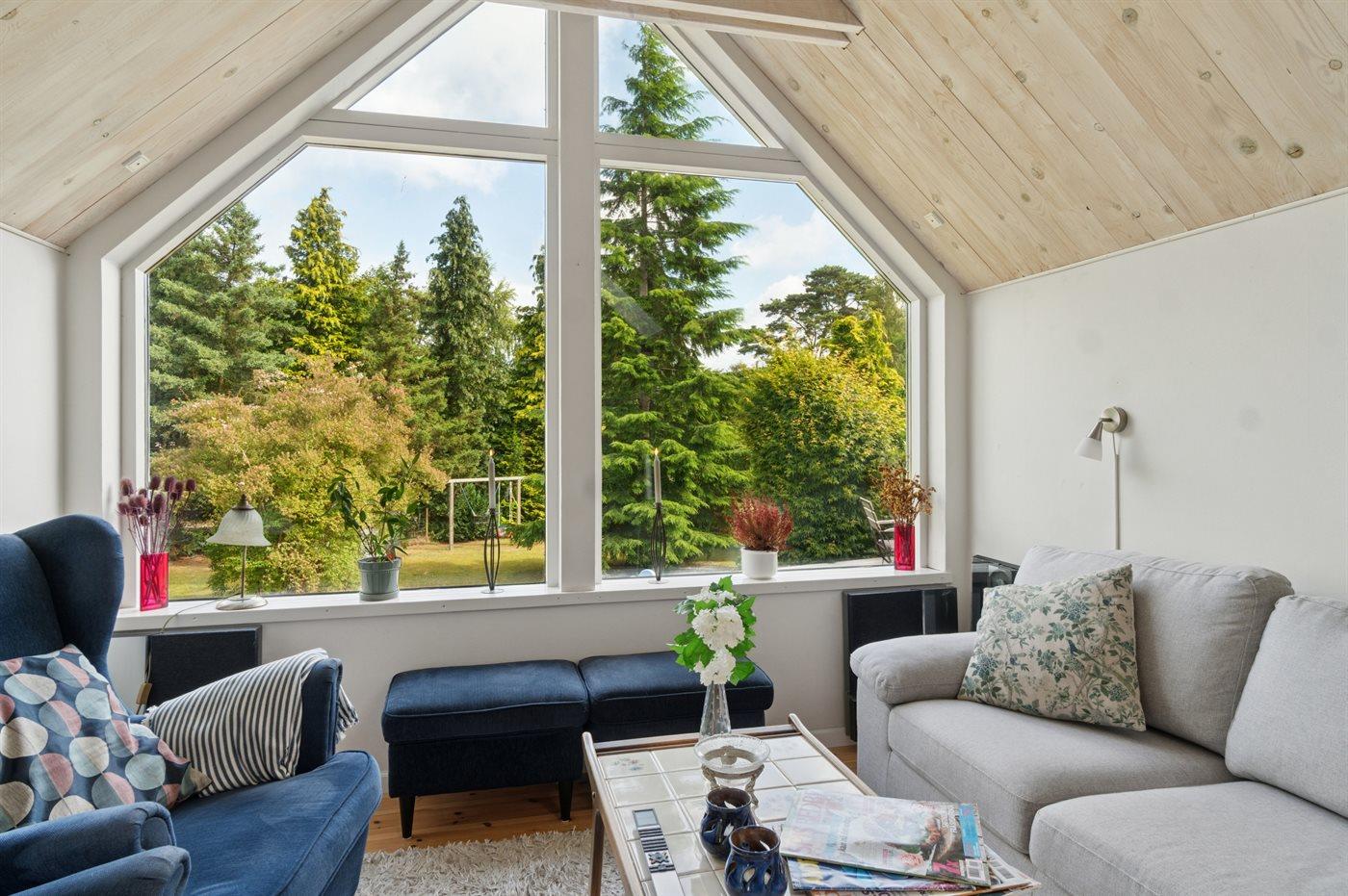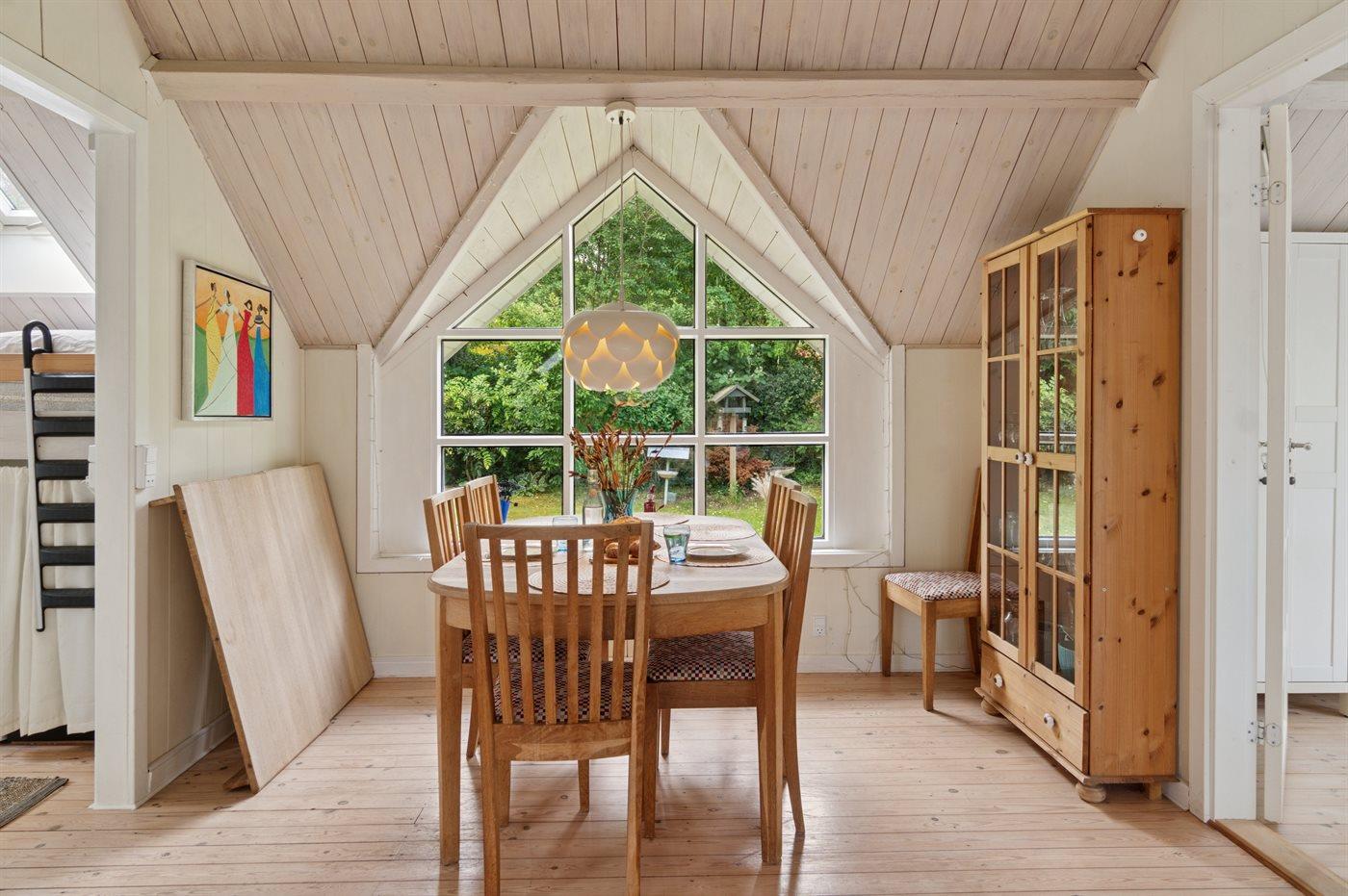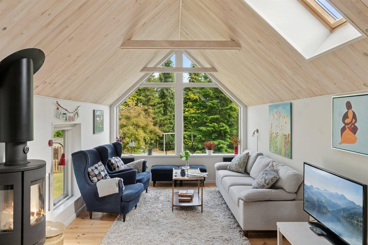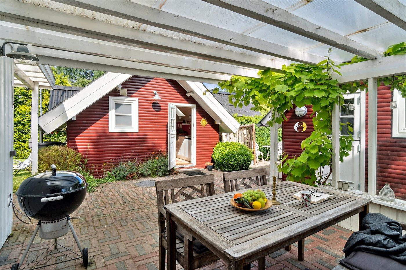 Huset indeholder et dejligt køkkenalrum i forbindelse med stuen, hvorfra udsigten over haven og trætoppene kan nydes. Rundt om huset er flere små hyggekroge, som indbyder til afslapning, og det overdækkede terrasseområde giver god mulighed for at finde skygge og læ og nyde de lange lyse sommeraftener.