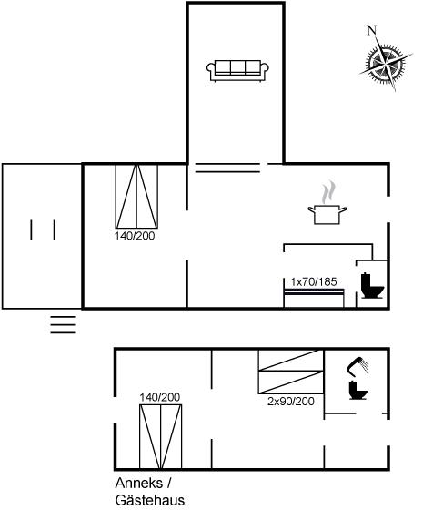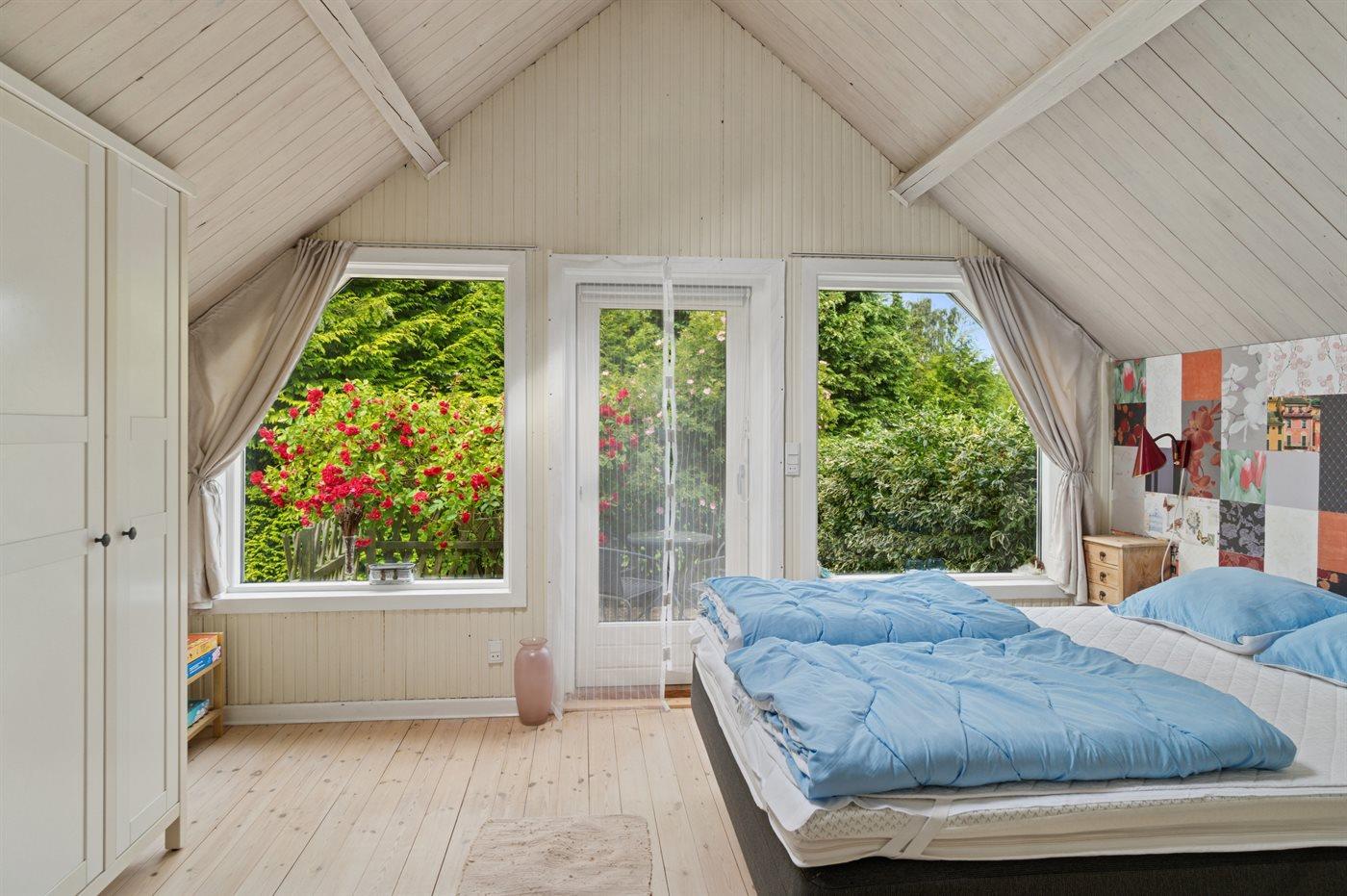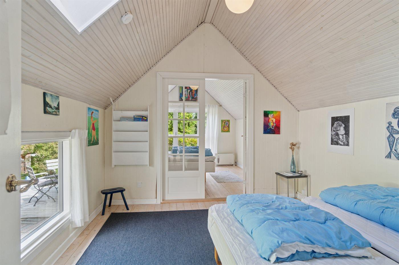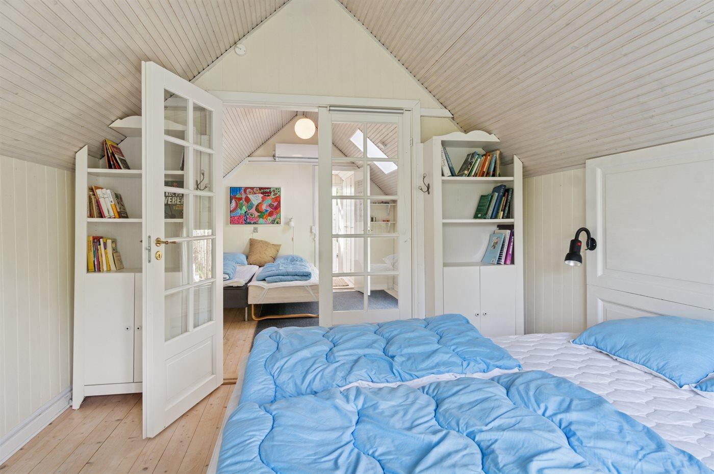 I hovedhuset er der 1 soveværelse med dobbeltseng. Der er desuden 1 soveplads i køjeseng (på grund af sengemålene på 70x185 cm. er denne soveplads bedst egnet til børn og unge). I det store anneks er der 2 soveværelser, hvor der i det ene soveværelse er en dobbeltseng, og i det andet er 2 enkeltsenge, som kan stilles sammen til den dobbeltseng. Der er separate indgange til de 2 soveværelser i annekset, dørene kan lukkes mellem de 2 soveværelser, og der kan rulles for med rullegardiner.