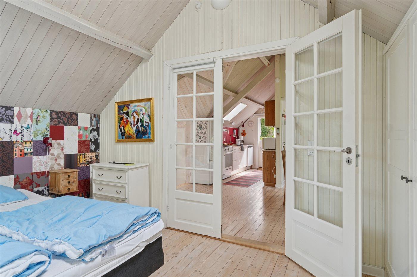 Der er i alt 3 soveværelser. Sovepladserne fordeler sig på: 6 sovepladser i dobbeltsenge.1 soveplads i køjeseng. 2 sovepladser i sovesofa (dobbelt). 4 af disse sovepladser befinder sig i et anneks, 1 soveplads findes i en mellemgang og 2 sovepladser befinder sig i stuen.