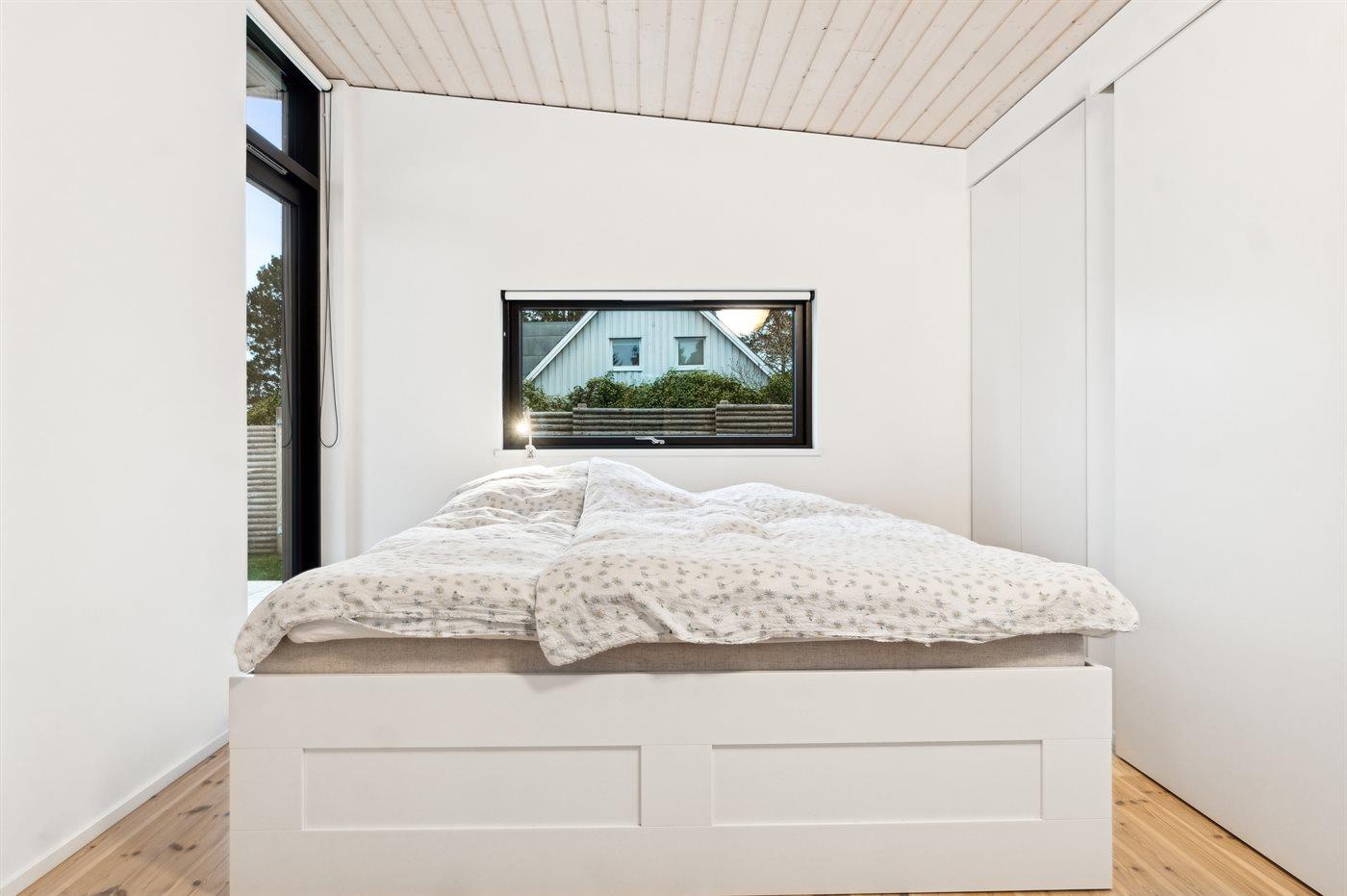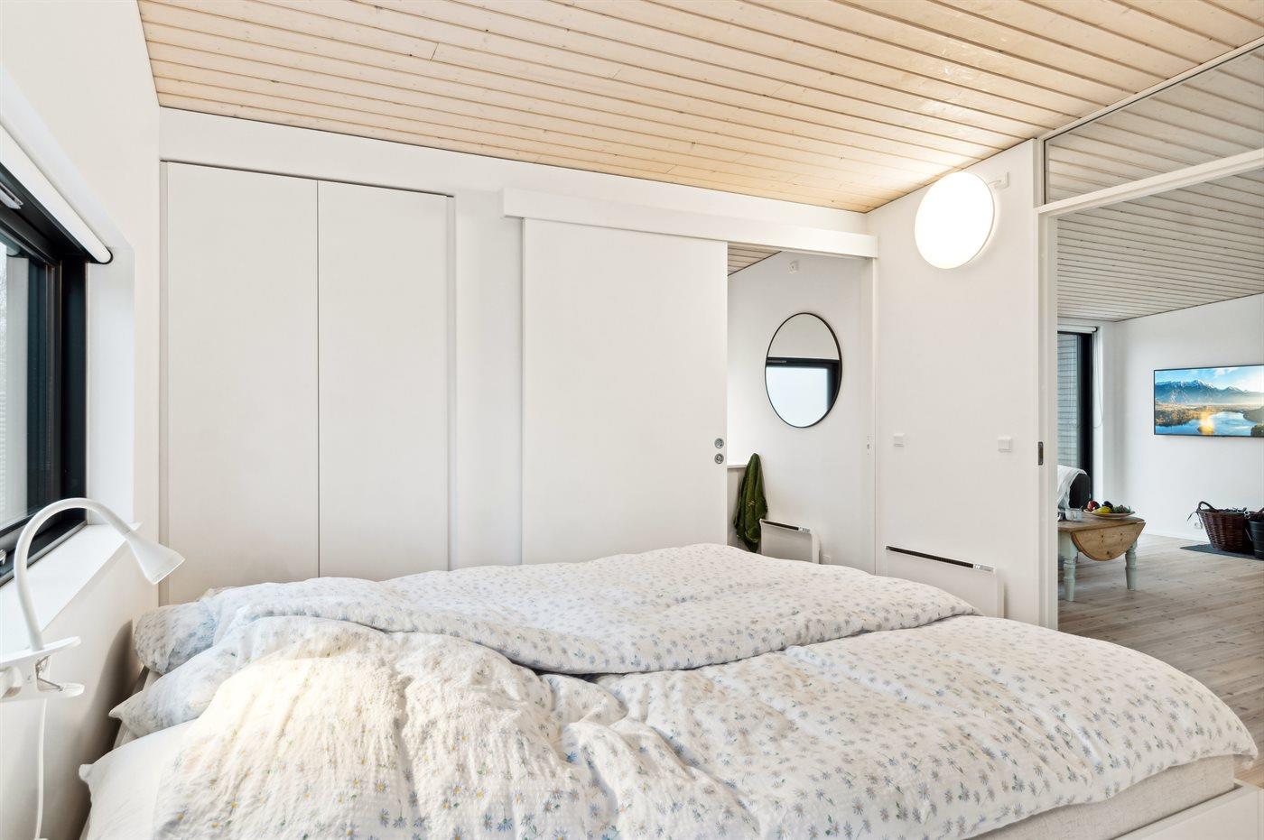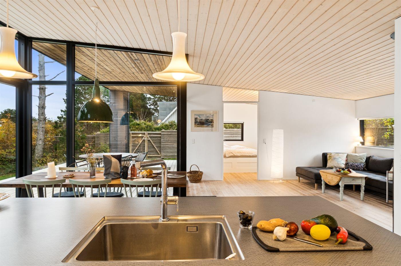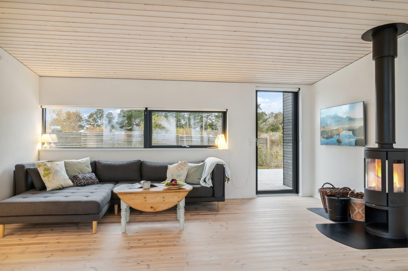 Huset er opført i 2022 og fremstår lyst og moderne med masser af lysindfald fra de store vinduespartier. Det store, moderne køkkenalrum i åben forbindelse med stuen og med udgang til det store terrasseareal er det naturlige samlingssted. En del af terrassen er overdækket. Der er 2 gode soveværelser, som begge har udgang til terrassen. Der er 2 badeværelser med bruseniche og gulvvarme. Der er desuden vaskemaskine. Huset opvarmes energivenligt med luft-til-luftvarme pumpe, og der er desuden brændeovn. Der er udendørs bruser.