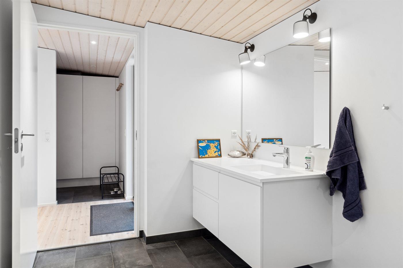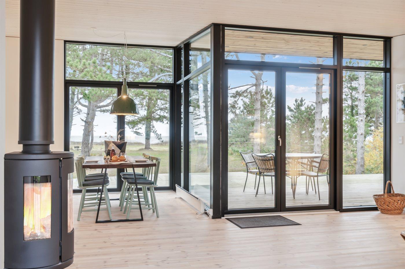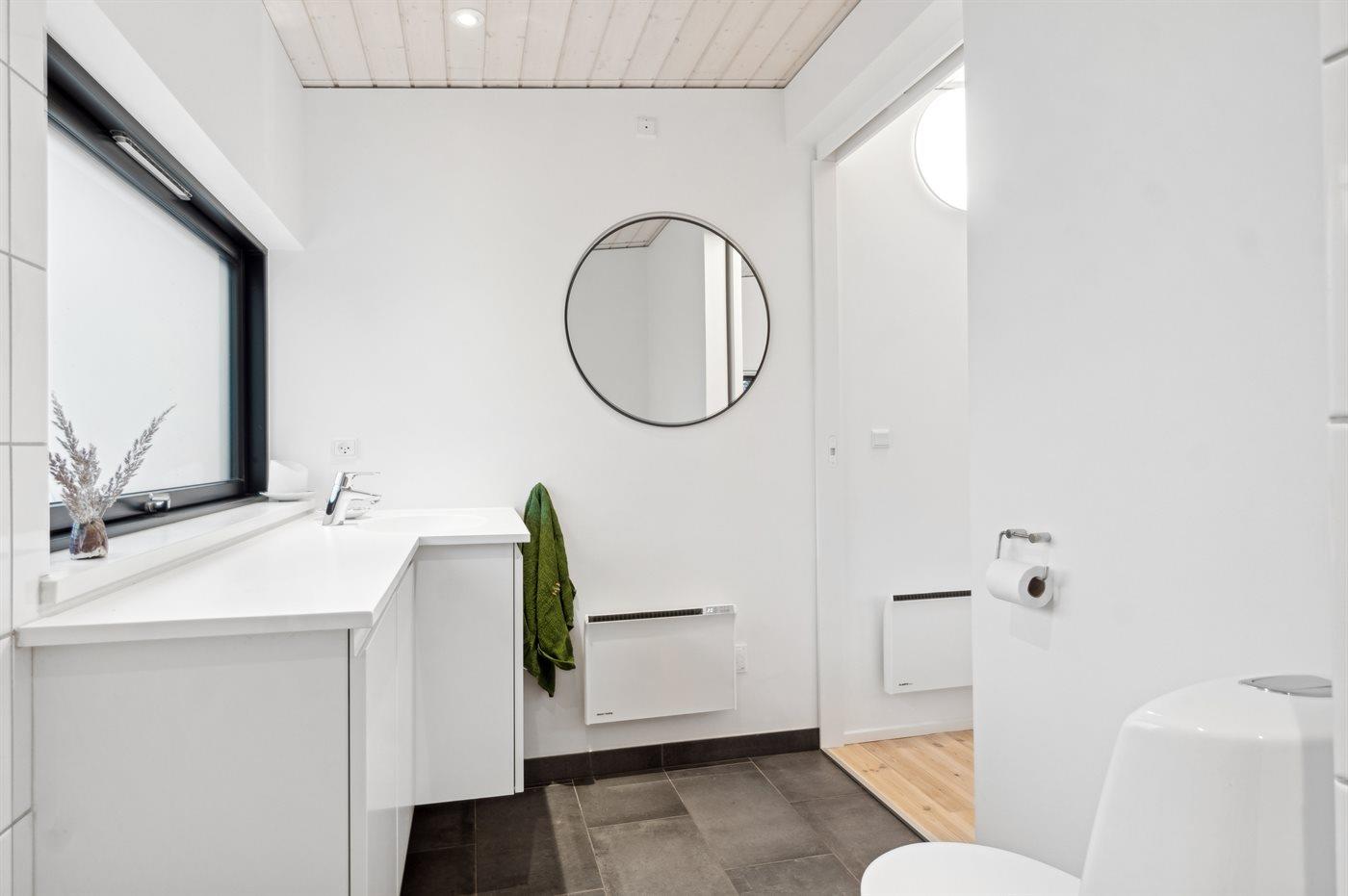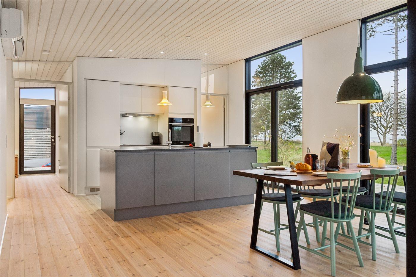 Huset er opført i 2022 og fremstår lyst og moderne med masser af lysindfald fra de store vinduespartier. Det store, moderne køkkenalrum i åben forbindelse med stuen og med udgang til det store terrasseareal er det naturlige samlingssted. En del af terrassen er overdækket. Der er 2 gode soveværelser, som begge har udgang til terrassen. Der er 2 badeværelser med bruseniche og gulvvarme. Der er desuden vaskemaskine. Huset opvarmes energivenligt med luft-til-luftvarme pumpe, og der er desuden brændeovn. Der er udendørs bruser.