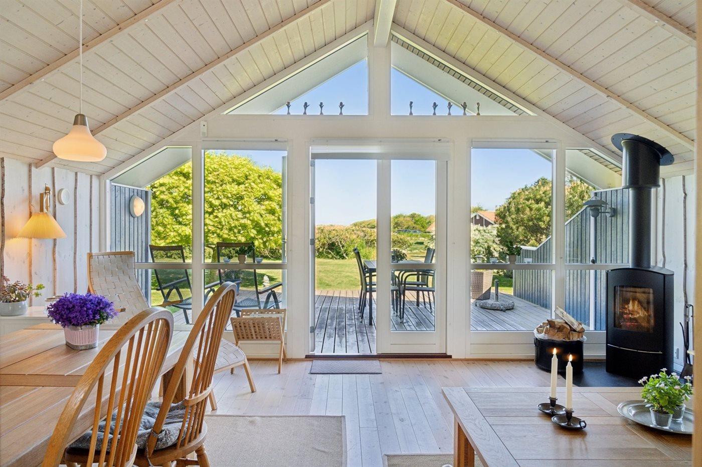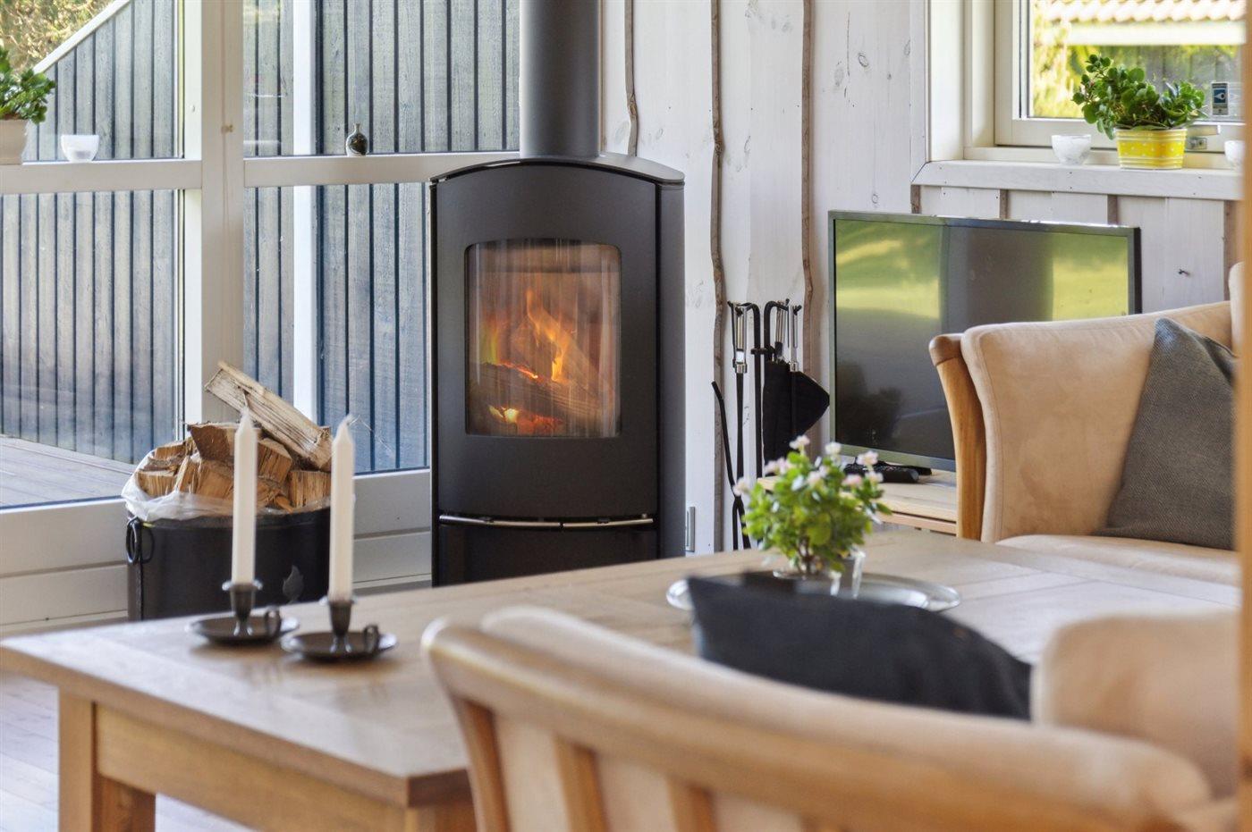 Huset opvarmes energivenligt med luft-til-luft varmepumpe og på køligere dage sørger brændeovnen for hygge og varme.