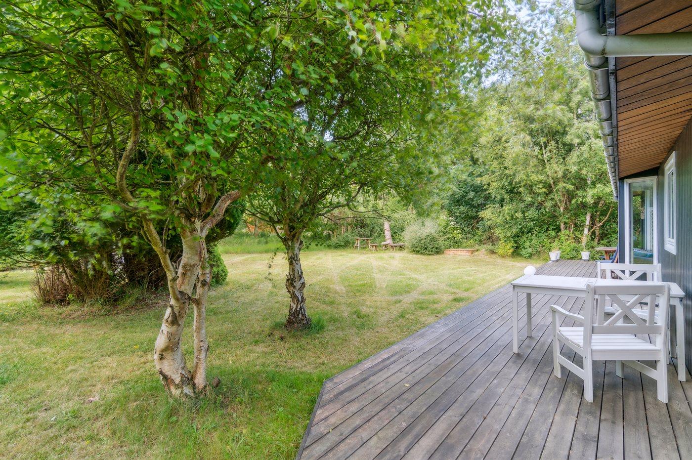Ferieboligen er beliggende på en 1277 m² stor havegrund. Der er 350 m til havet. Der er en badebro i nærheden. Nærmeste forretning er beliggende i en afstand af 2850 m. Der er en golfbane i en afstand af 7750 m. Til ferieboligen hører 45 m² terrasseareal. Desuden er der 20 m² overdækket terrasse. Sandkasse. Bålsted. Grill til rådighed. Der er installeret stik til opladning af elbil. Type 2 stik. Med 11 kW ladeeffekt. Parkering ved ferieboligen.