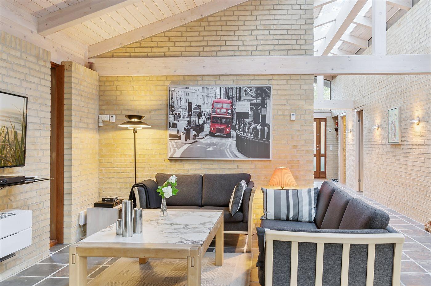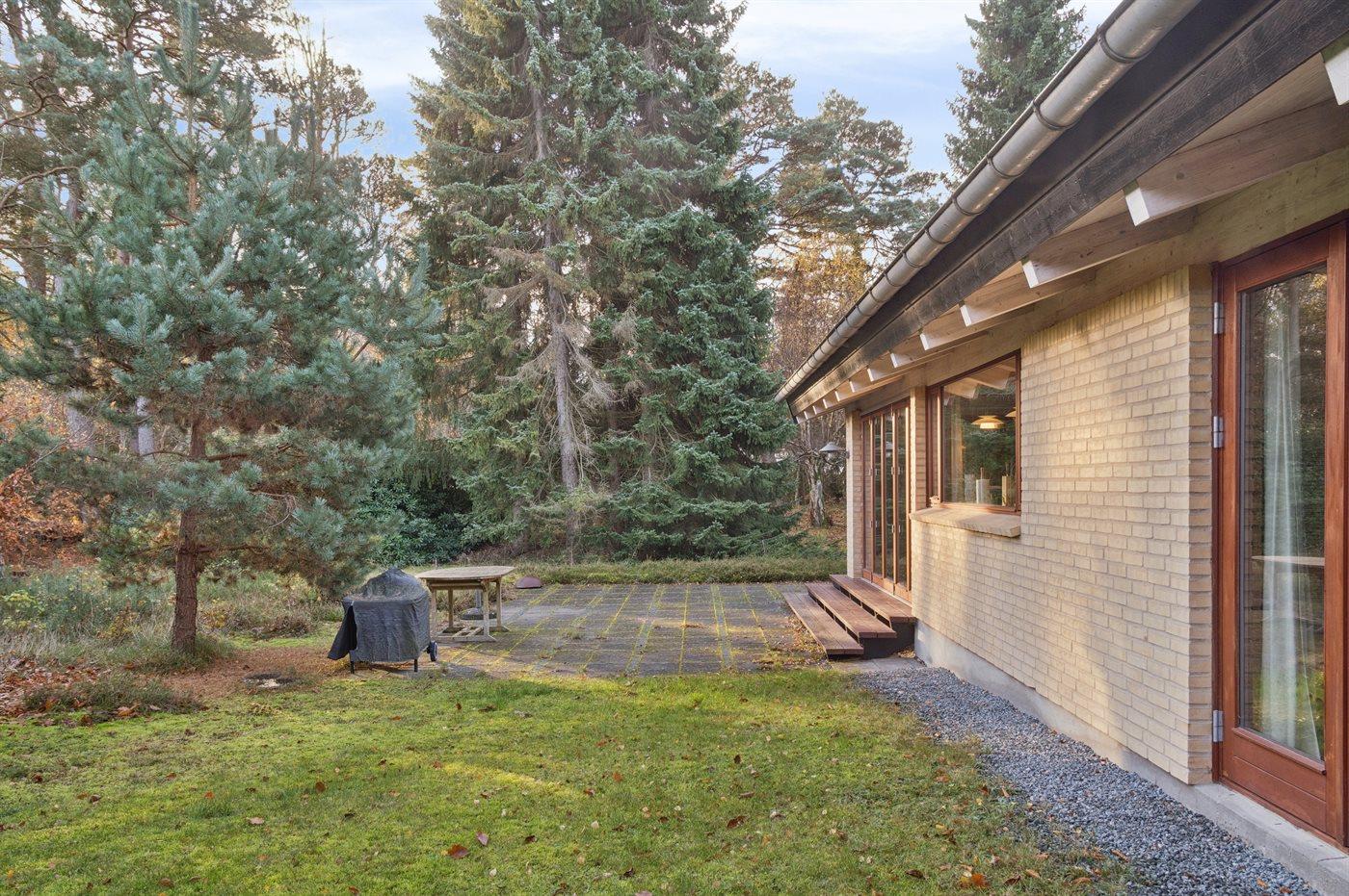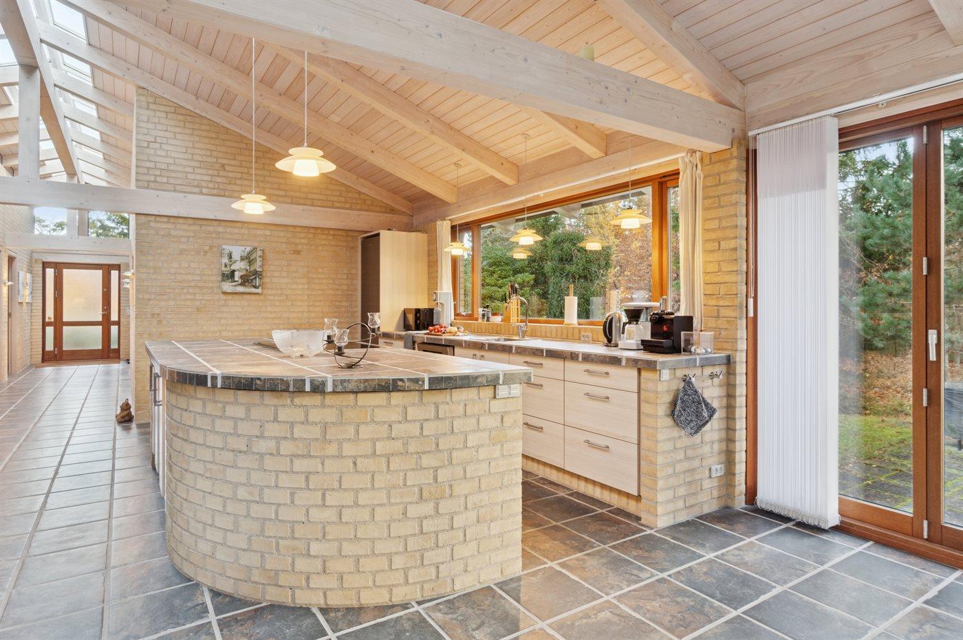 Det store køkkenalrum ligger i åben forbindelse med stuen, hvor der er en dejlig spiseplads og to sofagrupper med god mulighed for at hygge sig og være sammen med venner og familie. Herfra er der udgang til en dejlig syd- og østvendt terrasse og til den store skønne naturgrund med lyng og høje træer, som omkranser grunden.