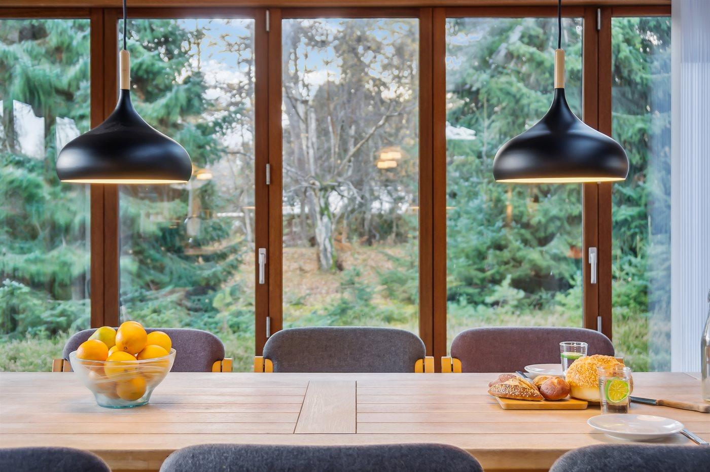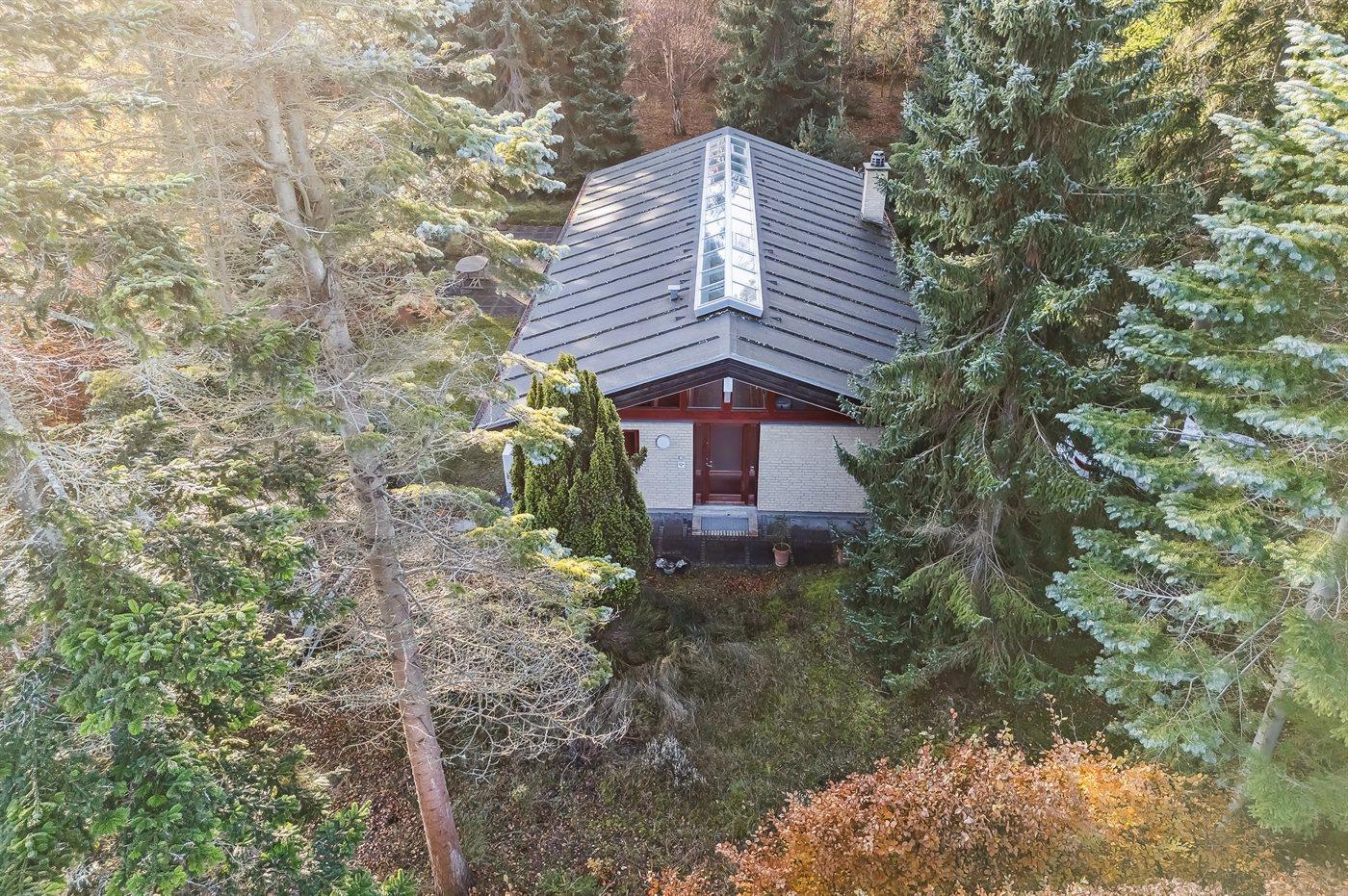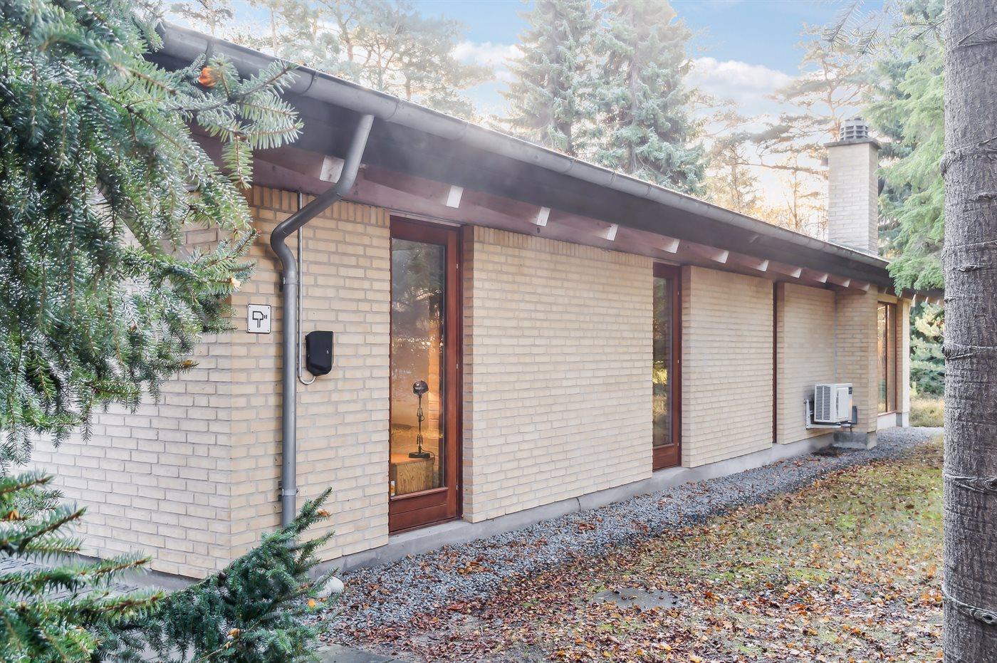 Det store køkkenalrum ligger i åben forbindelse med stuen, hvor der er en dejlig spiseplads og to sofagrupper med god mulighed for at hygge sig og være sammen med venner og familie. Herfra er der udgang til en dejlig syd- og østvendt terrasse og til den store skønne naturgrund med lyng og høje træer, som omkranser grunden.