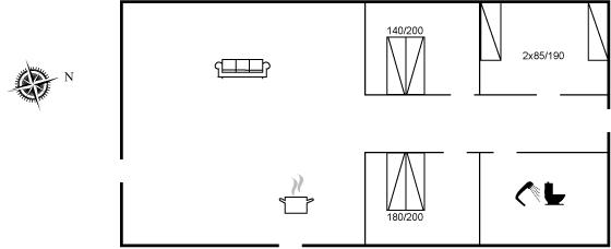 Der er i alt 3 soveværelser. Sovepladserne fordeler sig på: 4 sovepladser i dobbeltsenge. 2 sovepladser i enkeltsenge. Derudover er der 1 stk. barneseng.