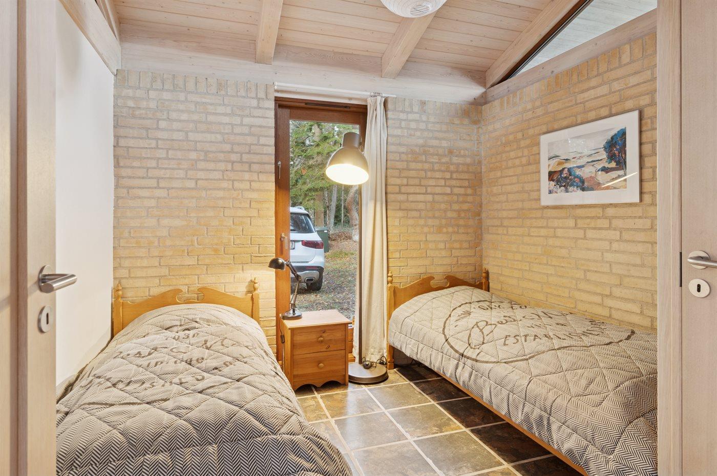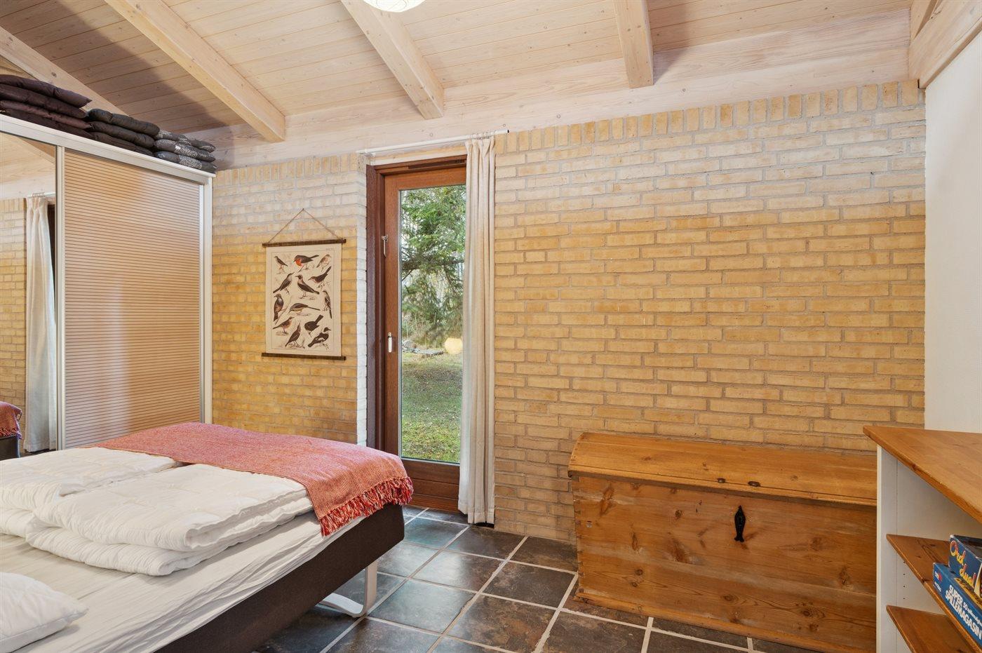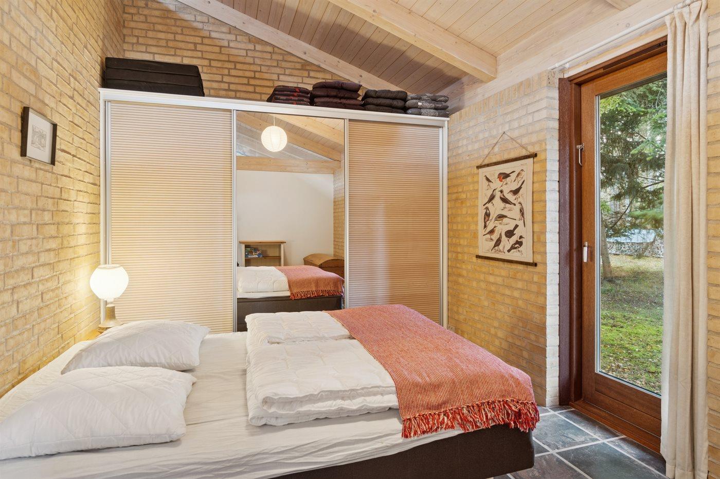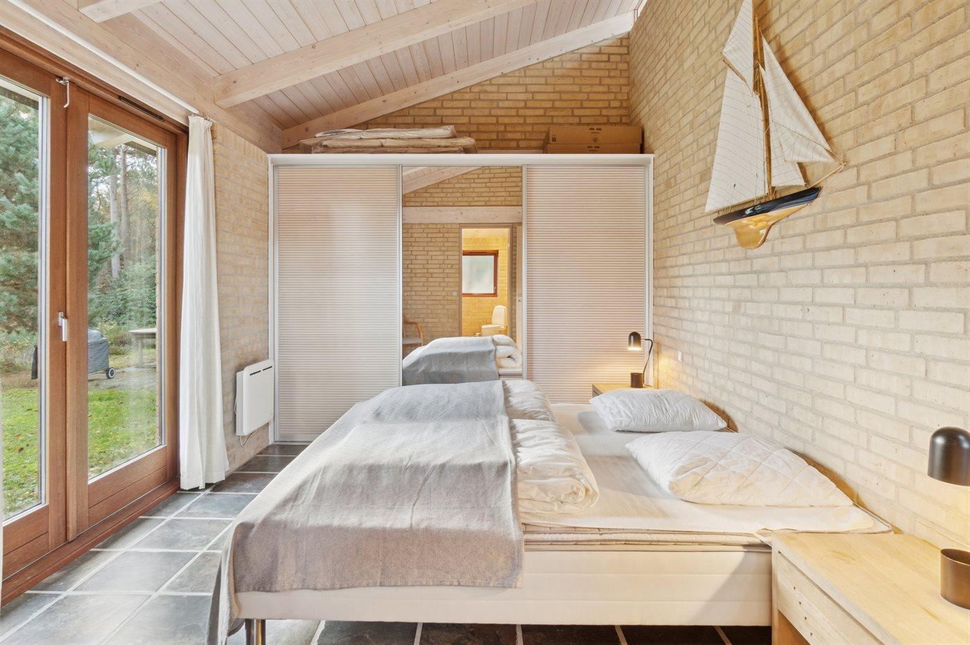 Der findes 3 soveværelser med hver 2 sovepladser og fra alle soveværelser er der udgang til haven. I de 2 af soveværelserne er der dobbeltsenge og i 1 af soveværelserne er der 2 enkeltsenge (måler 85x190 cm og er bedst egnede til børn og unge mennesker). Badeværelset er med bruseniche, gulvvarme og vaskemaskine.