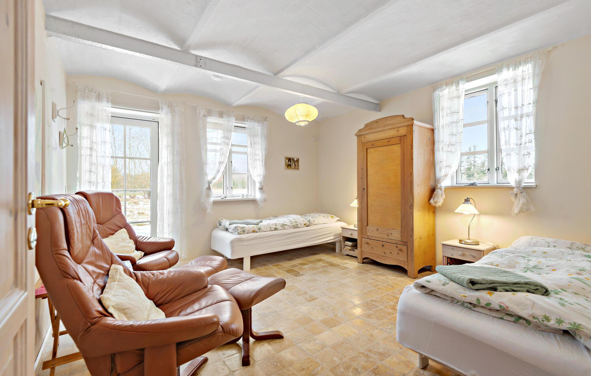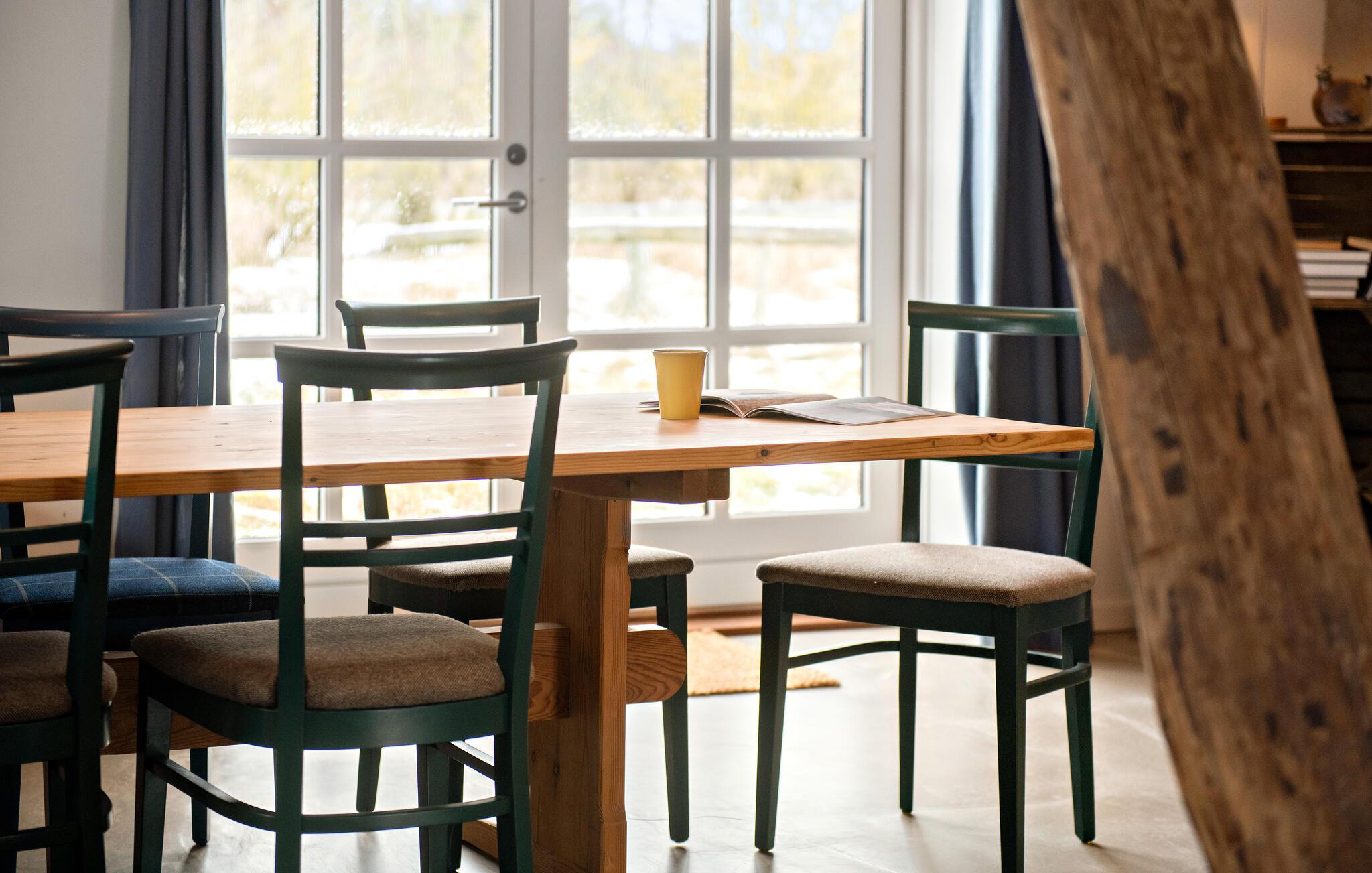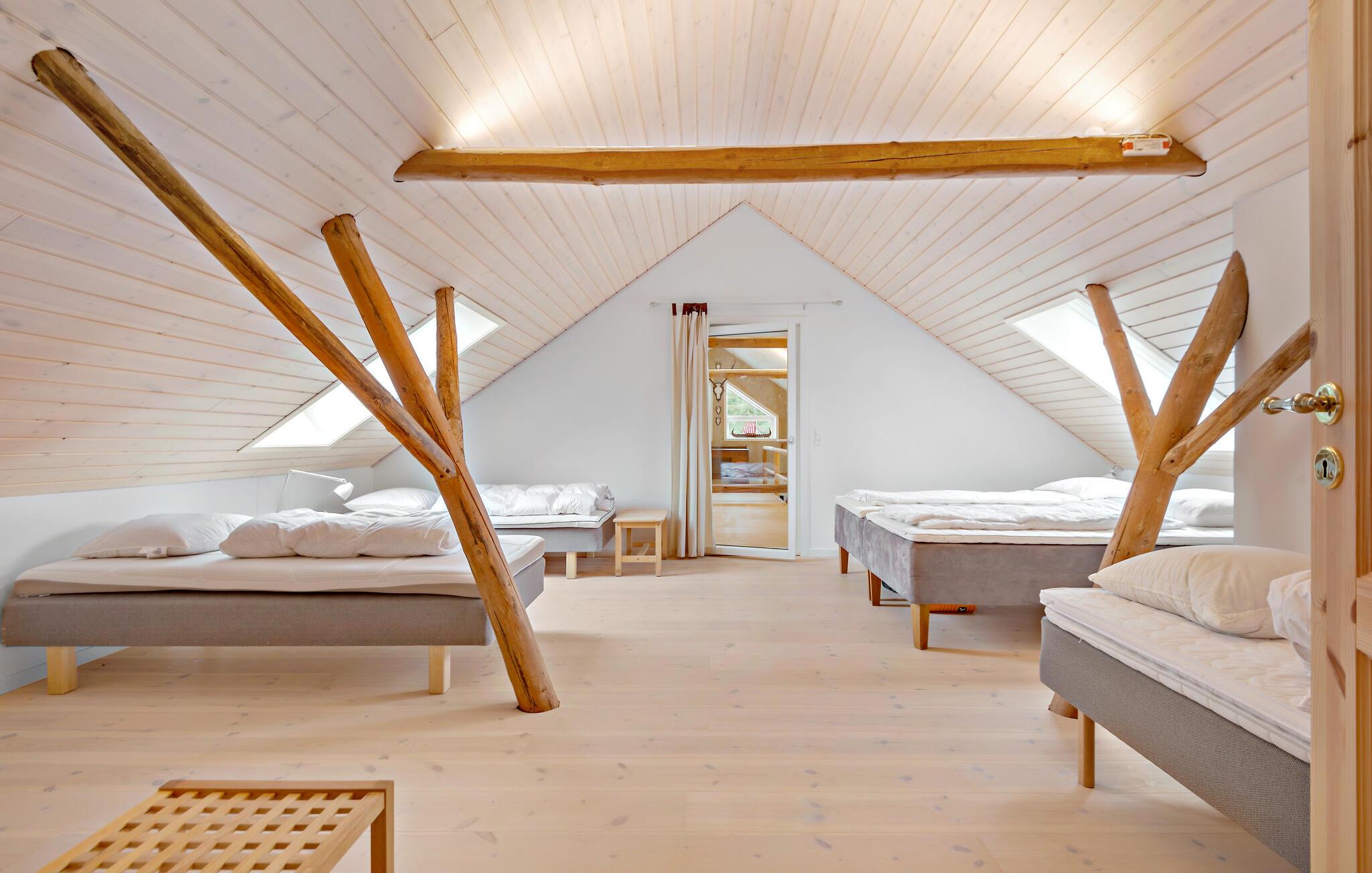 I denne indbydende bolig får I masser af plads til en ferie med en større vennegruppe eller den udvidede familie. Indretningen er fremdeles hjemlig med de tydelige træbjælker, det store spisebord og den særlige ruminddeling med den åbne første sal. Interiøret præges af de mange træelementer, der giver boligen et naturligt udtryk og giver et praj om, at I bor ude på landet. Her kan I hygge jer med fællessang ved klaveret og med fælles madlavning i det veludstyrede køkken.