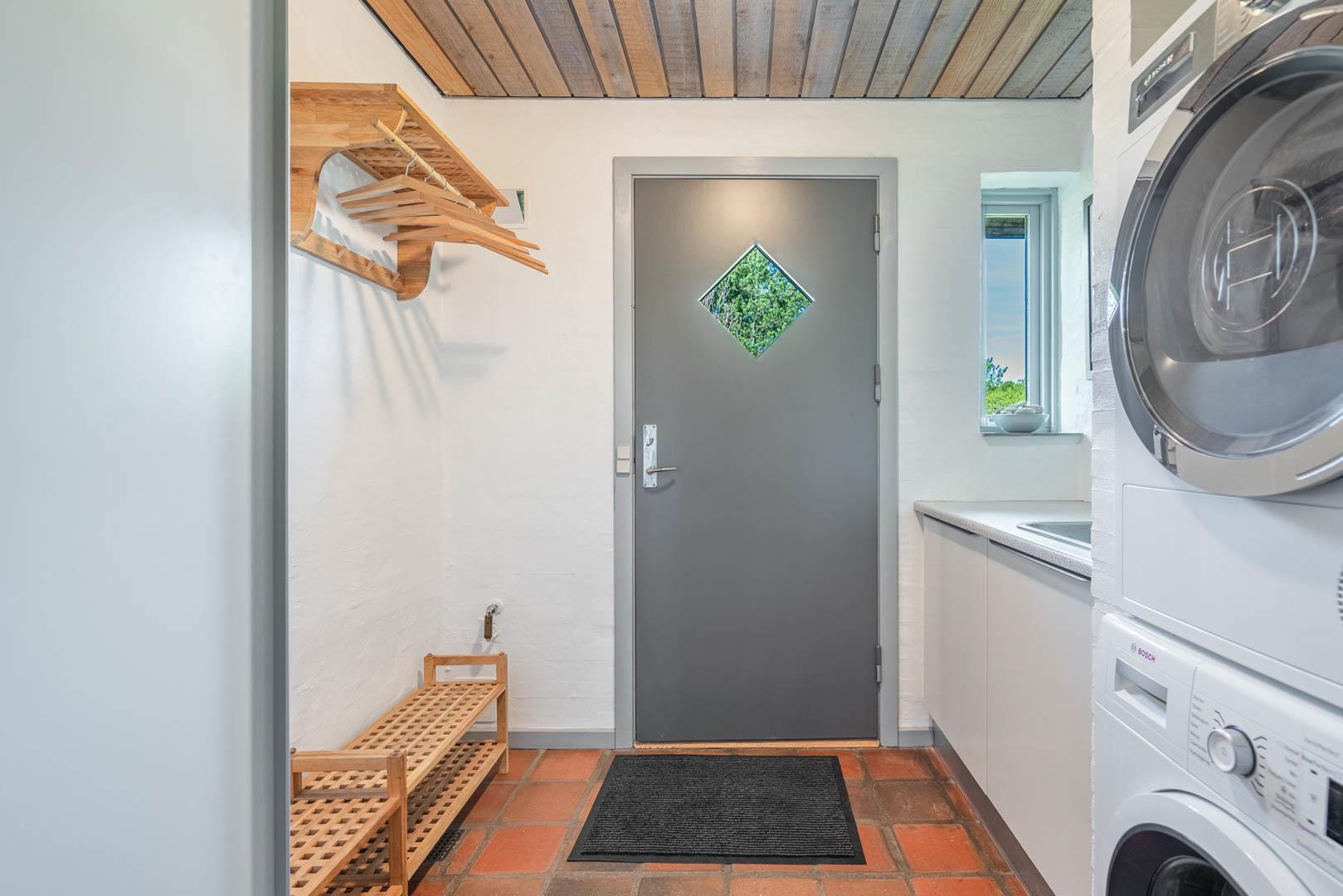 Der er desuden både vaskemaskine og tørretumbler til rådighed, og vandforbruget er inkluderet i lejen – praktisk og bekvemt.