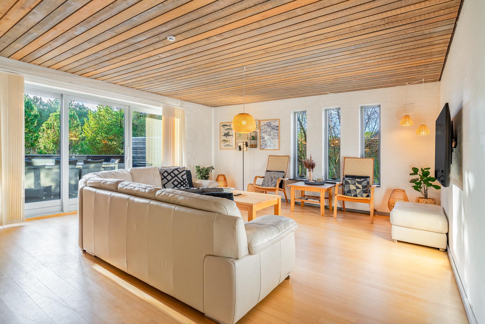 Sommerhusets samlingspunkt er den store stue med brændeovn og gulvvarme, hvor I kan slappe af efter en frisk gåtur på stranden.