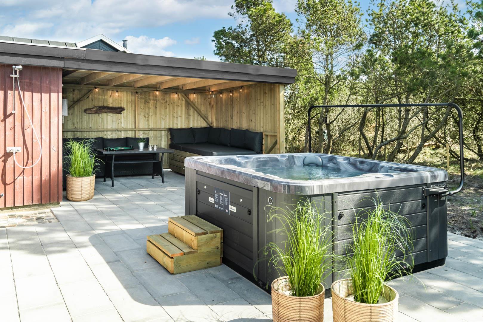 Et særligt højdepunkt er den udendørs spa, hvor I kan nyde det varme vand og udsigten til naturen året rundt. En udendørs bruser giver ekstra komfort på varme sommerdage.