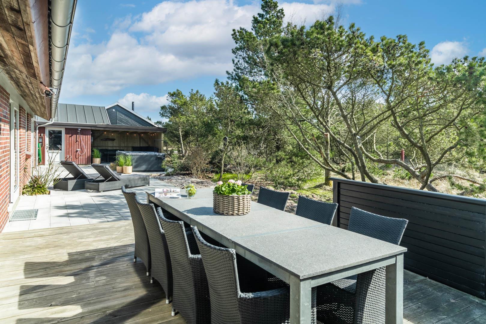 Den overdækkede terrasse bliver hurtigt feriens samlingspunkt – perfekt til morgenkaffen i solen, hyggelige grillaftener eller afslapning med et glas vin i hånden.