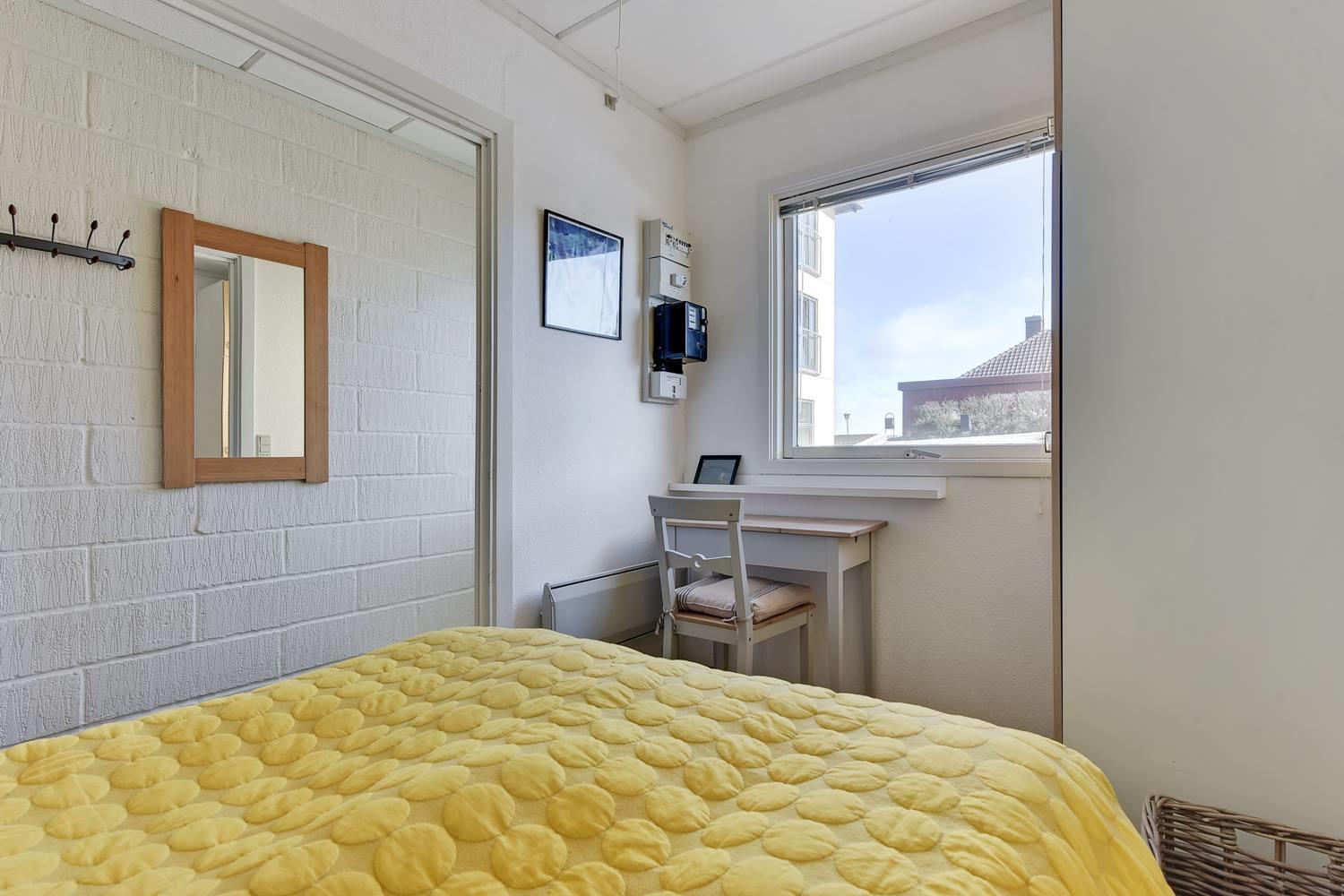 I soveværelset står en komfortabel dobbeltseng, og badeværelset har gulvvarme, som giver en ekstra behagelig oplevelse på kølige dage.