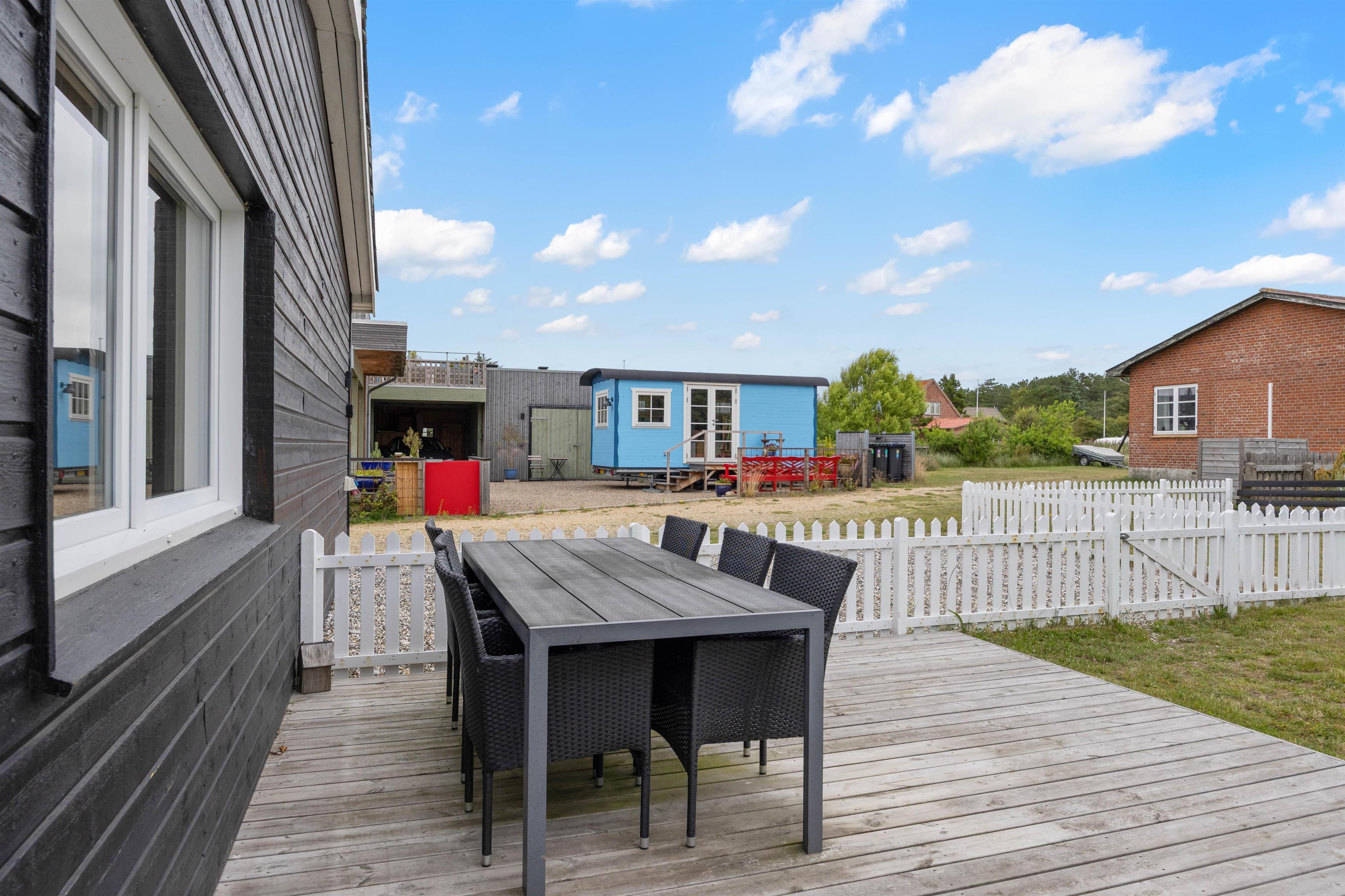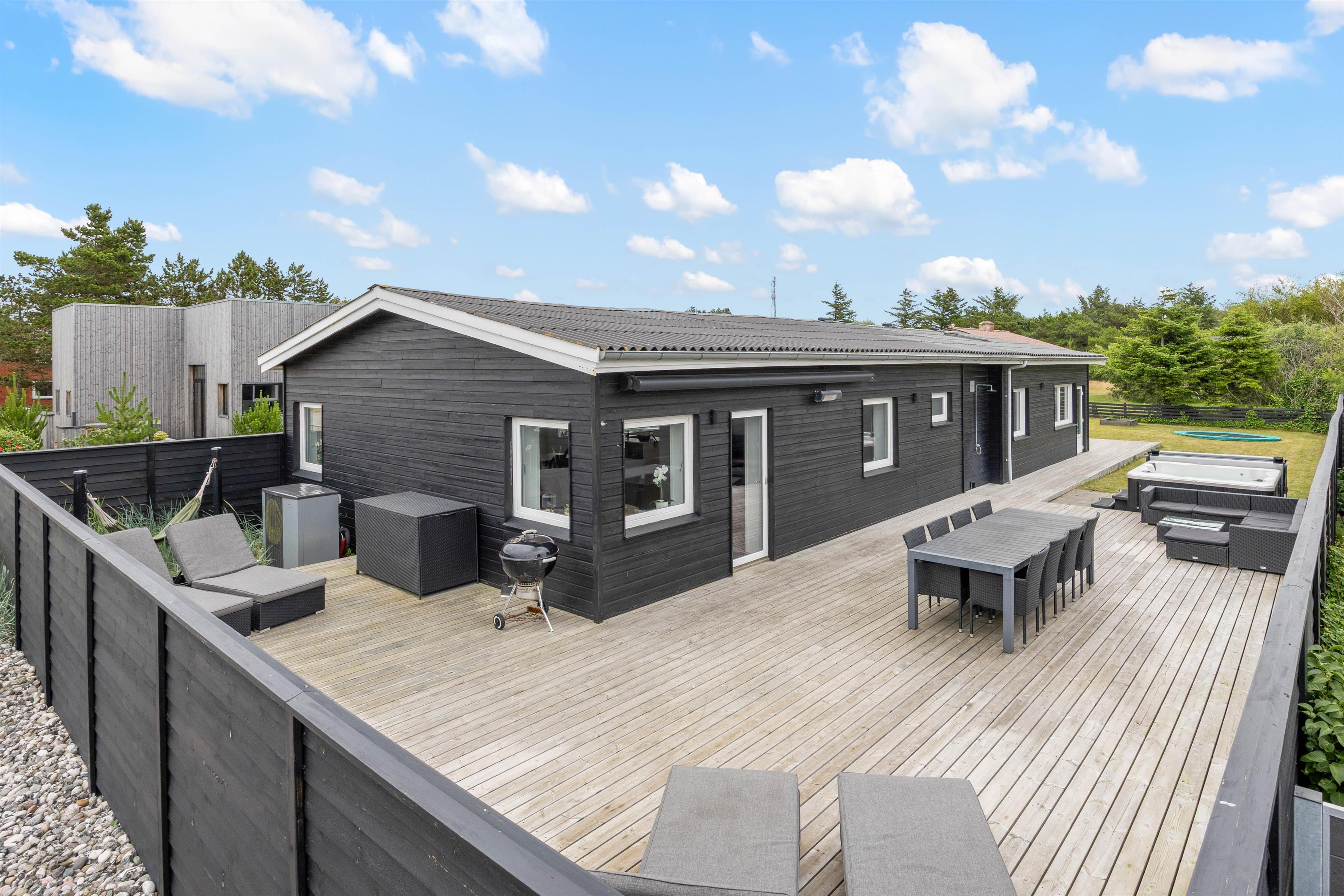 Udearealerne på Borndalvej 7 indbyder til afslappende stunder i det danske sommervejr. Et af feriehusets højdepunkter er den varme udespa - perfekt i et dejligt udemiljø med loungesæt, havemøbler og udebruser, der kan bruges fra april til november. Den store markise skaber skygge og læ for vinden. Nyd de lune sommeraftner med grillmad tilberedt på husets kulgrill og afslut med en gåtur langs Vesterhavet – dét er ægte ferie.