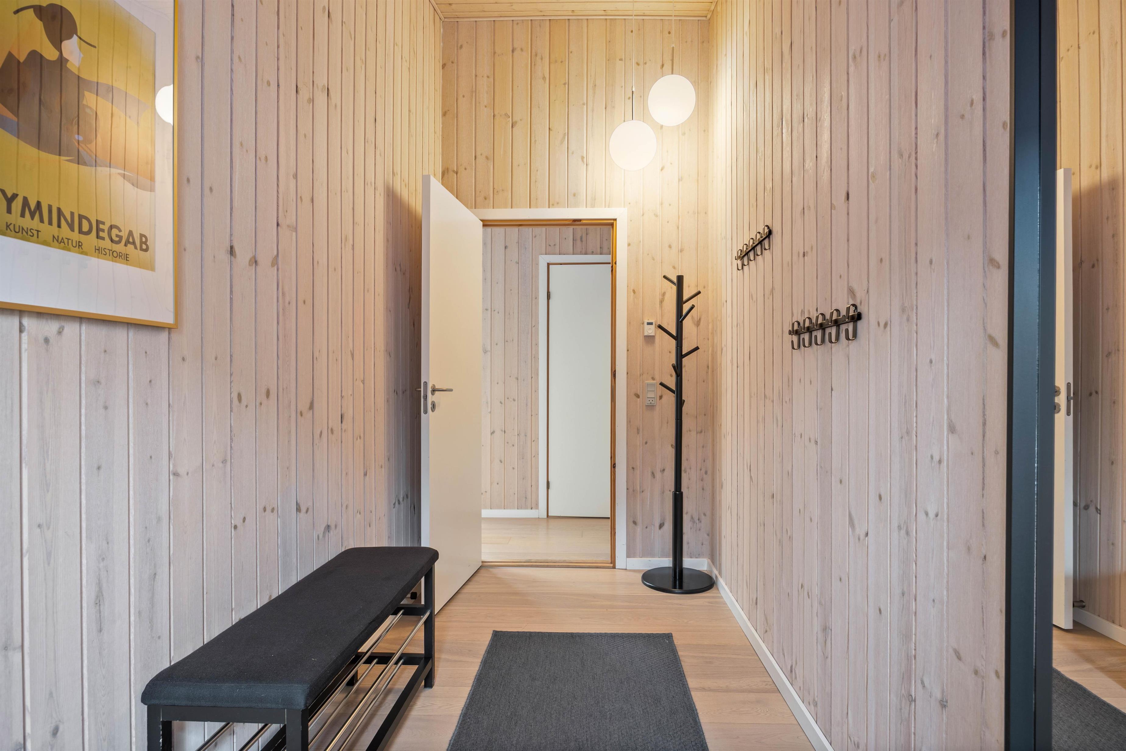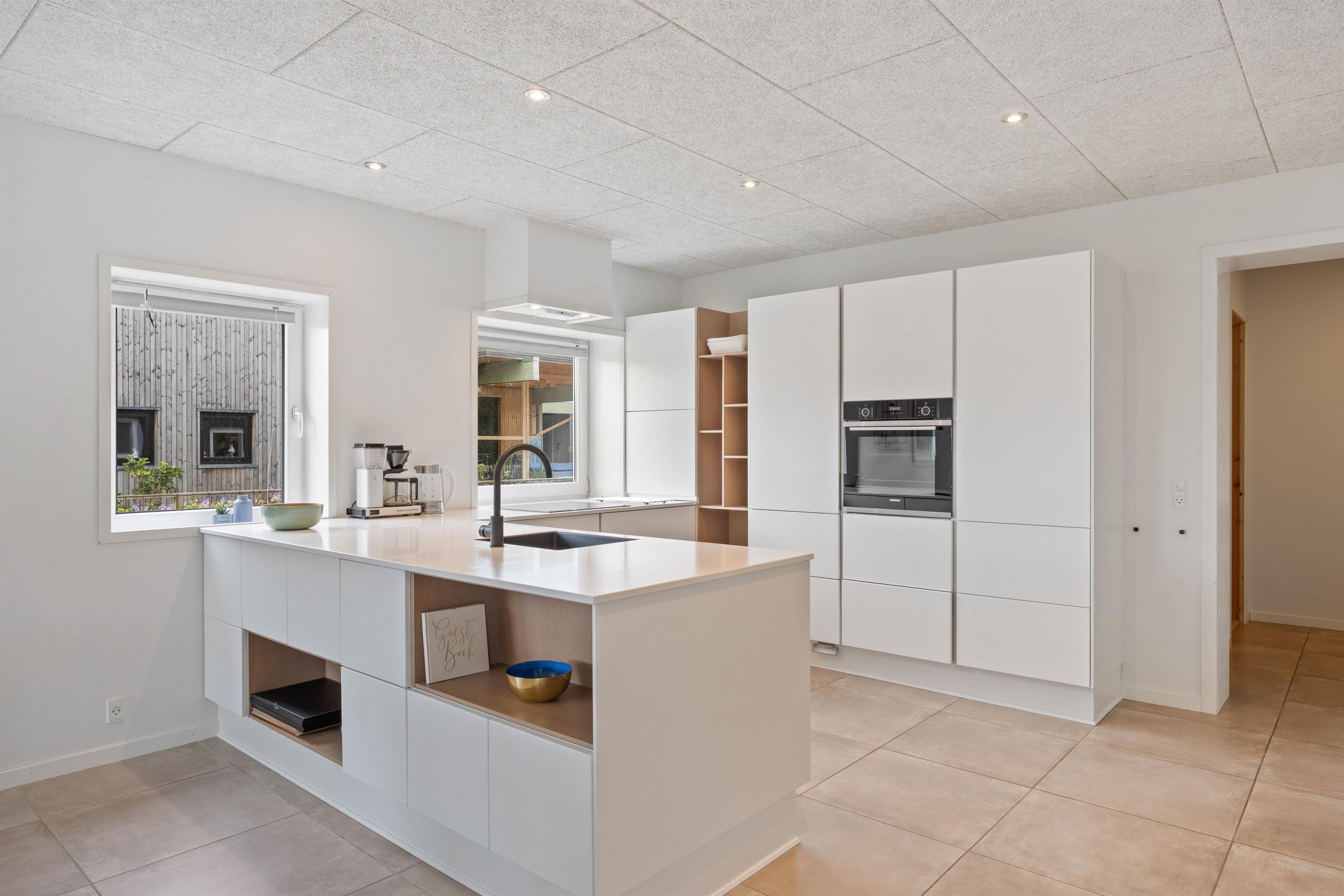 Feriehusets samlingspunkt er det skønne rummelige køkkenalrum, som binder stue og køkken sammen. Indretning er holdt i rolige nuancer med masser af naturligt lys, samt troldtekt der sørger for en god akustik. Her kan I holde spilleaftner, slappe af og tilberede lækre retter i det veludstyrede køkken. Året rundt sikrer varmepumpen jer et behageligt indeklima, og på badeværelset finder I både vaskemaskine og tørretumbler, særligt praktisk med småbørn.