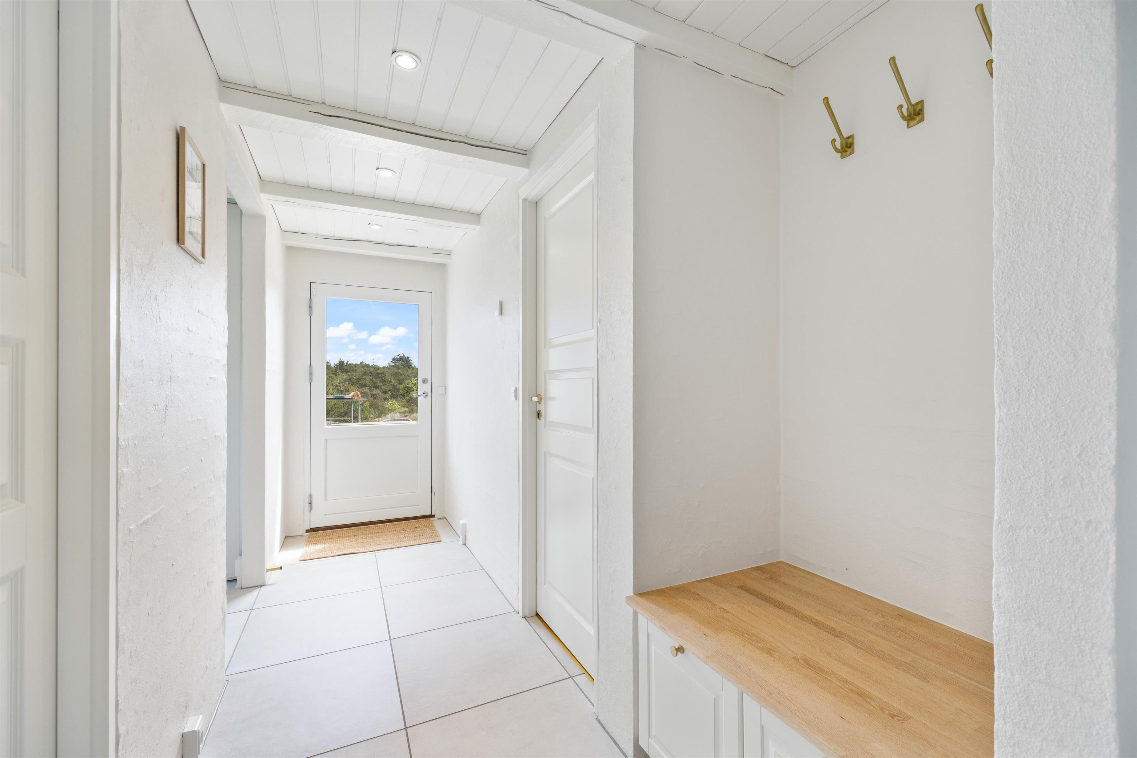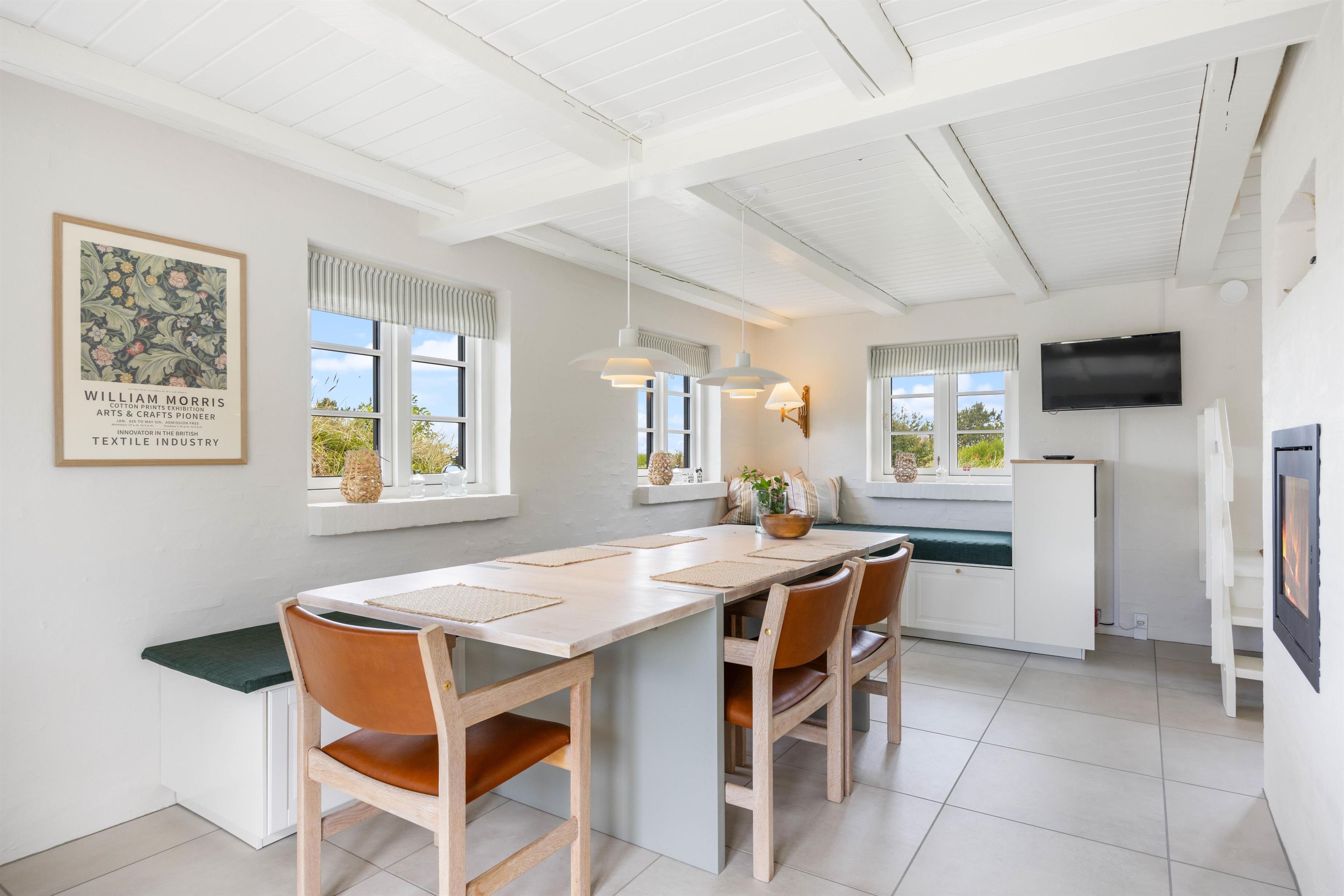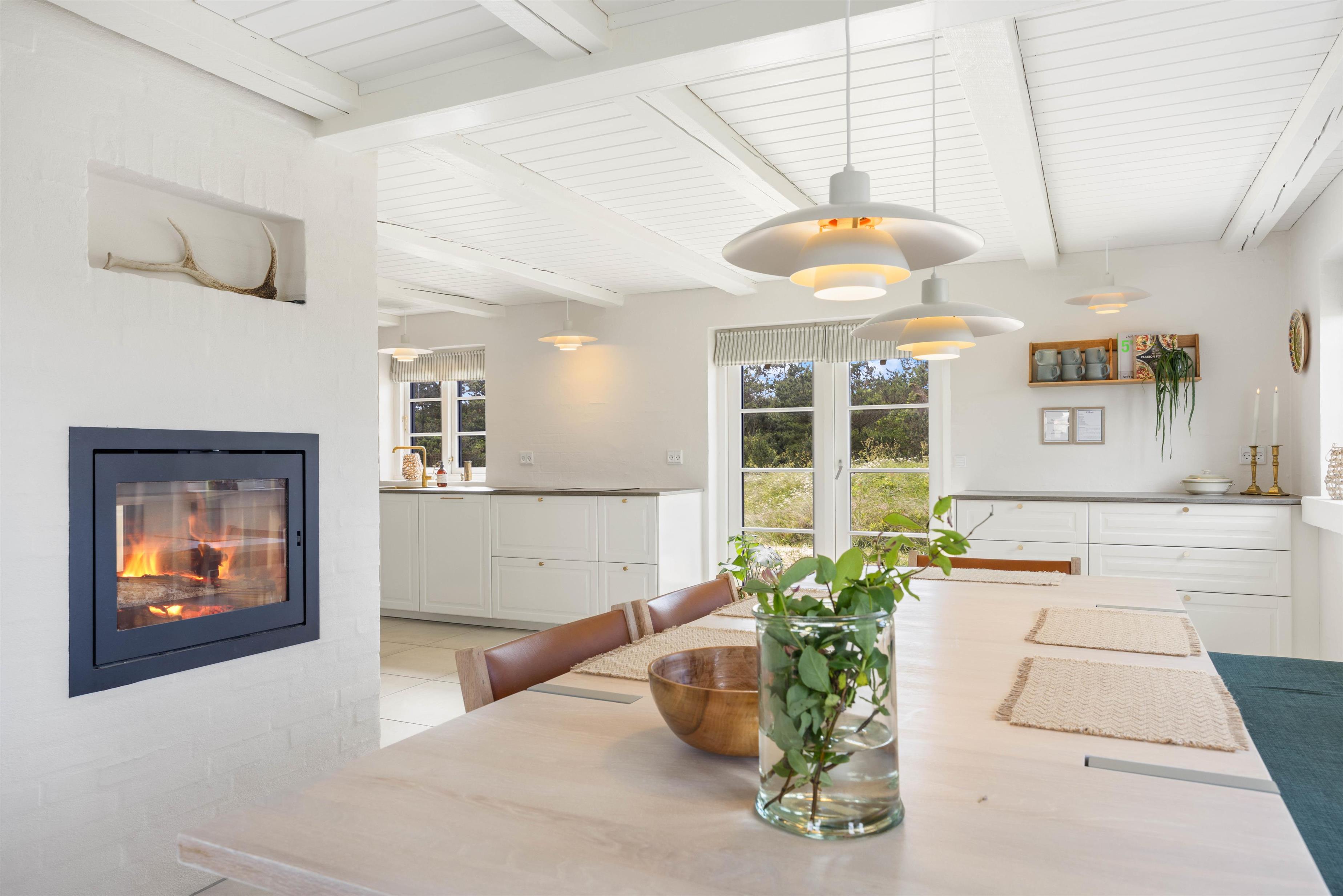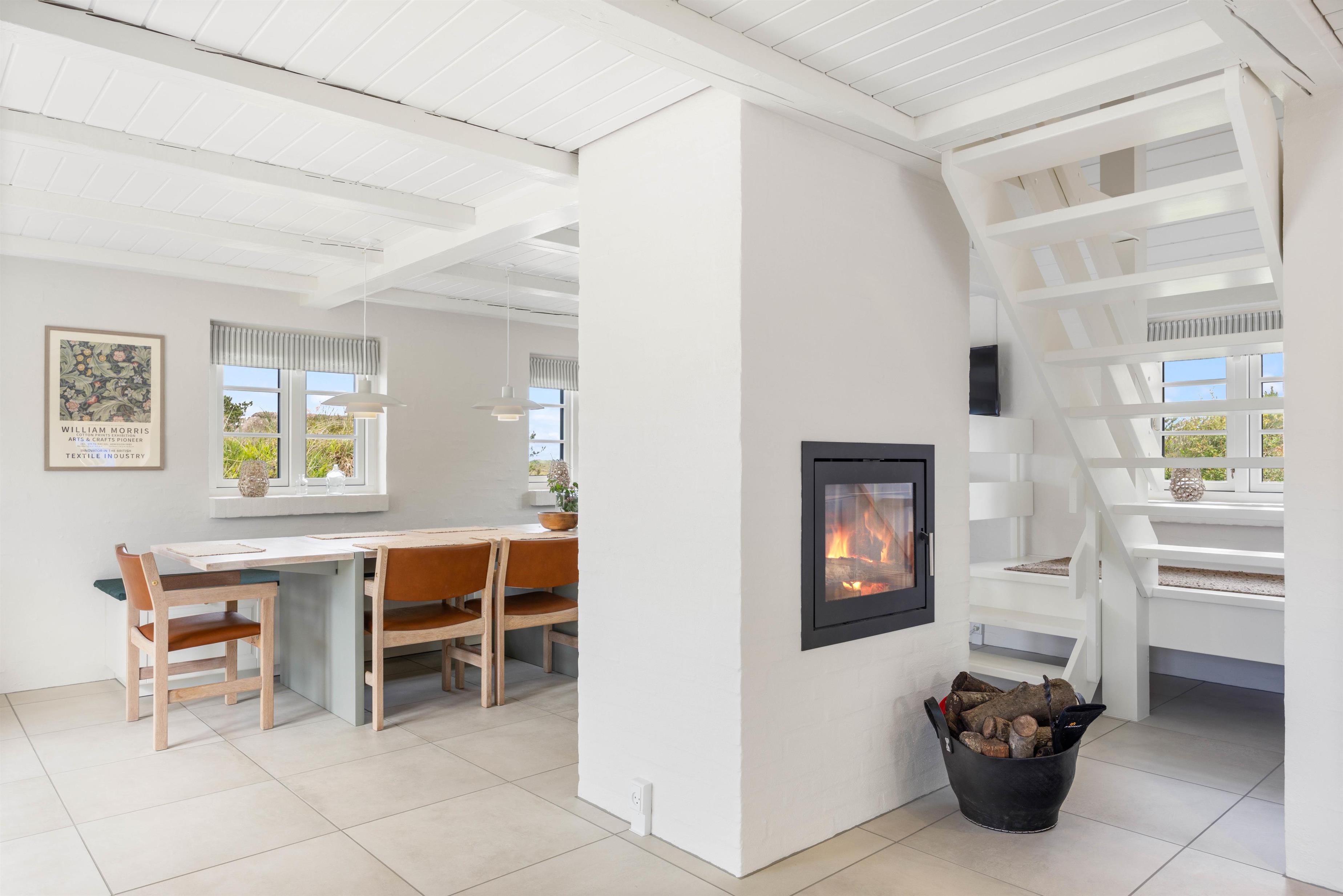 Sommerhuset i 2 plan på Redningsvejen 91 er moderne indrettet med sans for detaljerne. I den praktiske entré er der god plads til sko og jakker. Det åbne plan med køkken/alrum og spiseplads adskilles af en brændeovn, hvor man ser ilden fra 2 sider, og der er gulvvarme i klinkegulvet. Som resten af sommerhuset er det smagfuldt indrettet i nordisk stil.