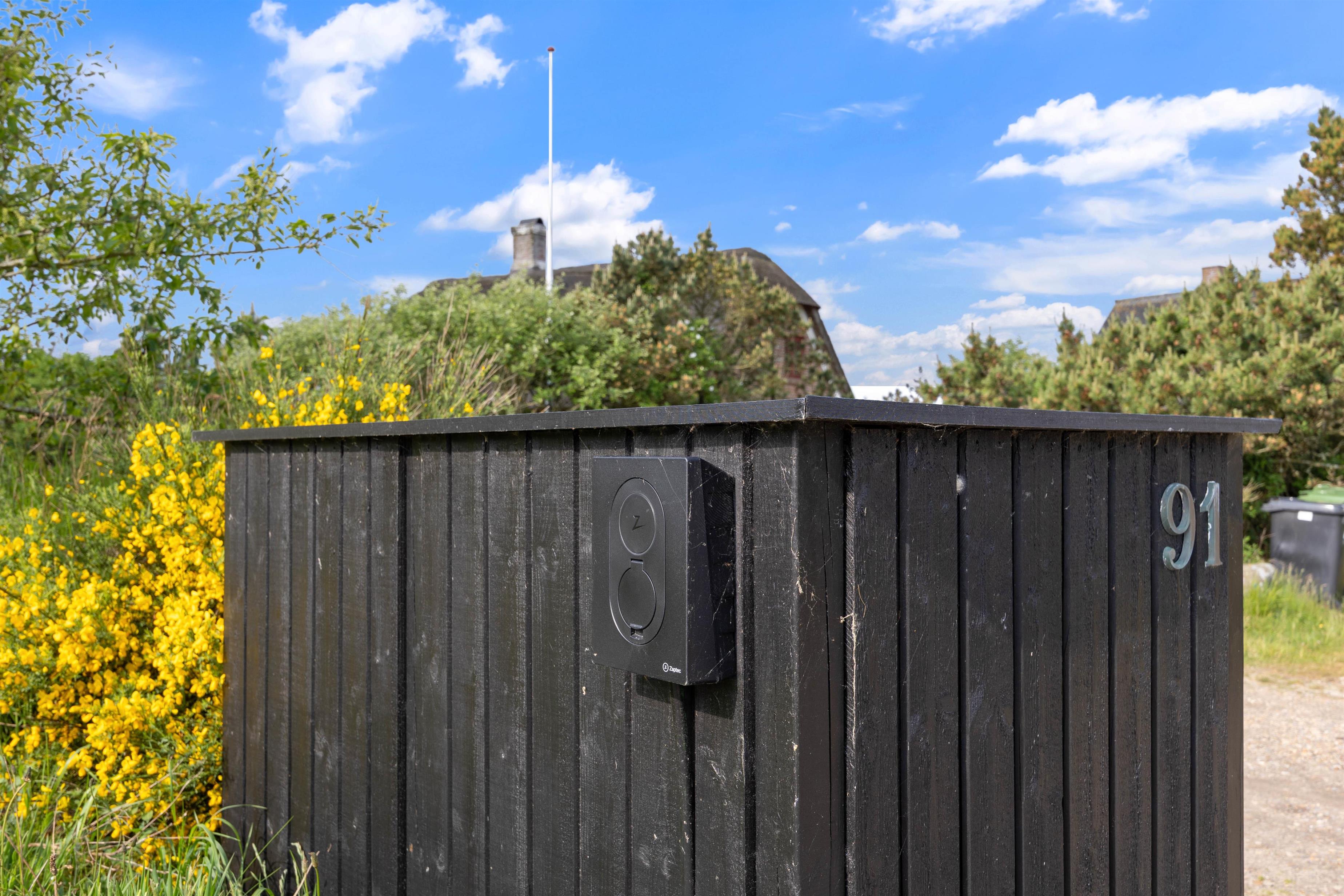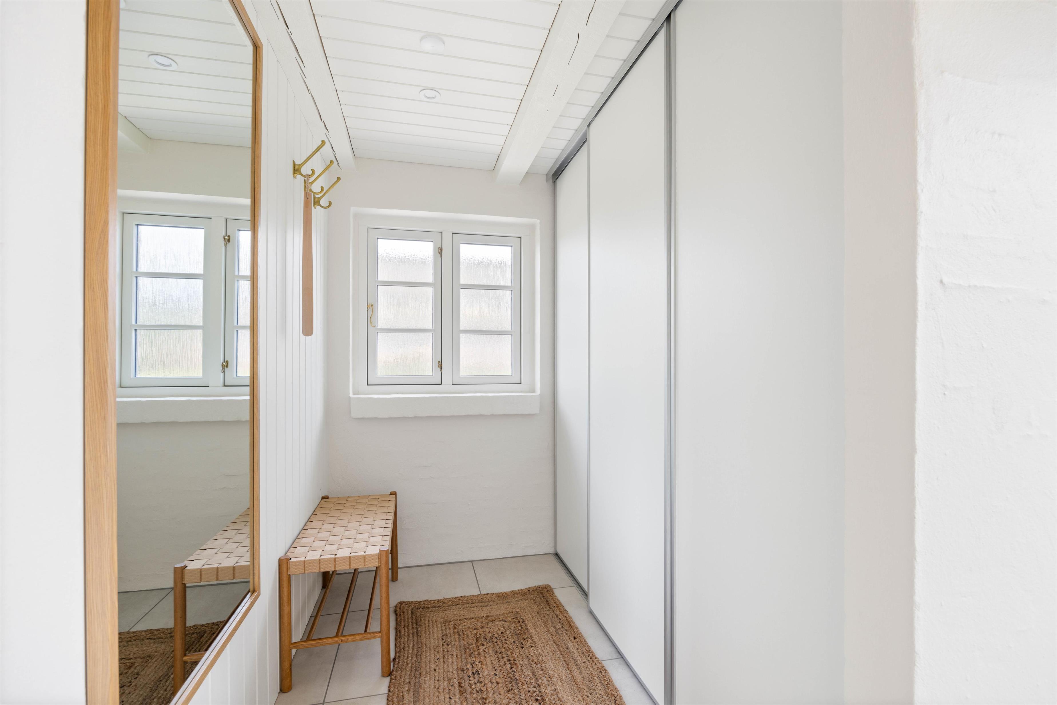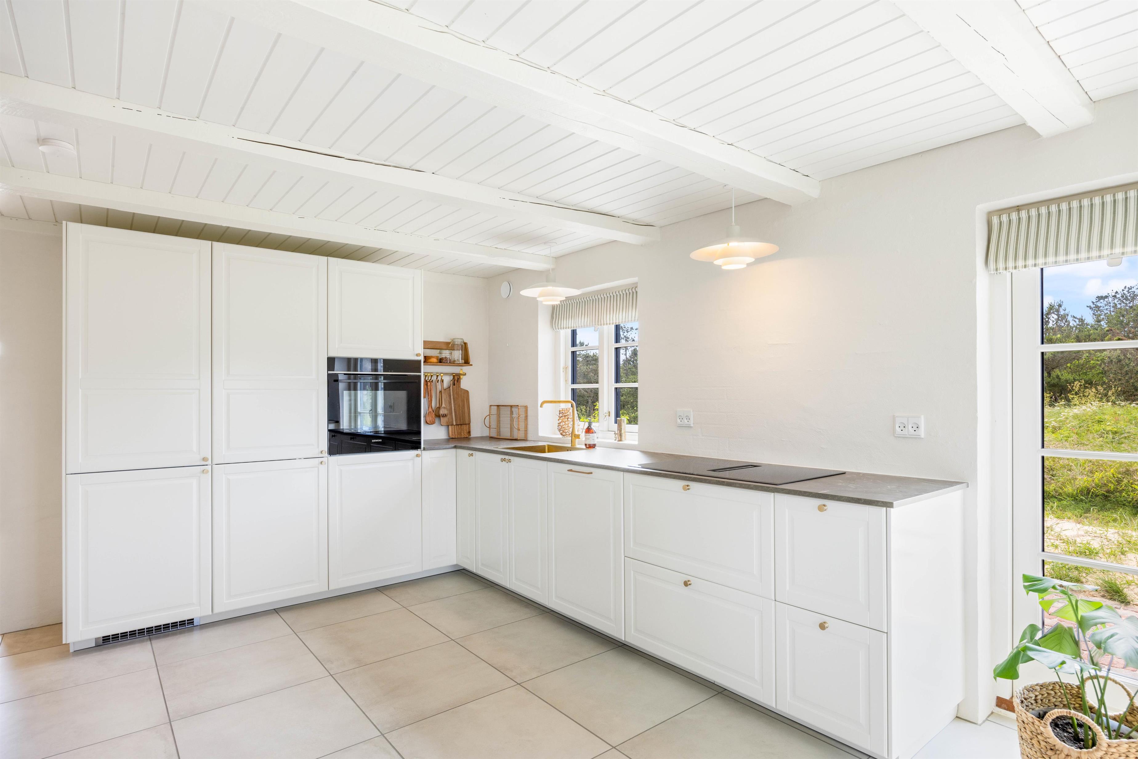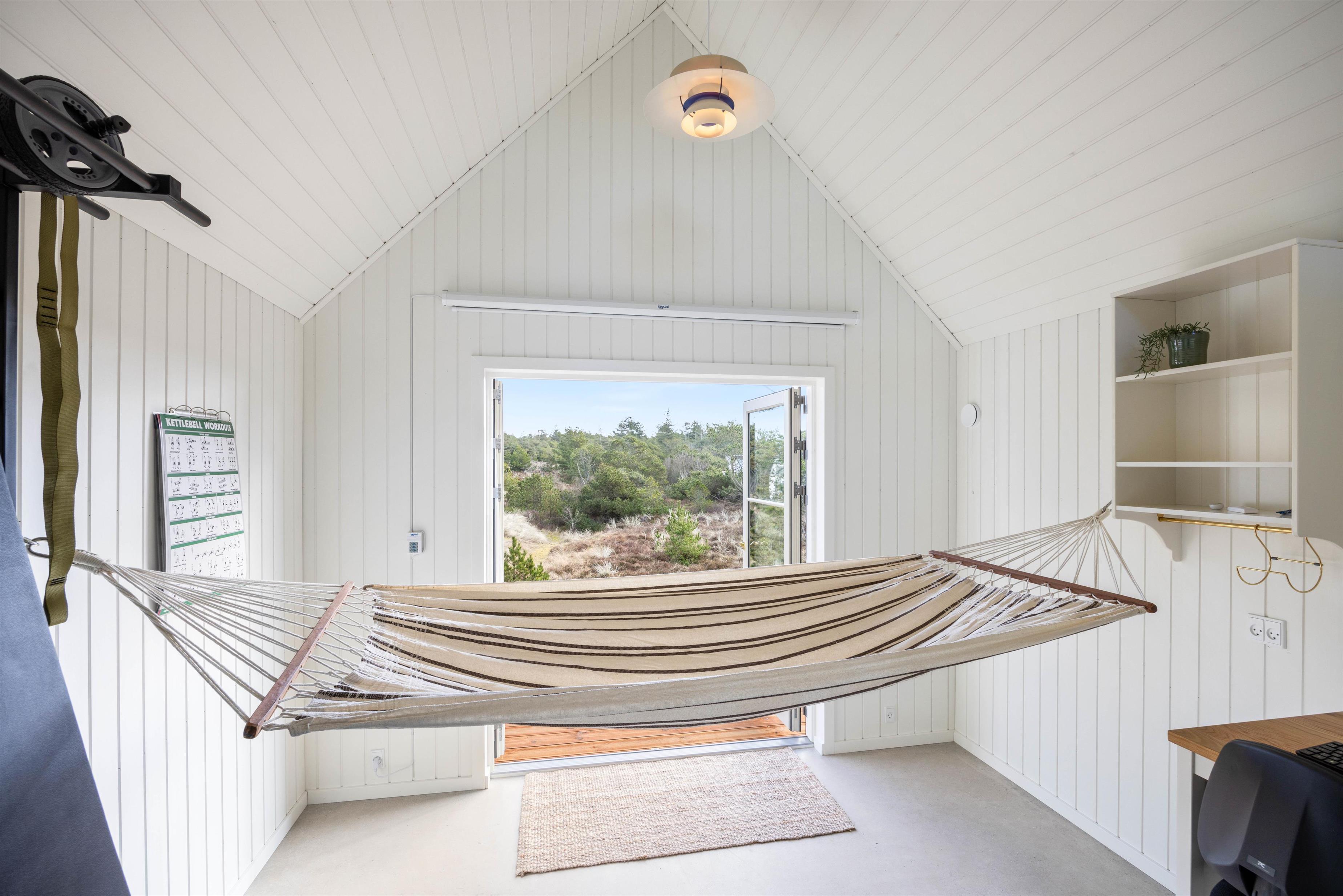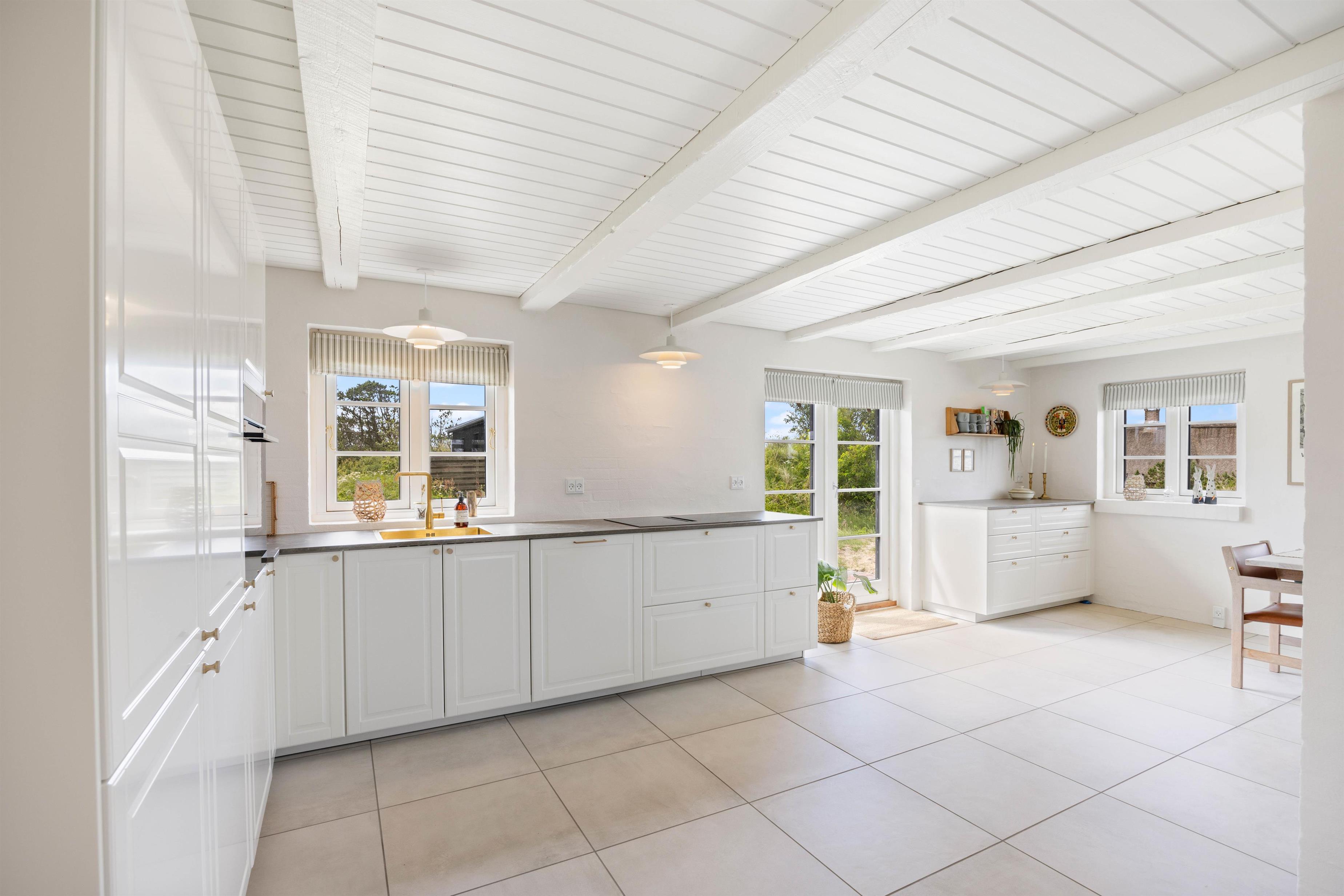 Sommerhuset i 2 plan på Redningsvejen 91 er moderne indrettet med sans for detaljerne. I den praktiske entré er der god plads til sko og jakker. Det åbne plan med køkken/alrum og spiseplads adskilles af en brændeovn, hvor man ser ilden fra 2 sider, og der er gulvvarme i klinkegulvet. Som resten af sommerhuset er det smagfuldt indrettet i nordisk stil.