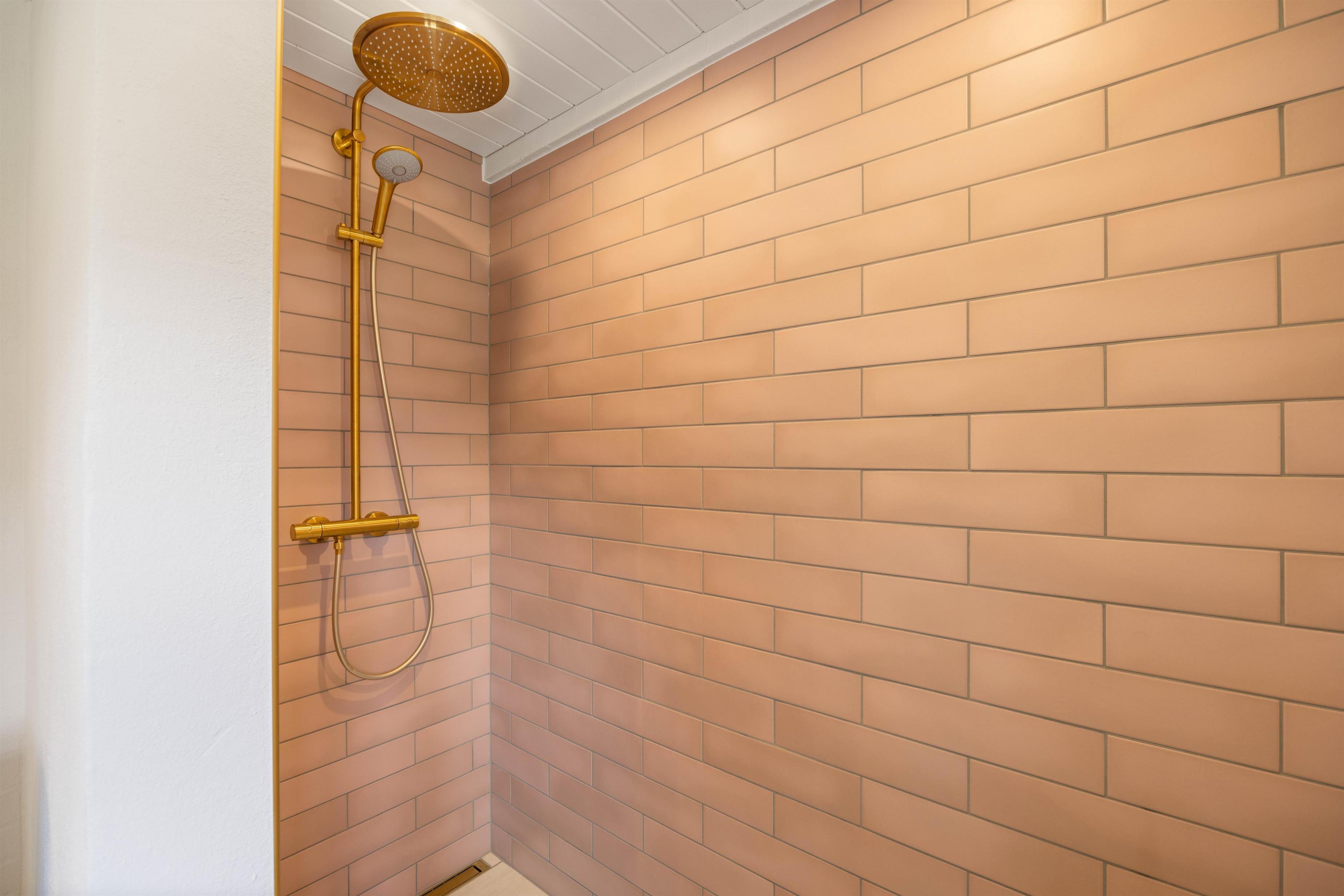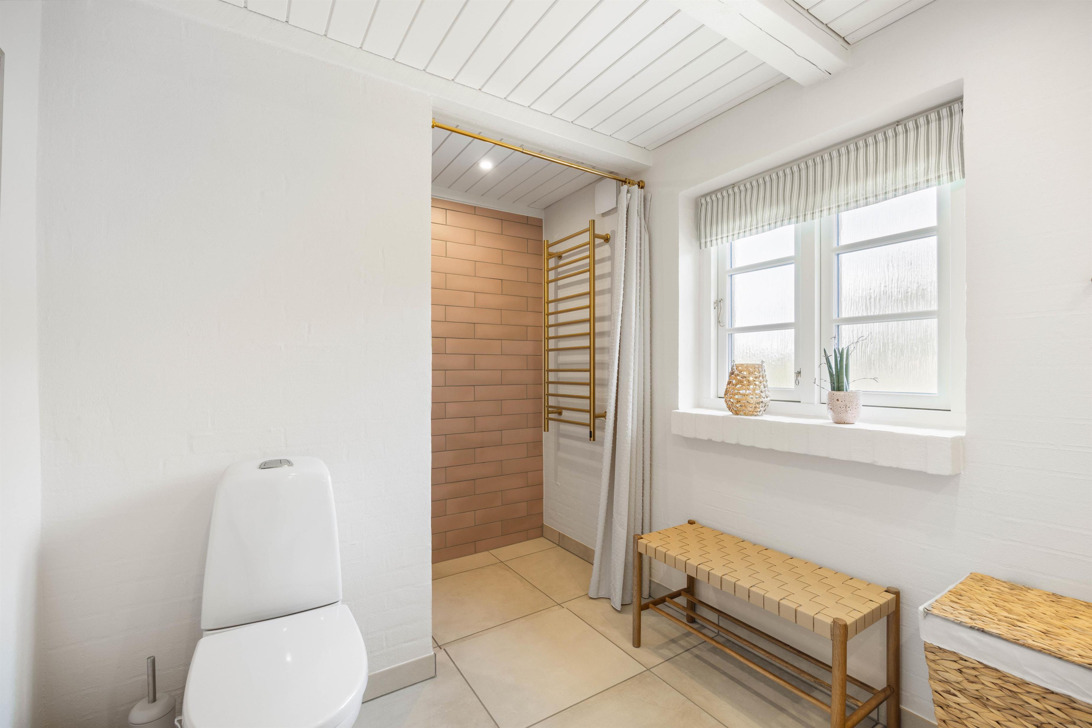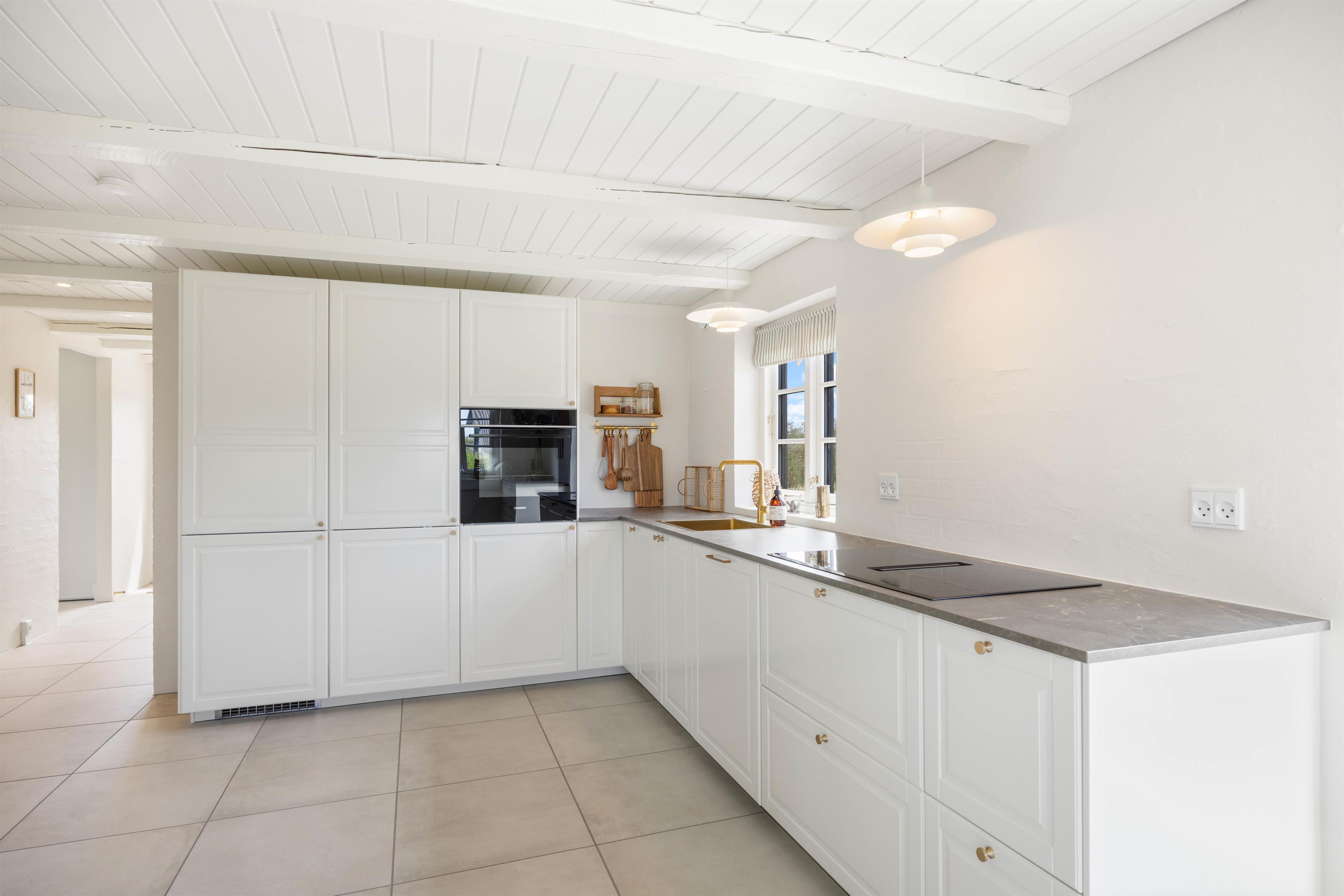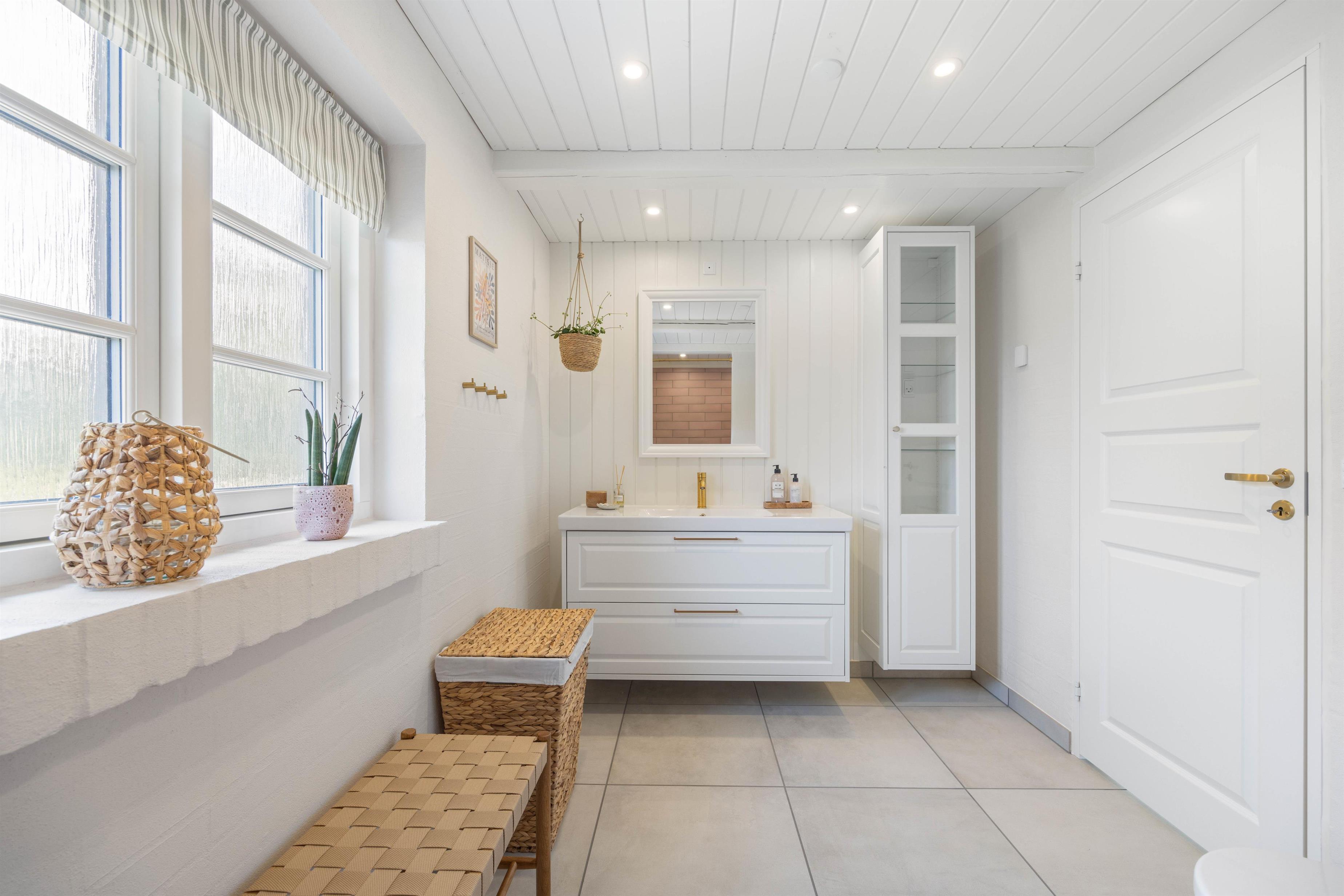 I det rummelige spiseområde spreder brændeovnen på køligere dage en behagelig varme og hyggelig stemning. Køkkenet i landlig stil er fuldt udstyret og har moderne hvidevarer som opvaskemaskine, mikrobølgeovn og induktionskomfur. Det flotte badeværelse med dagslys byder på en moderne bruser samt gulvvarme.