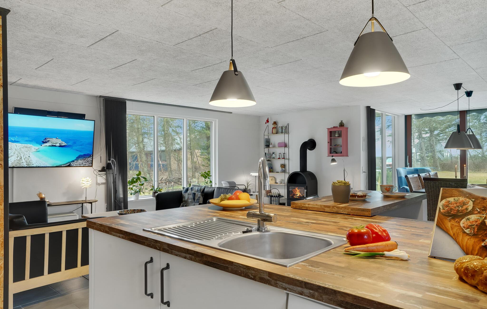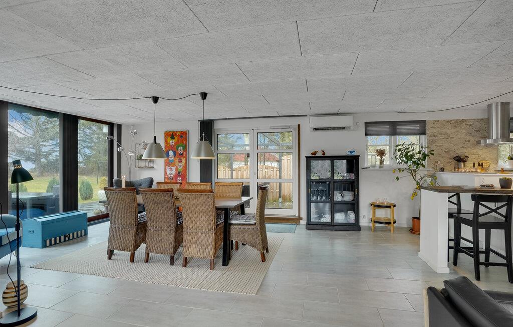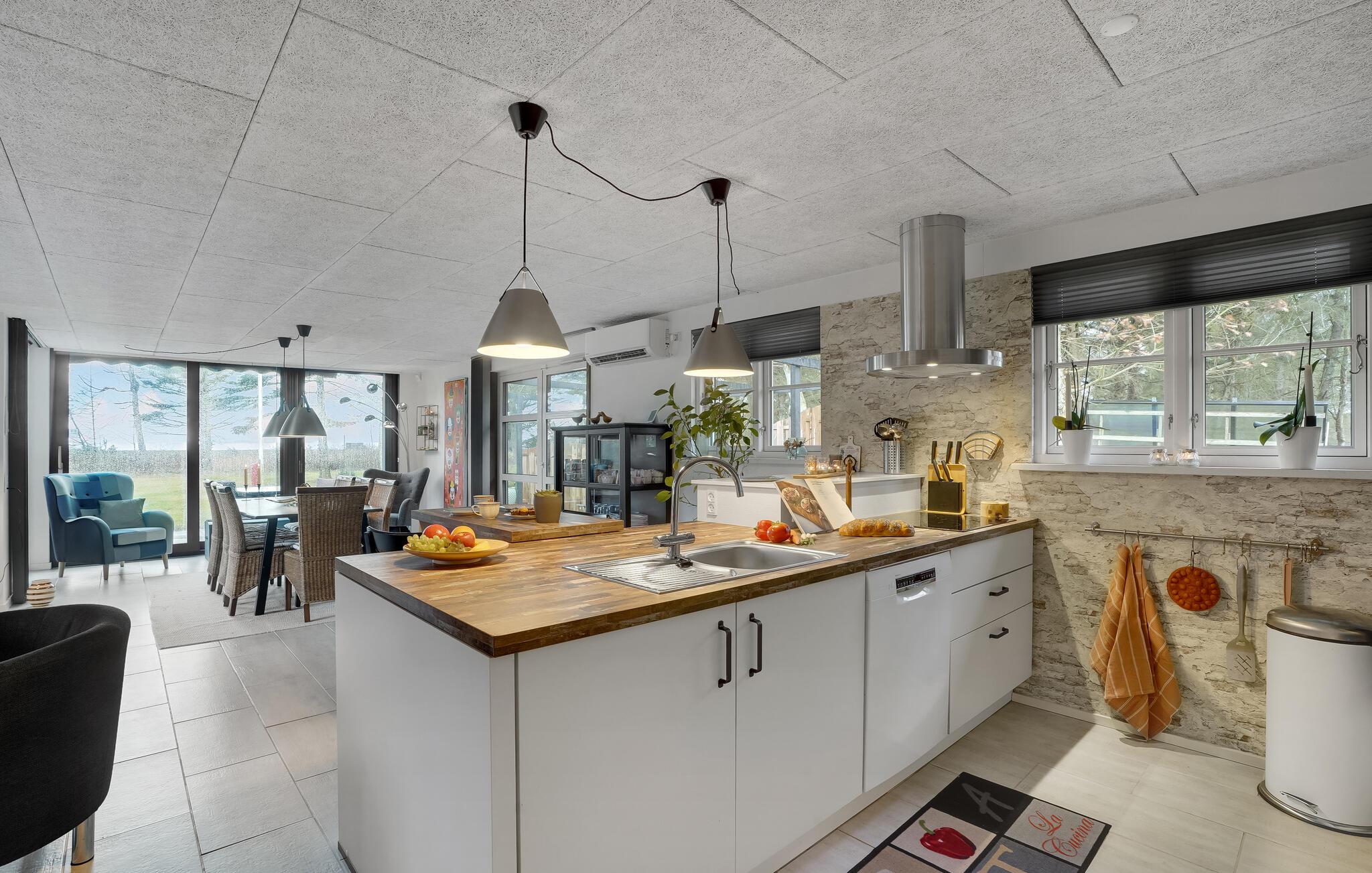 Velkommen til et helt igennem dejligt hus, som kommer til at danne en fantastisk ramme om jeres feriedage. Det åbne opholdsrum har gulv til loft-vinduer, som bader lokalet i naturligt lys. Her får I et rart sted at slappe af sammen efter en lang dag på farten. Sæt jer med brætspil eller kort, læn jer tilbage i sofaerne og sæt en god film på. Køkkenet er stort og veludstyret, så I kan give jer god tid til madlavningen og hygge jer undervejs.