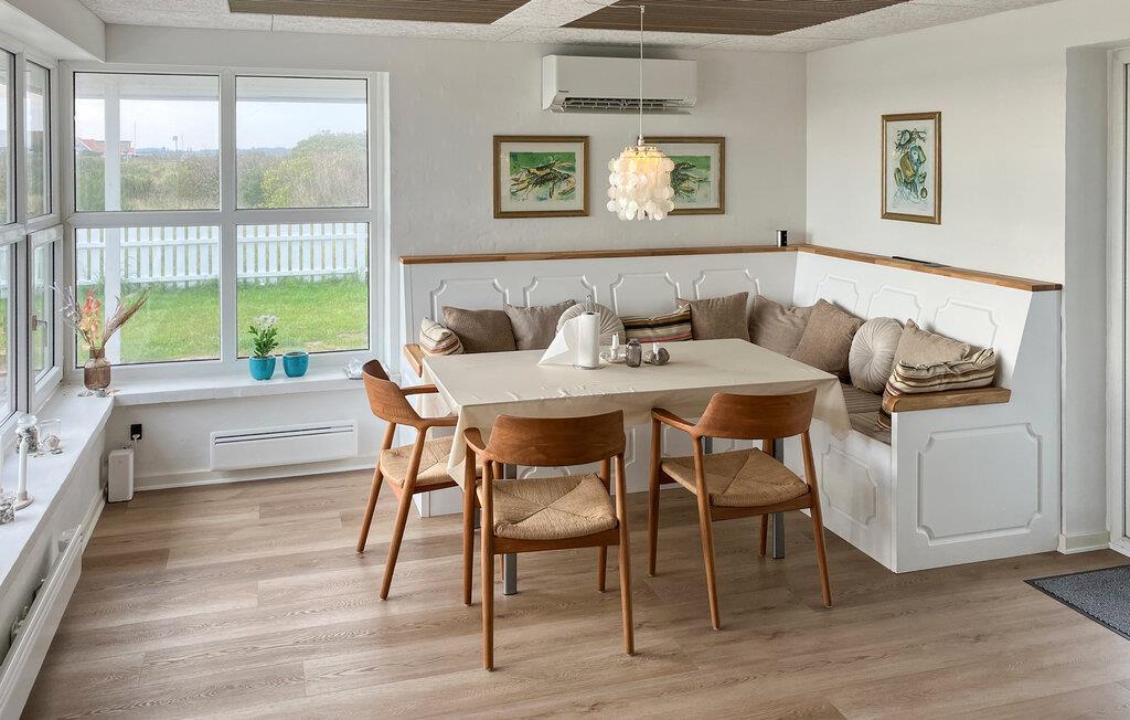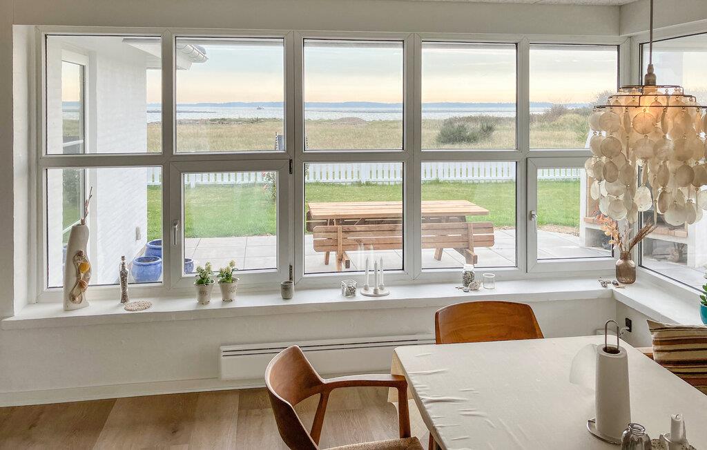I dette harmoniske fristed ved havet forenes hygge og enkel elegance. Gennem de store vinduer strækker udsigten sig over enge og klitter helt ud til det glitrende vand – et syn, der fortryller på alle tidspunkter af dagen. I den åbne opholdsstue skaber blide farver, naturlige materialer og pejsens varme glød en afslappende atmosfære. Uanset om I spiser morgenmad ved vinduet, læser på sofaen eller nyder en snak foran ilden om aftenen, føles hvert øjeblik helt rigtigt her.