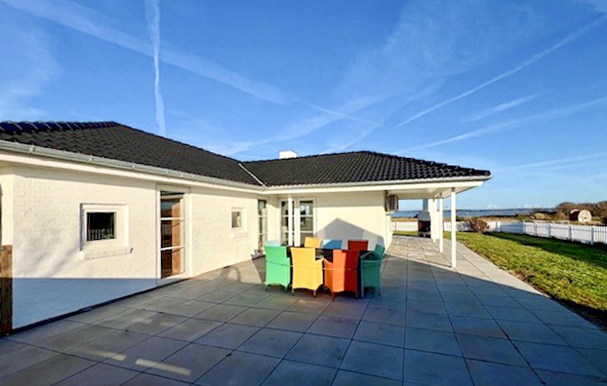 Skønt feriehus ved Oddesund Strand med pool, sauna og udsigt over fjorden.