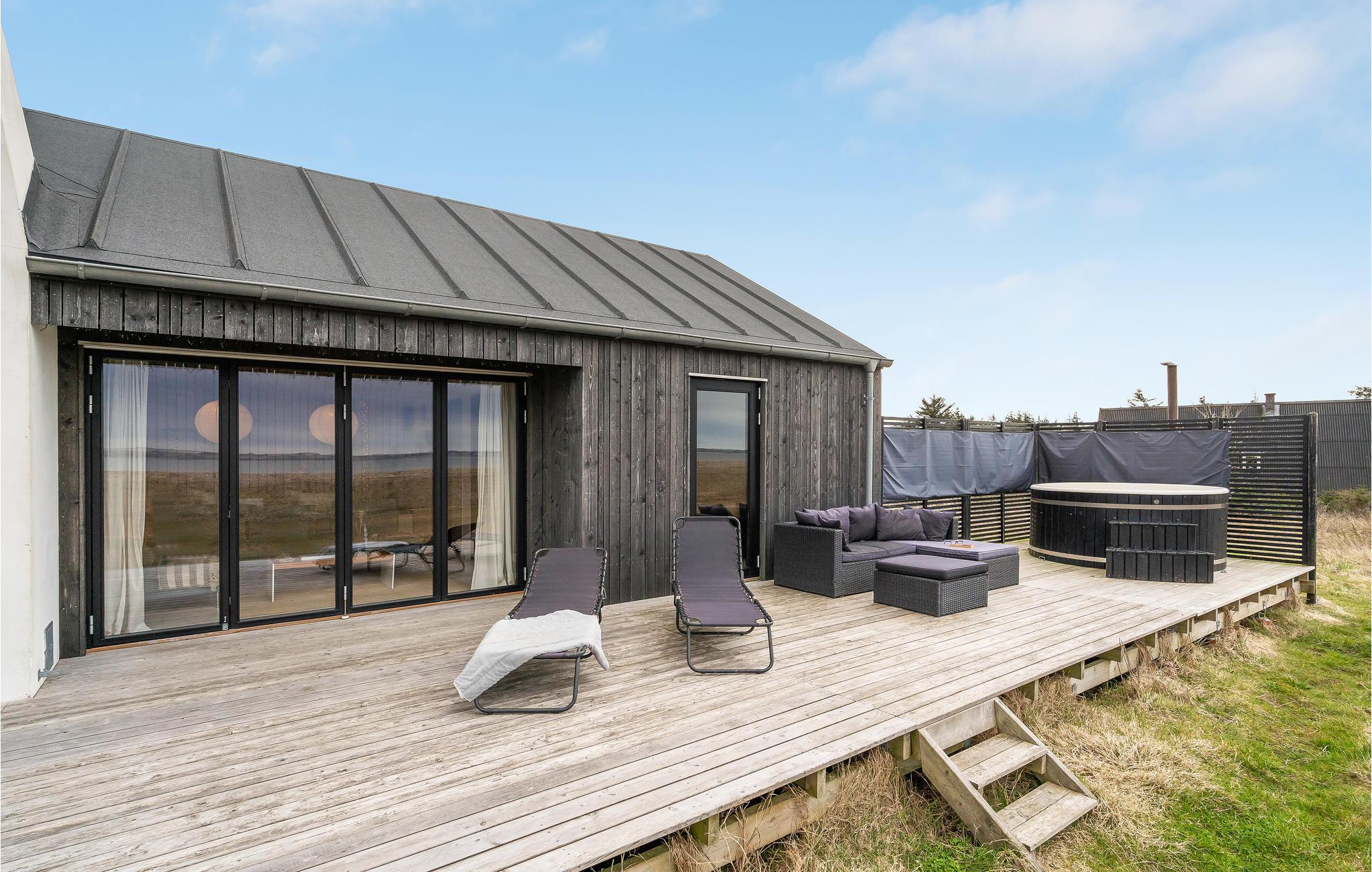 Herfra kan I også få adgang til den smukke træterrasse med havemøbler, som er ideel til lange aftener med et godt glas vin. Et højdepunkt er det finske træbad til 4 personer, hvor I kan slappe af med en kølig drink og udsigt over vandet. Foran huset er der en anden, overdækket terrasse.