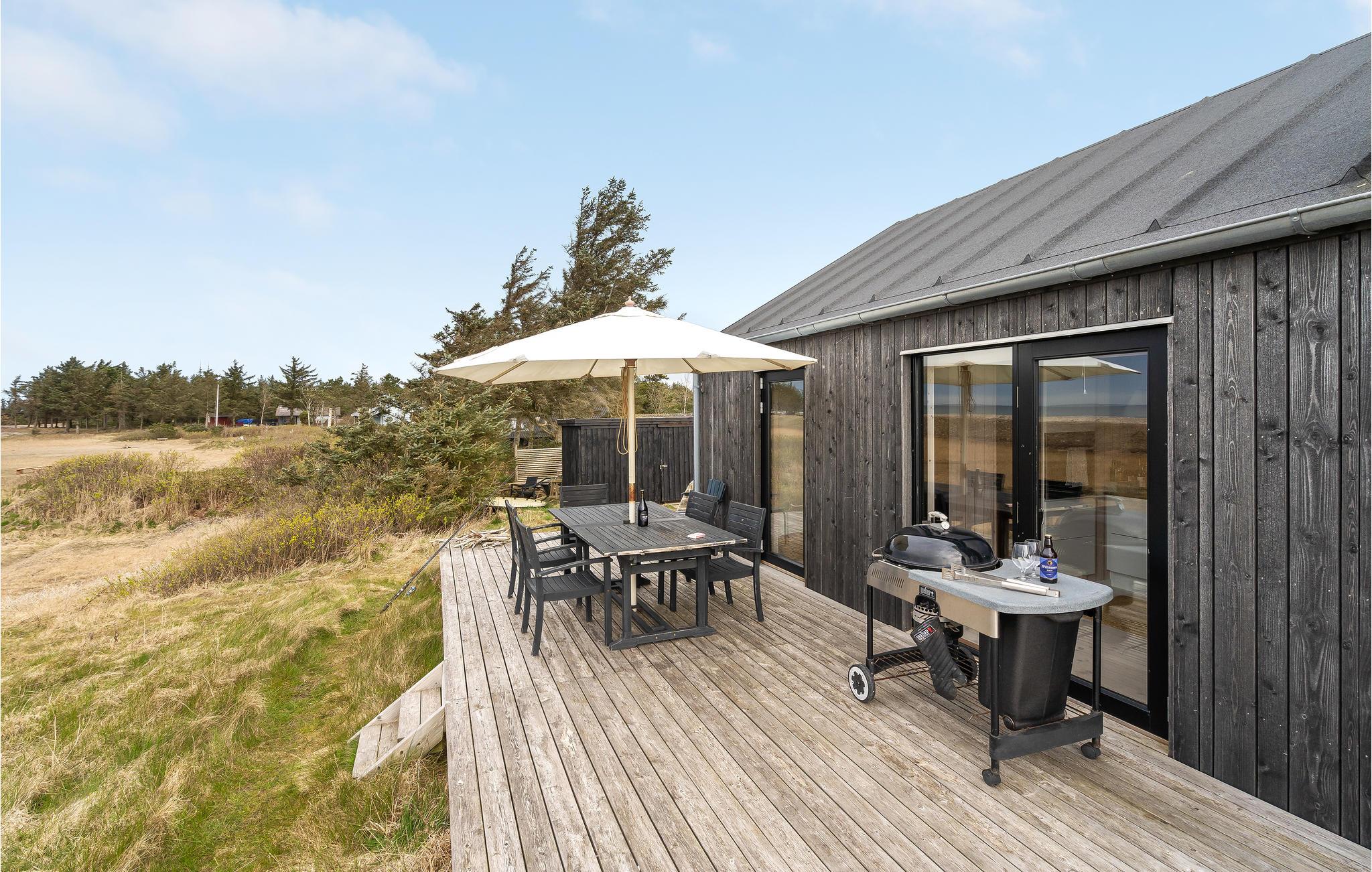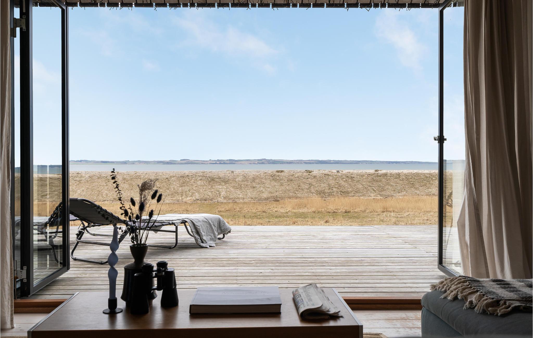 Dette stilfulde sommerhus venter jer i første række i klitterne, hvor I kan tilbringe en dejlig ferie med udendørs wellness og tæt på fjorden.