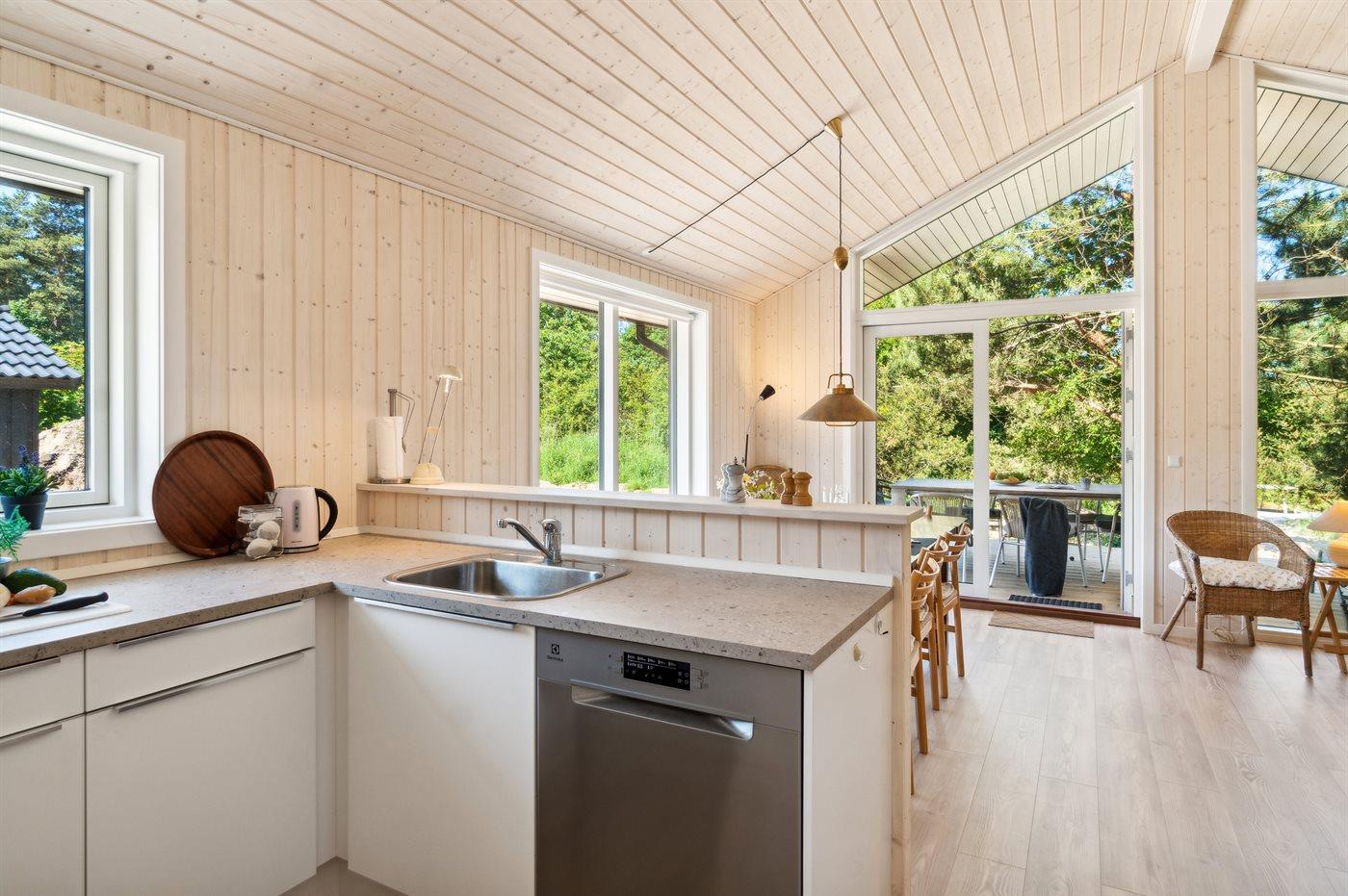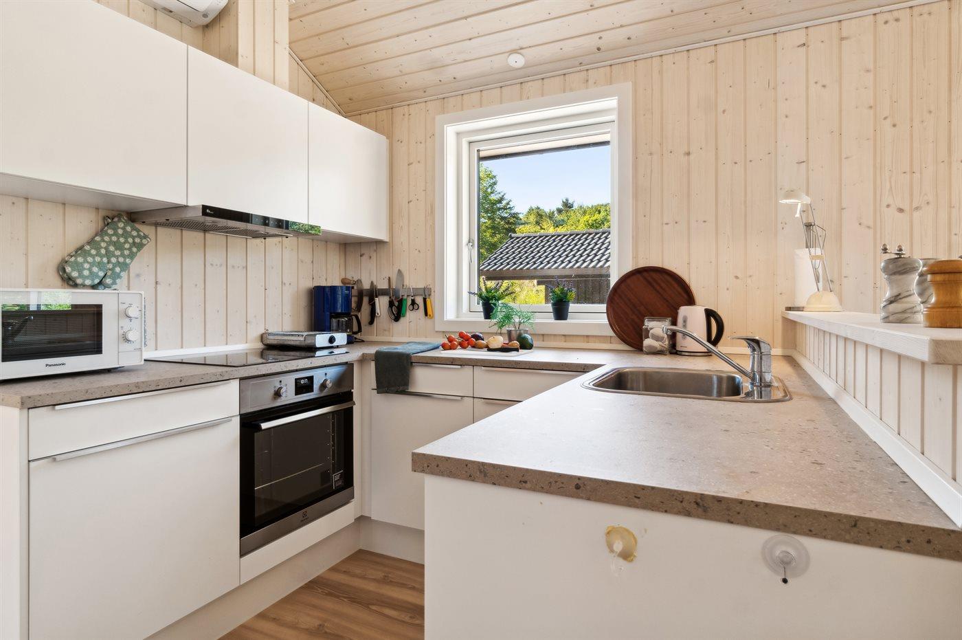 Køkkenet er udstyret med 1 køleskab. Der er 4 keramiske kogeplader, varmluftovn, mikrobølgeovn samt opvaskemaskine.