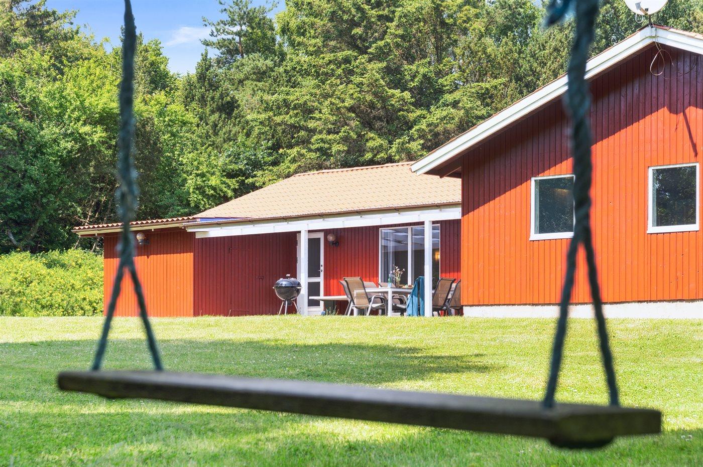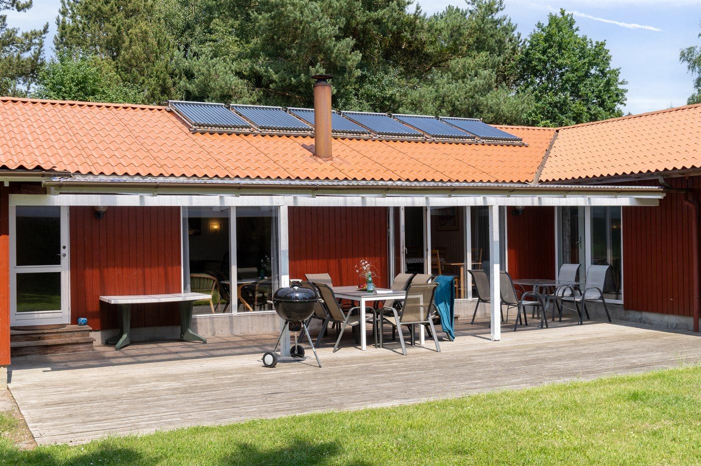 På den store grund er der rig mulighed for leg med børnene og på terrasserne kan solen og det gode vejr nydes. En del af terrasseområdet er overdækket.