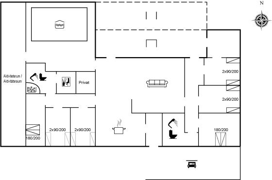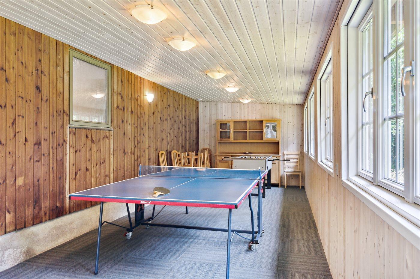 Huset indeholder et køkkenalrum med stuen grænsende op til. I det store aktivitetsrum med sofagruppe er der mulighed for at hygge sig med bordtennis, pool og dart.